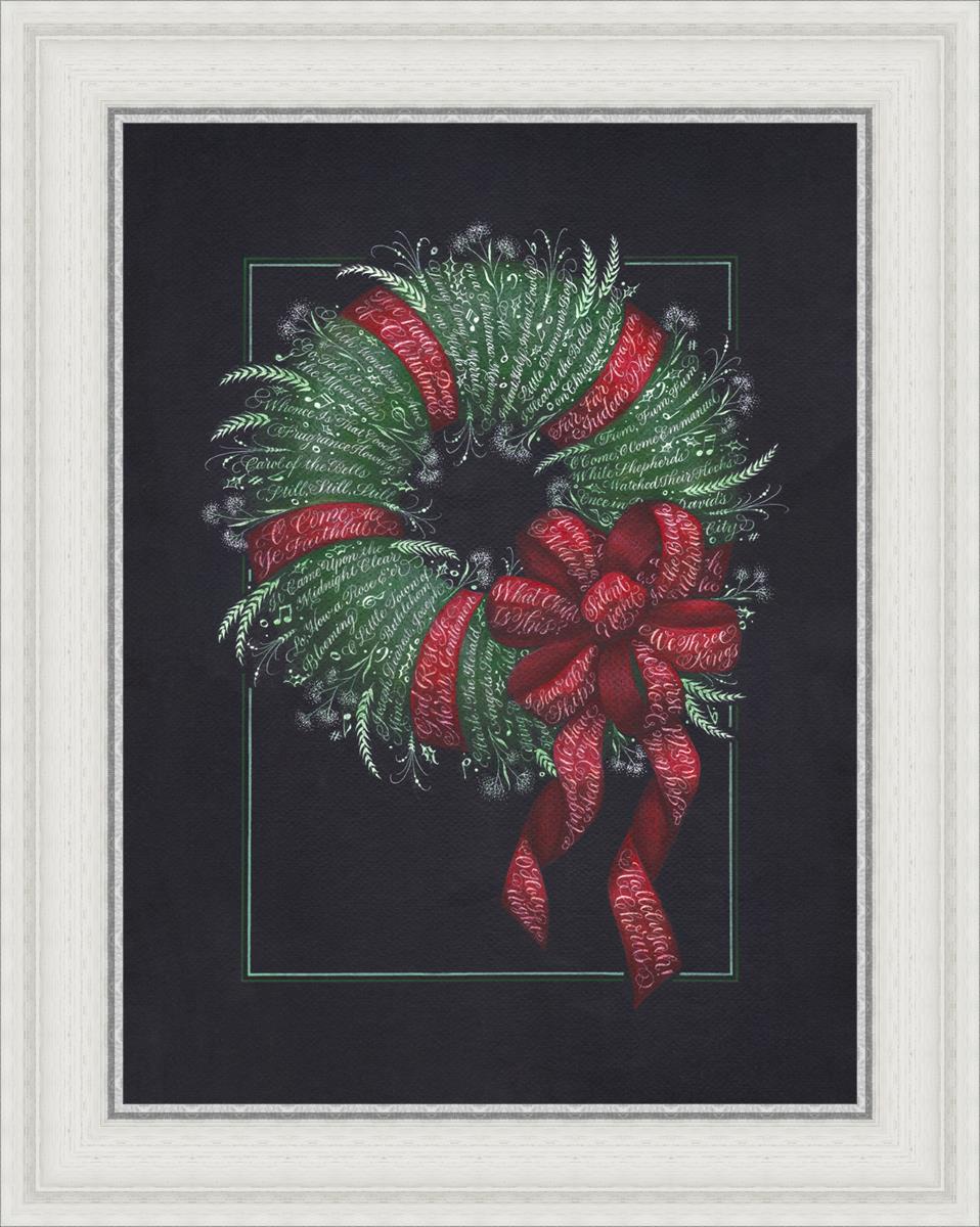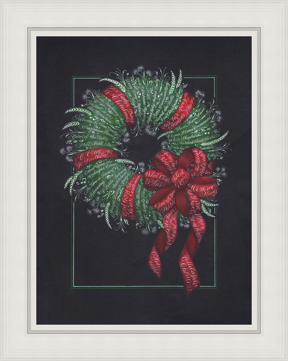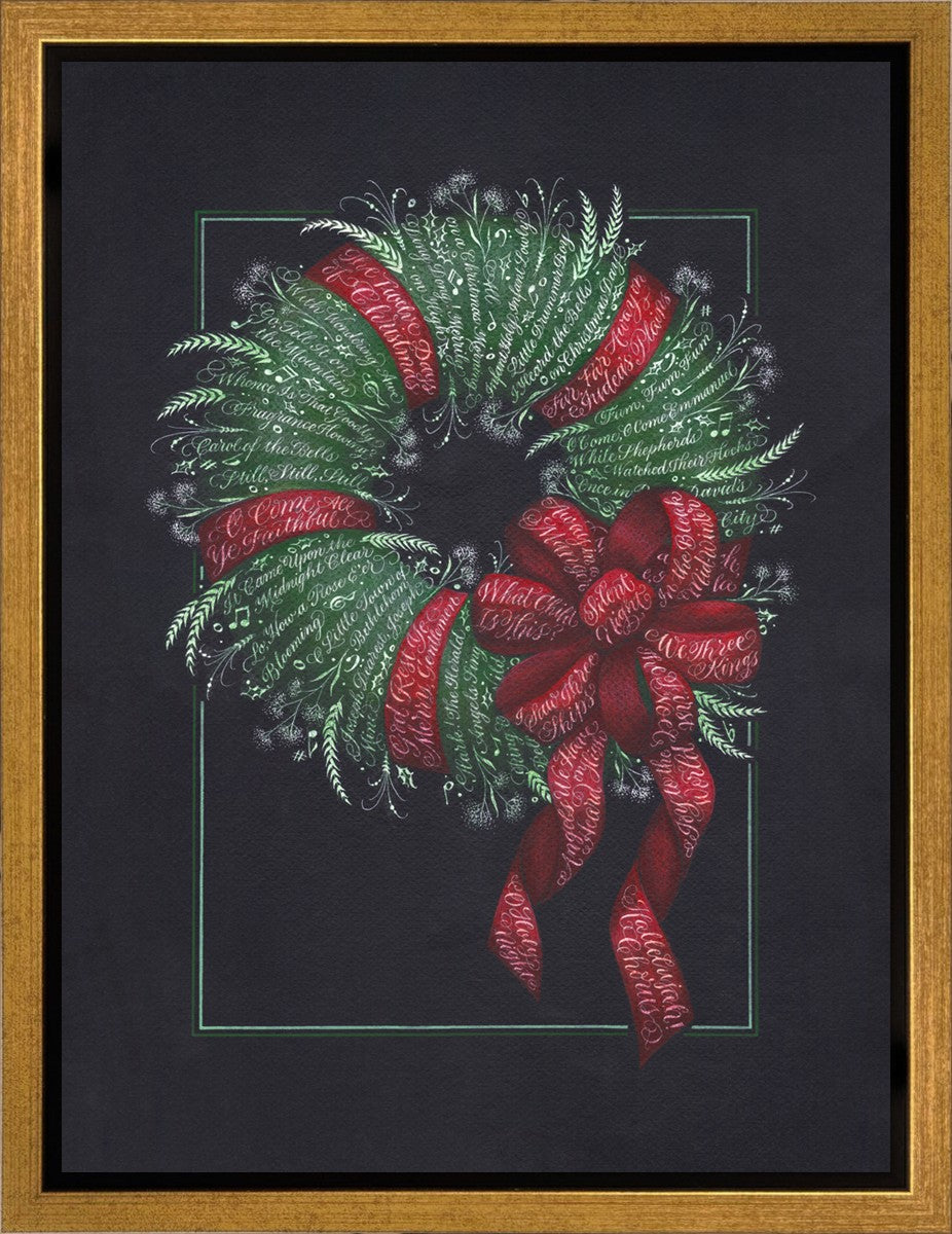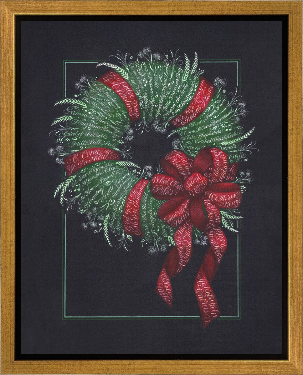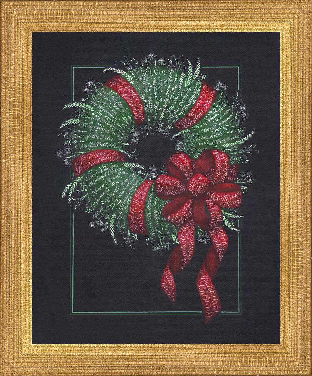 I was sketching during October General Conference, about the time of year I start thinking of Christmas things, and landed on the idea of wreaths made up of words. I love Christmas carols and wondered how many I could fit in a wreath. I began planning out the pattern by tying a bow from wired ribbon, lighting it, and drawing it so I could get the loops and turns correct. I began positioning titles into the ribbon spaces and then into the wreath.