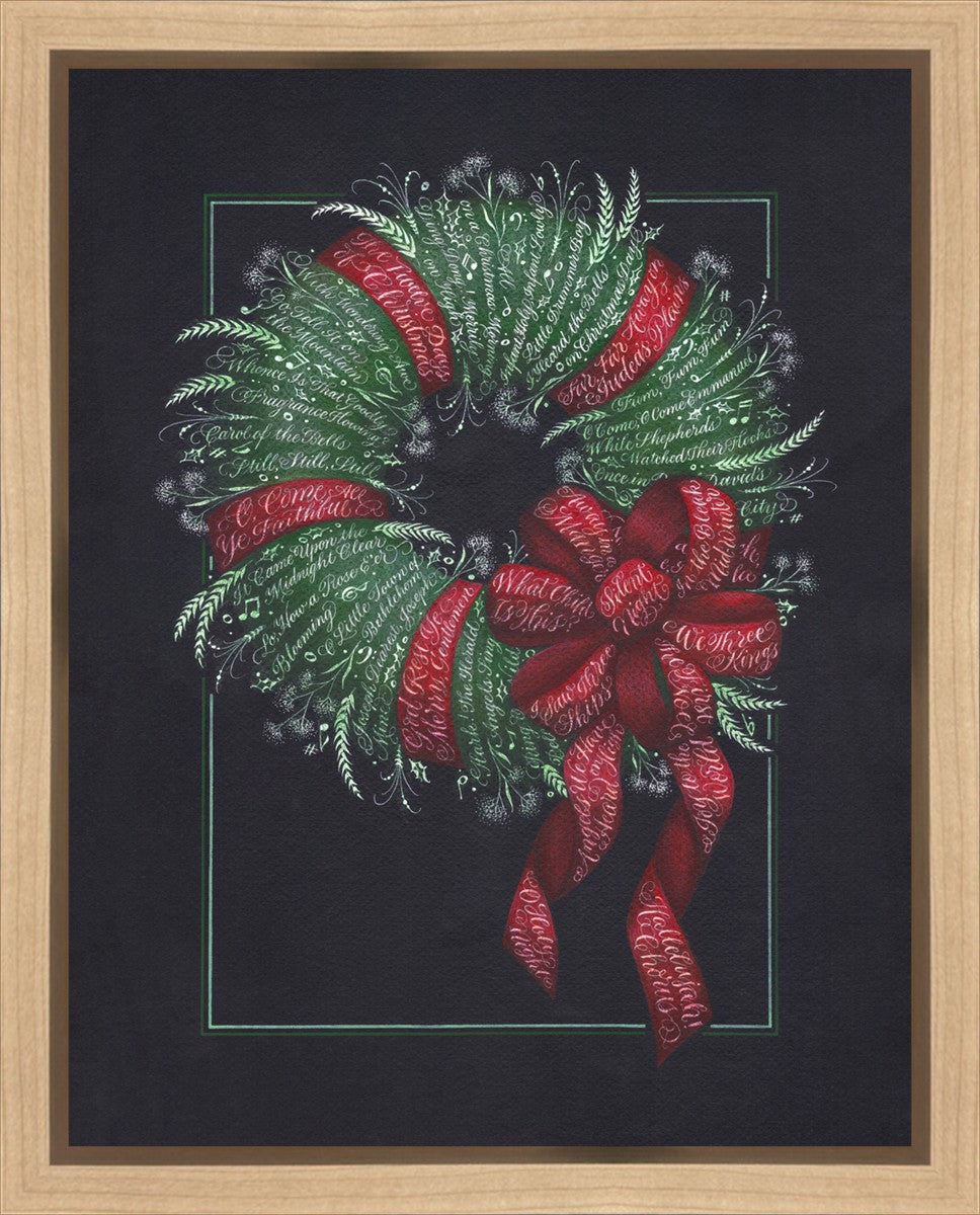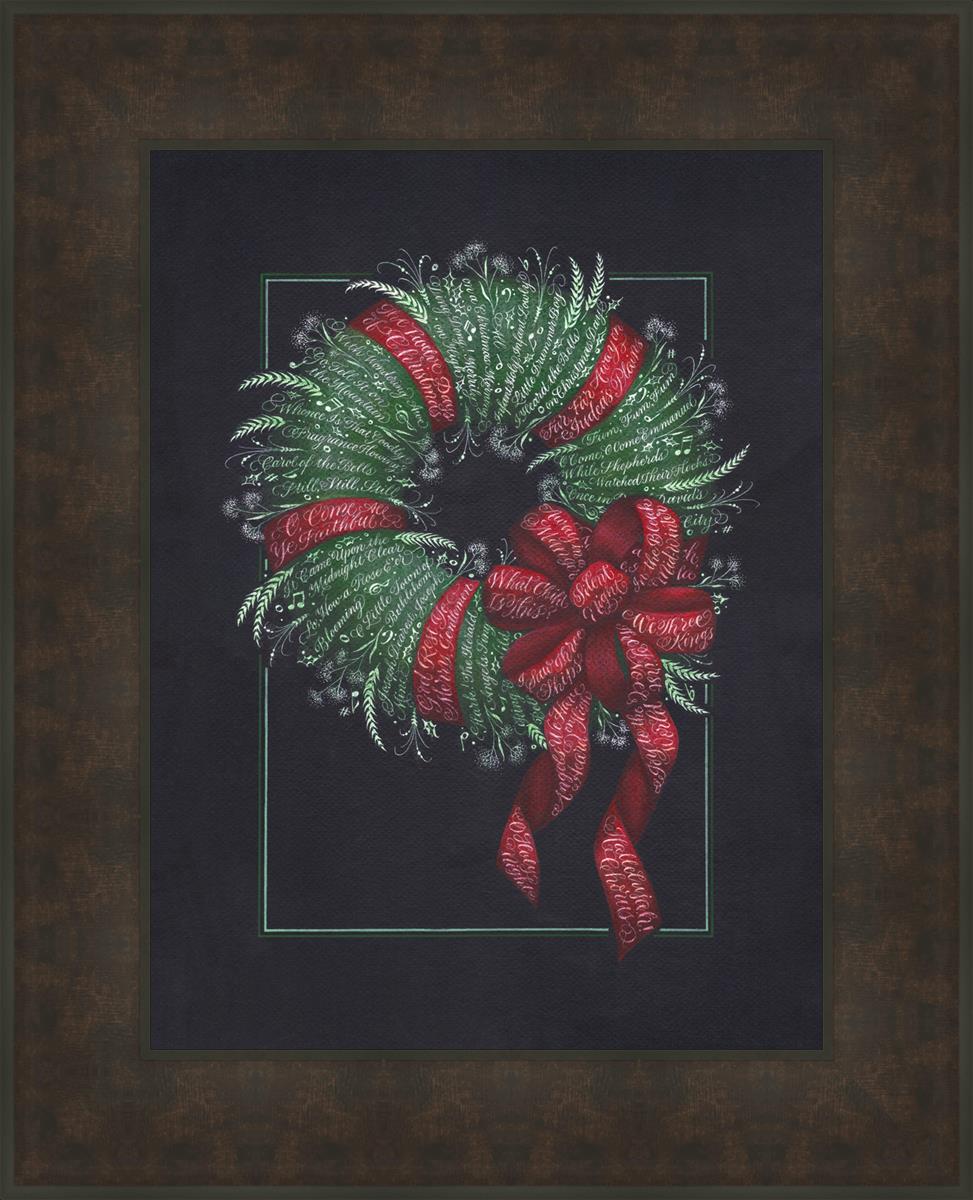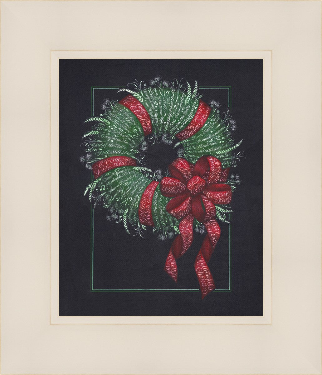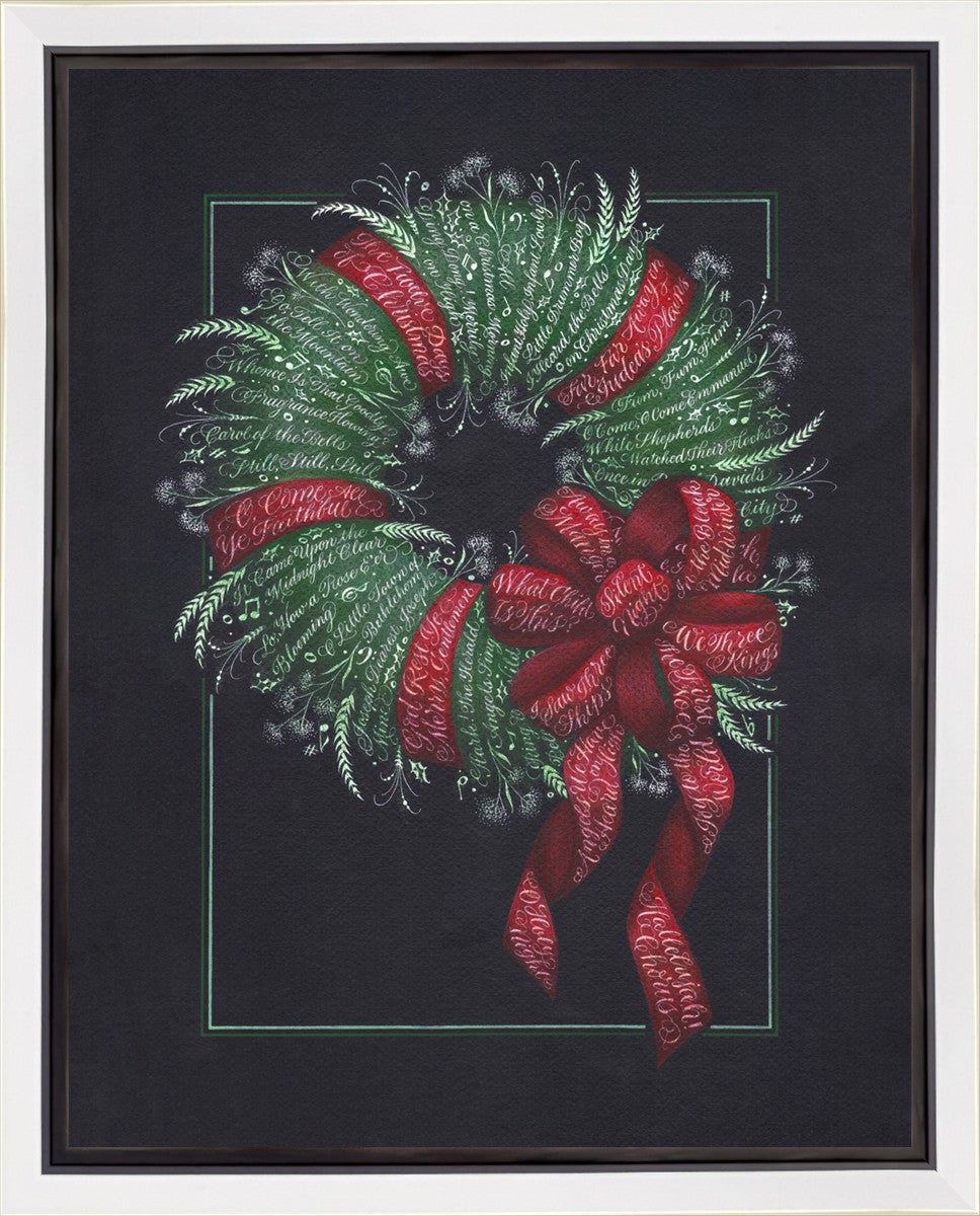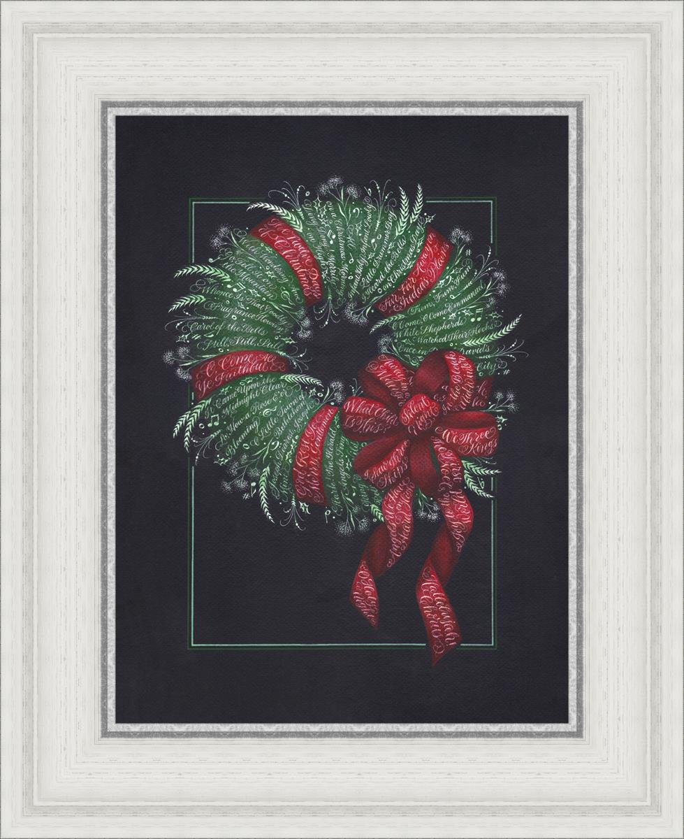 I was sketching during October General Conference, about the time of year I start thinking of Christmas things, and landed on the idea of wreaths made up of words. I love Christmas carols and wondered how many I could fit in a wreath. I began planning out the pattern by tying a bow from wired ribbon, lighting it, and drawing it so I could get the loops and turns correct. I began positioning titles into the ribbon spaces and then into the wreath.