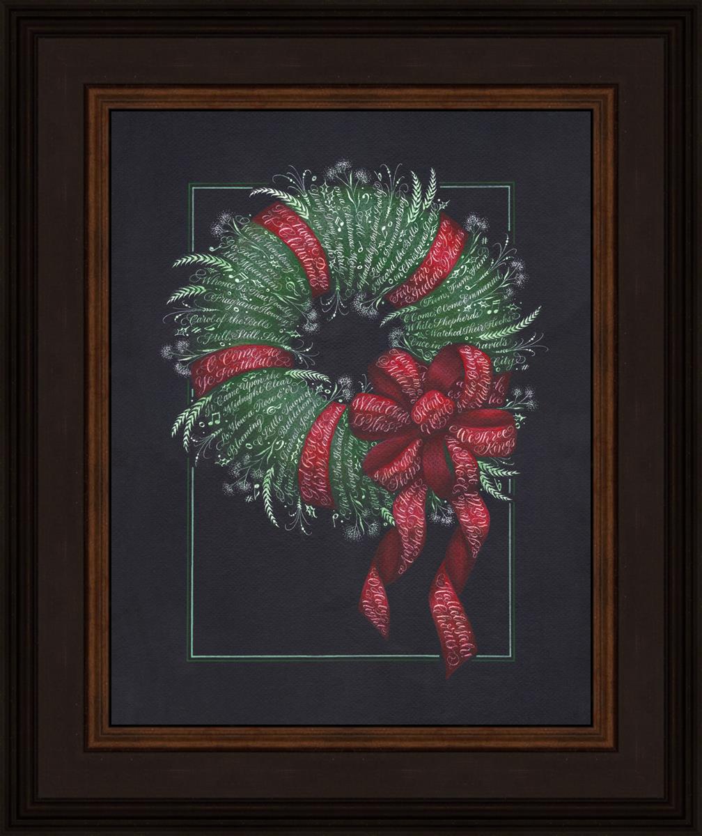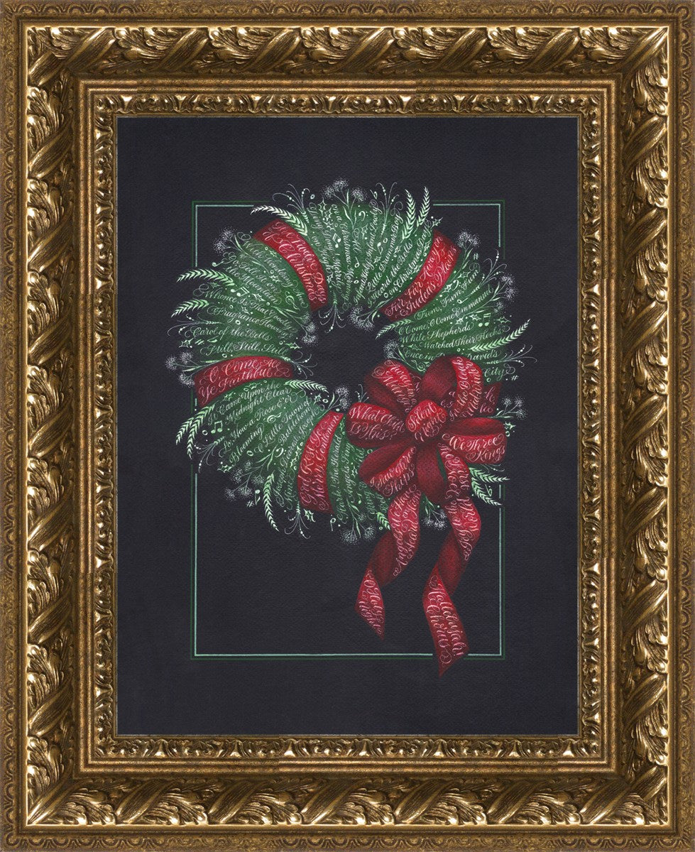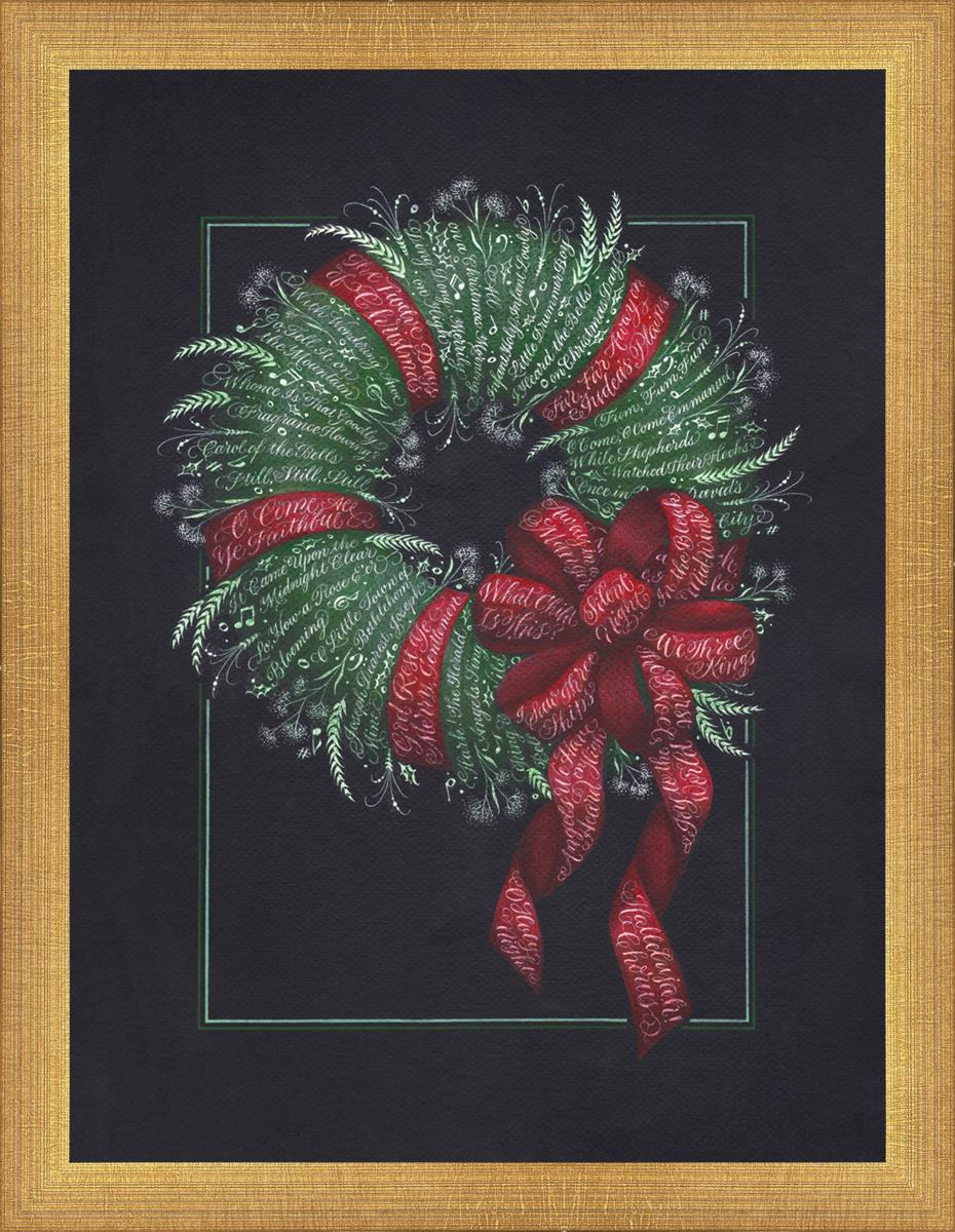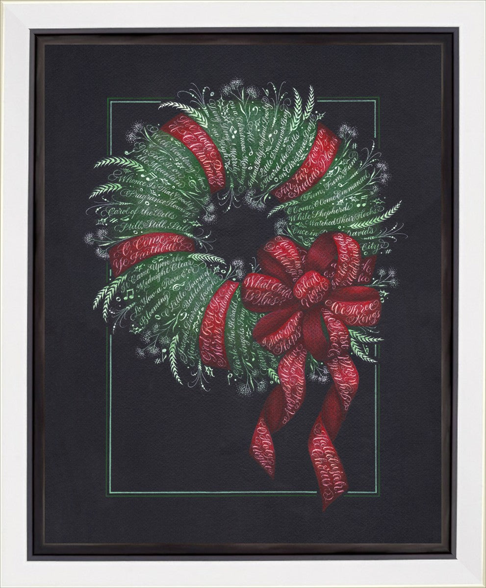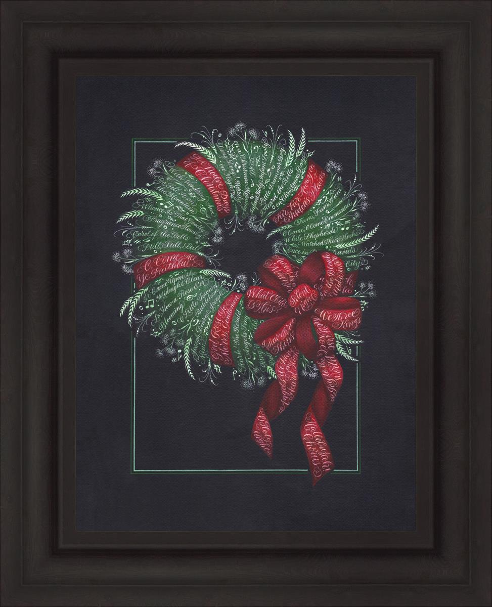 I was sketching during October General Conference, about the time of year I start thinking of Christmas things, and landed on the idea of wreaths made up of words. I love Christmas carols and wondered how many I could fit in a wreath. I began planning out the pattern by tying a bow from wired ribbon, lighting it, and drawing it so I could get the loops and turns correct. I began positioning titles into the ribbon spaces and then into the wreath.