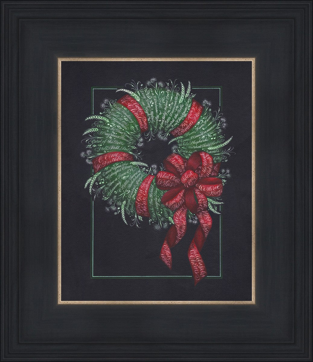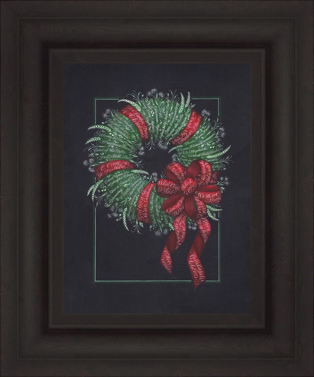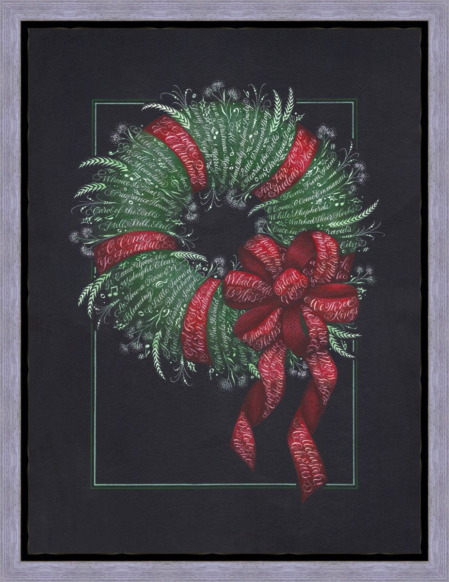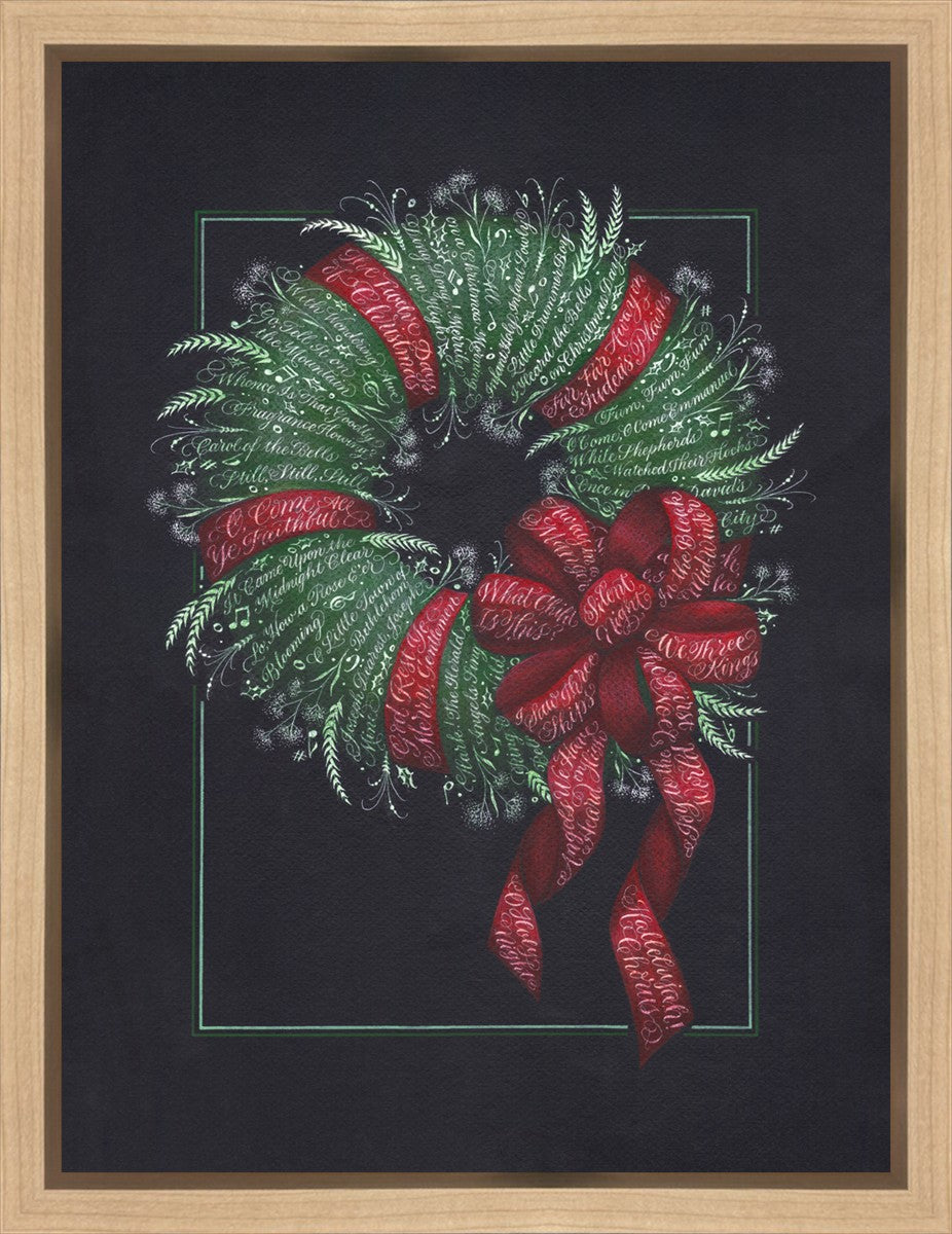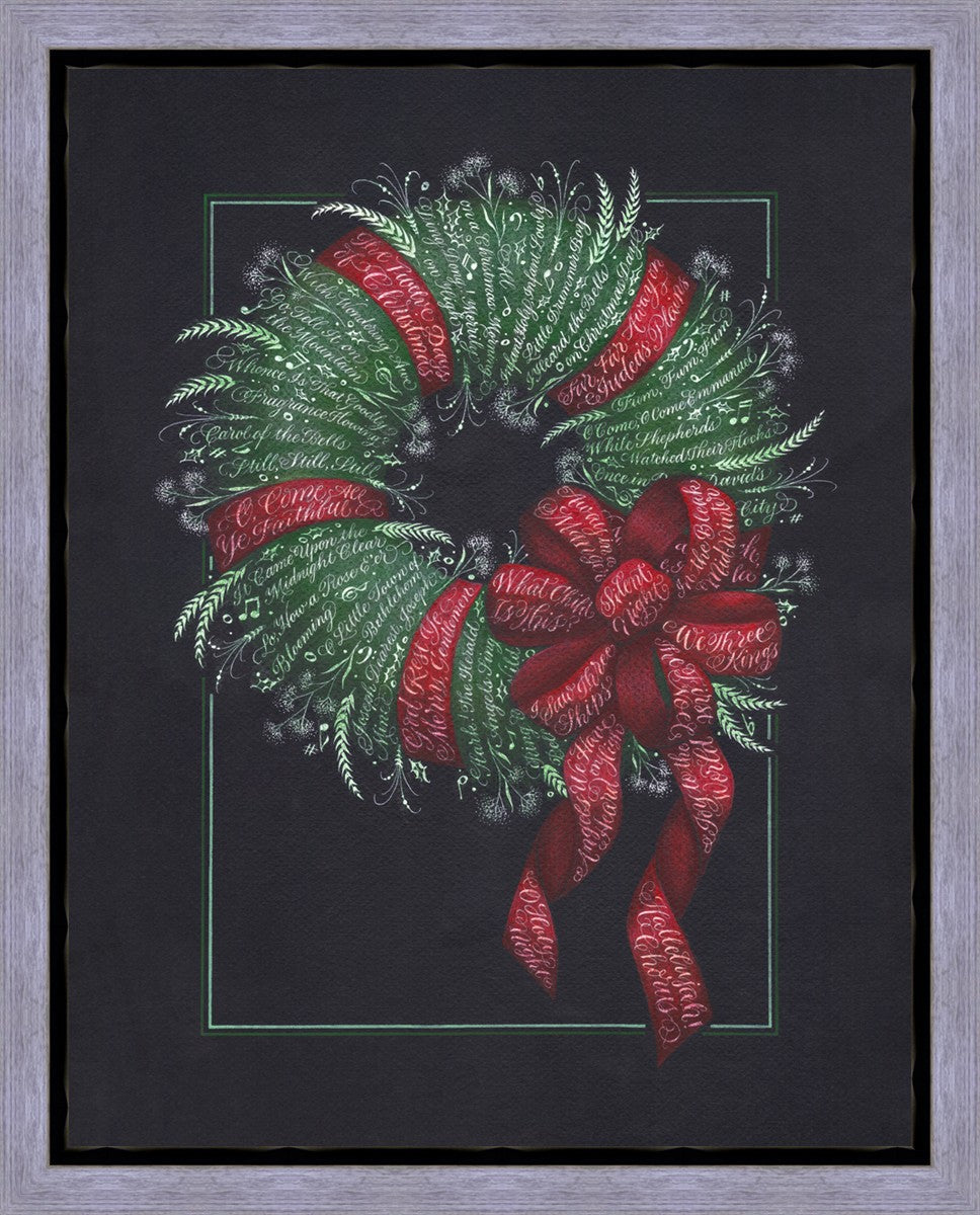 I was sketching during October General Conference, about the time of year I start thinking of Christmas things, and landed on the idea of wreaths made up of words. I love Christmas carols and wondered how many I could fit in a wreath. I began planning out the pattern by tying a bow from wired ribbon, lighting it, and drawing it so I could get the loops and turns correct. I began positioning titles into the ribbon spaces and then into the wreath.