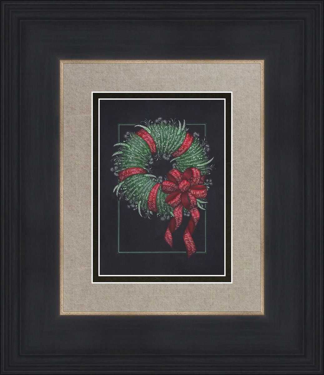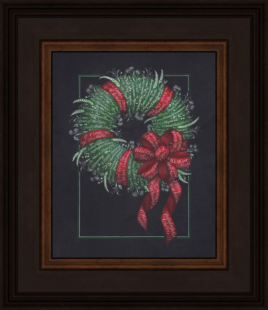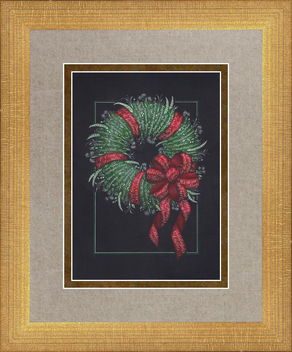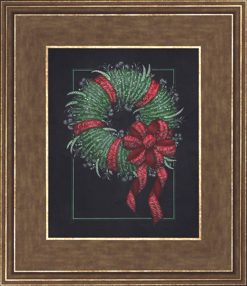 I was sketching during October General Conference, about the time of year I start thinking of Christmas things, and landed on the idea of wreaths made up of words. I love Christmas carols and wondered how many I could fit in a wreath. I began planning out the pattern by tying a bow from wired ribbon, lighting it, and drawing it so I could get the loops and turns correct. I began positioning titles into the ribbon spaces and then into the wreath.