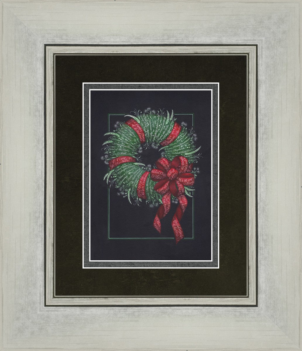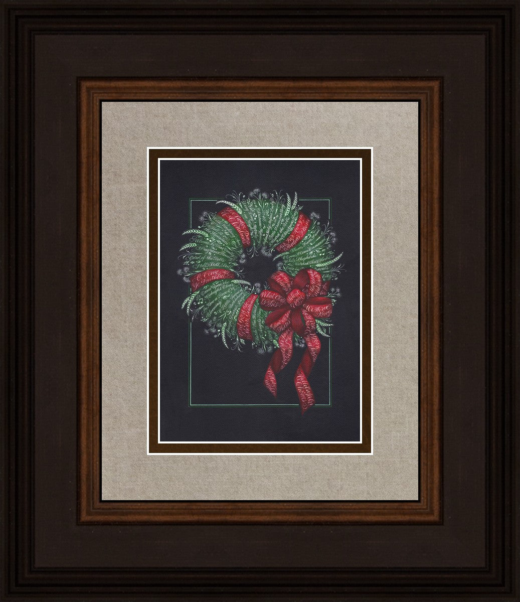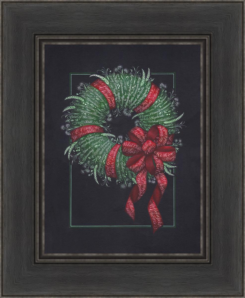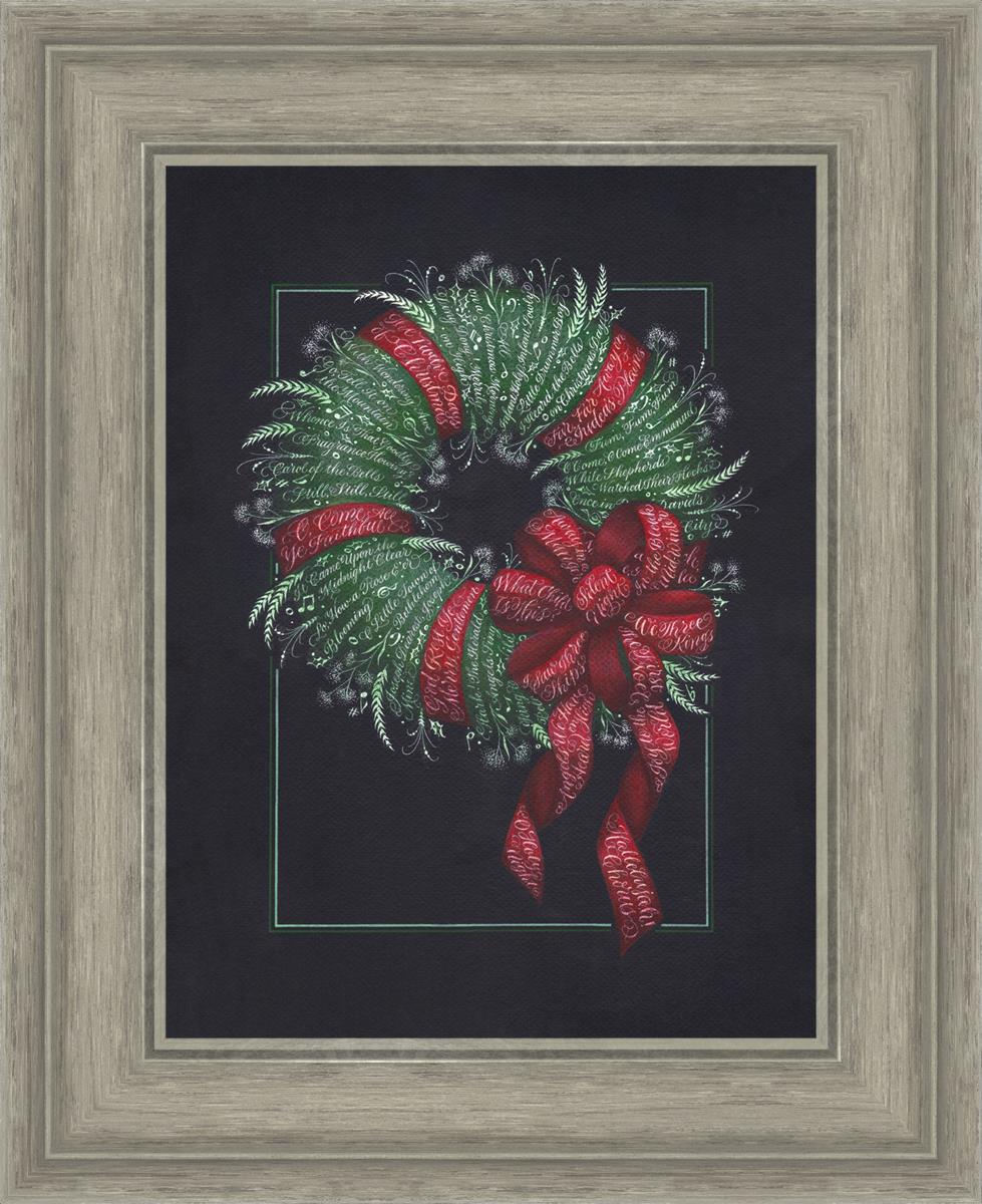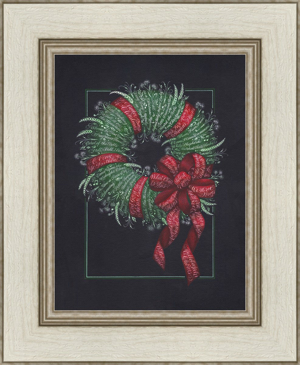 I was sketching during October General Conference, about the time of year I start thinking of Christmas things, and landed on the idea of wreaths made up of words. I love Christmas carols and wondered how many I could fit in a wreath. I began planning out the pattern by tying a bow from wired ribbon, lighting it, and drawing it so I could get the loops and turns correct. I began positioning titles into the ribbon spaces and then into the wreath.