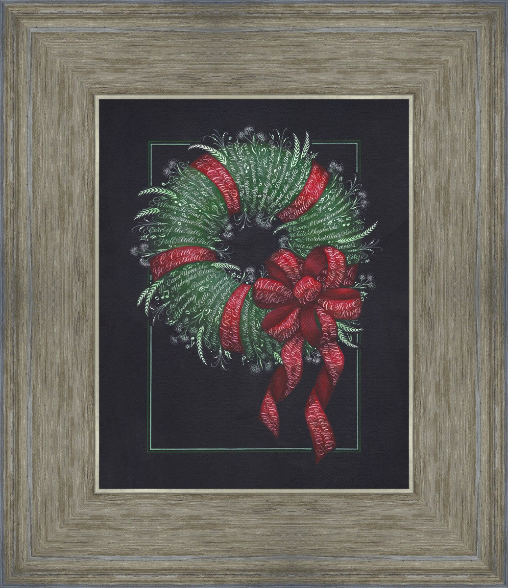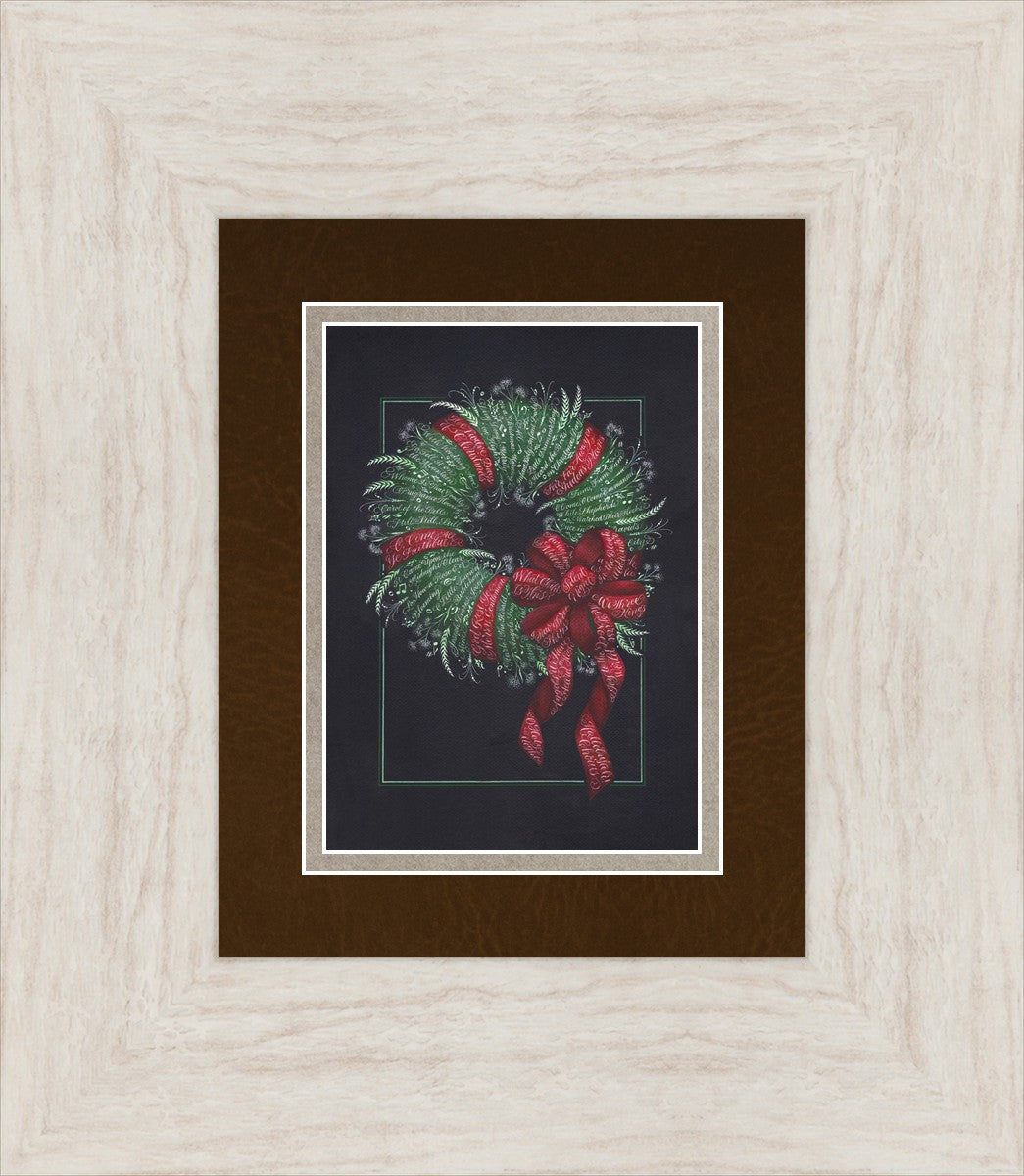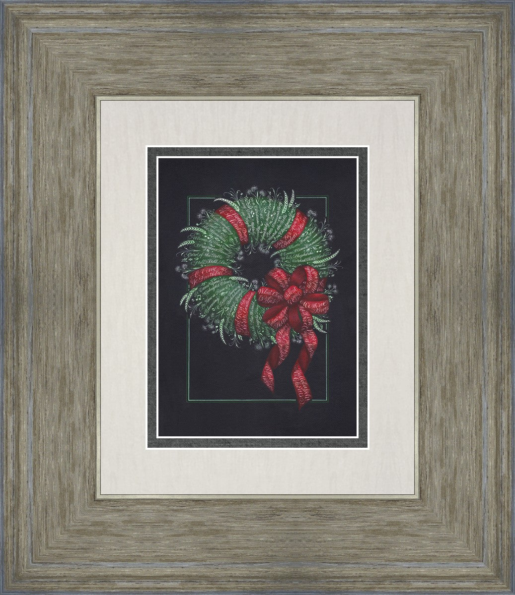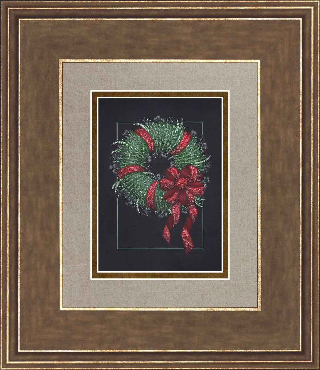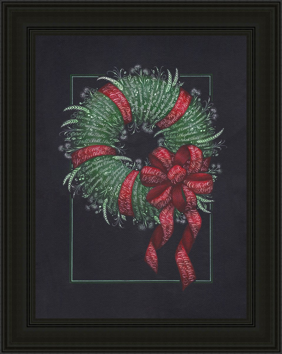 I was sketching during October General Conference, about the time of year I start thinking of Christmas things, and landed on the idea of wreaths made up of words. I love Christmas carols and wondered how many I could fit in a wreath. I began planning out the pattern by tying a bow from wired ribbon, lighting it, and drawing it so I could get the loops and turns correct. I began positioning titles into the ribbon spaces and then into the wreath.