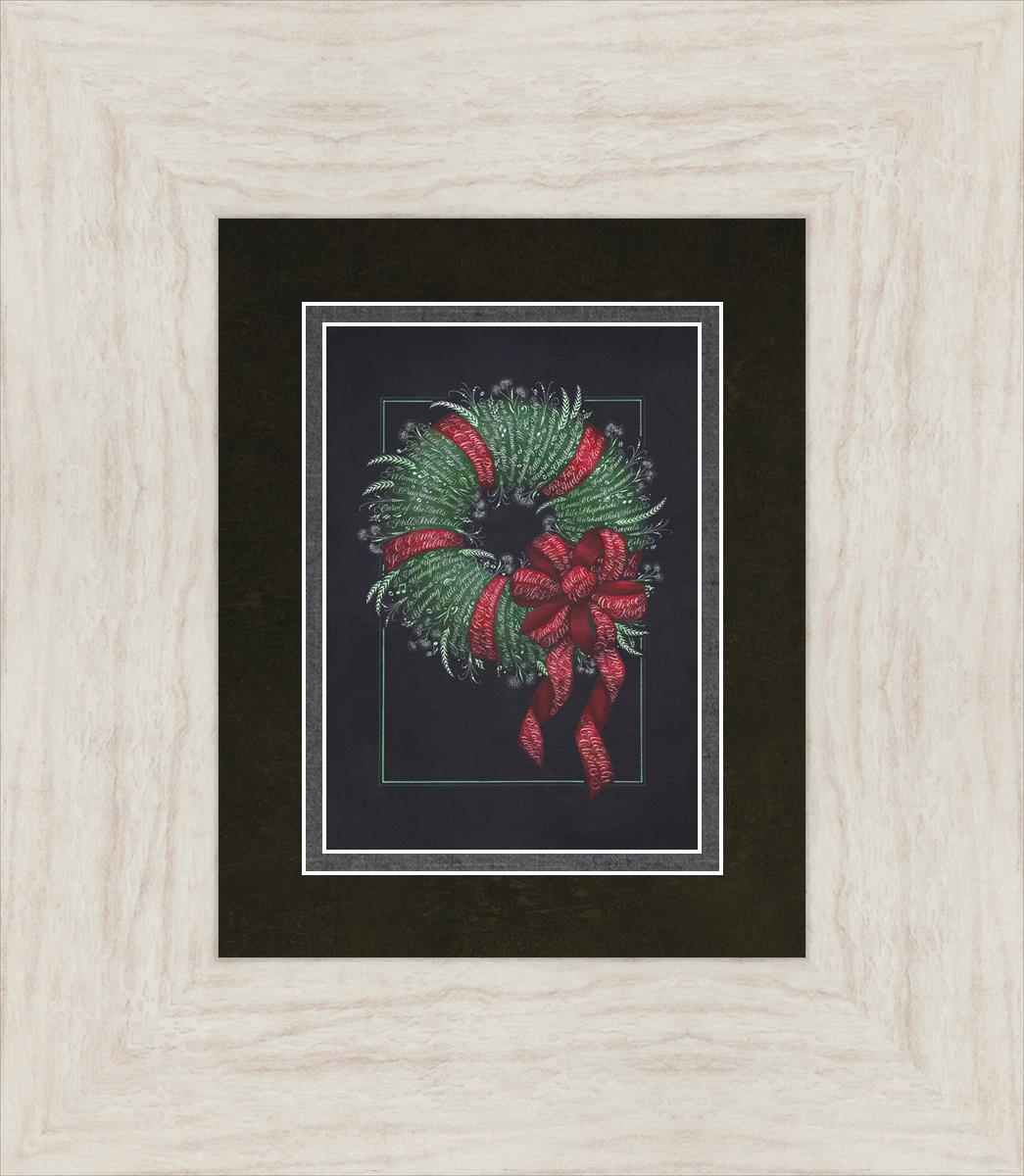 I wondered about elevating the whole design by making the wreath look dimensional and decided to initially lay down some watercolor to help the donut shape look rounded. My paper was not the right kind for so much water and it buckled. I decided to continue my experiment anyway. Once the words were on, I strengthened the shadow areas with colored pencil. With some heat and pressure, we eventually got the ripples out.