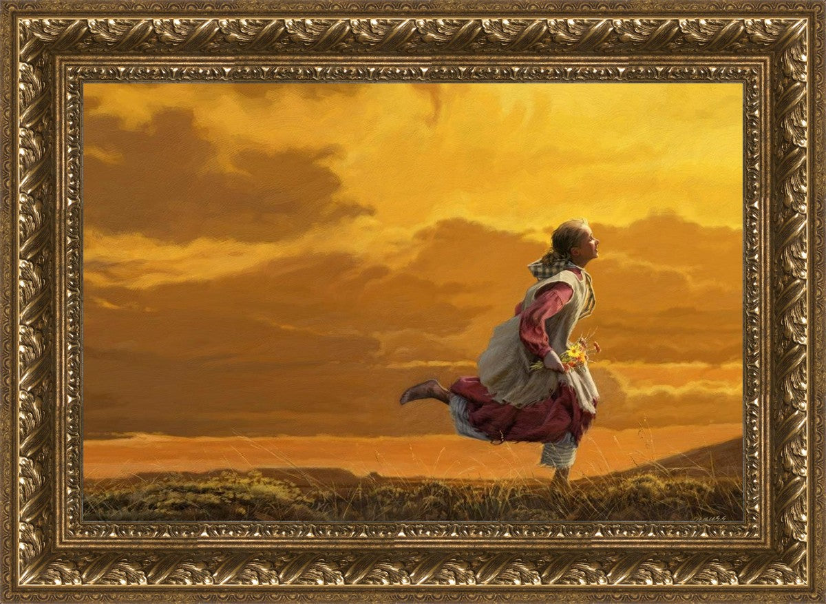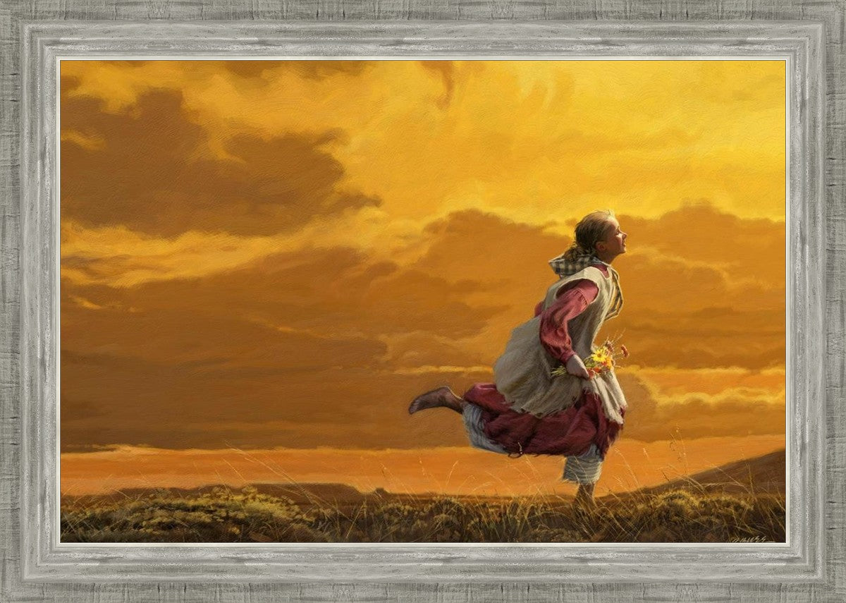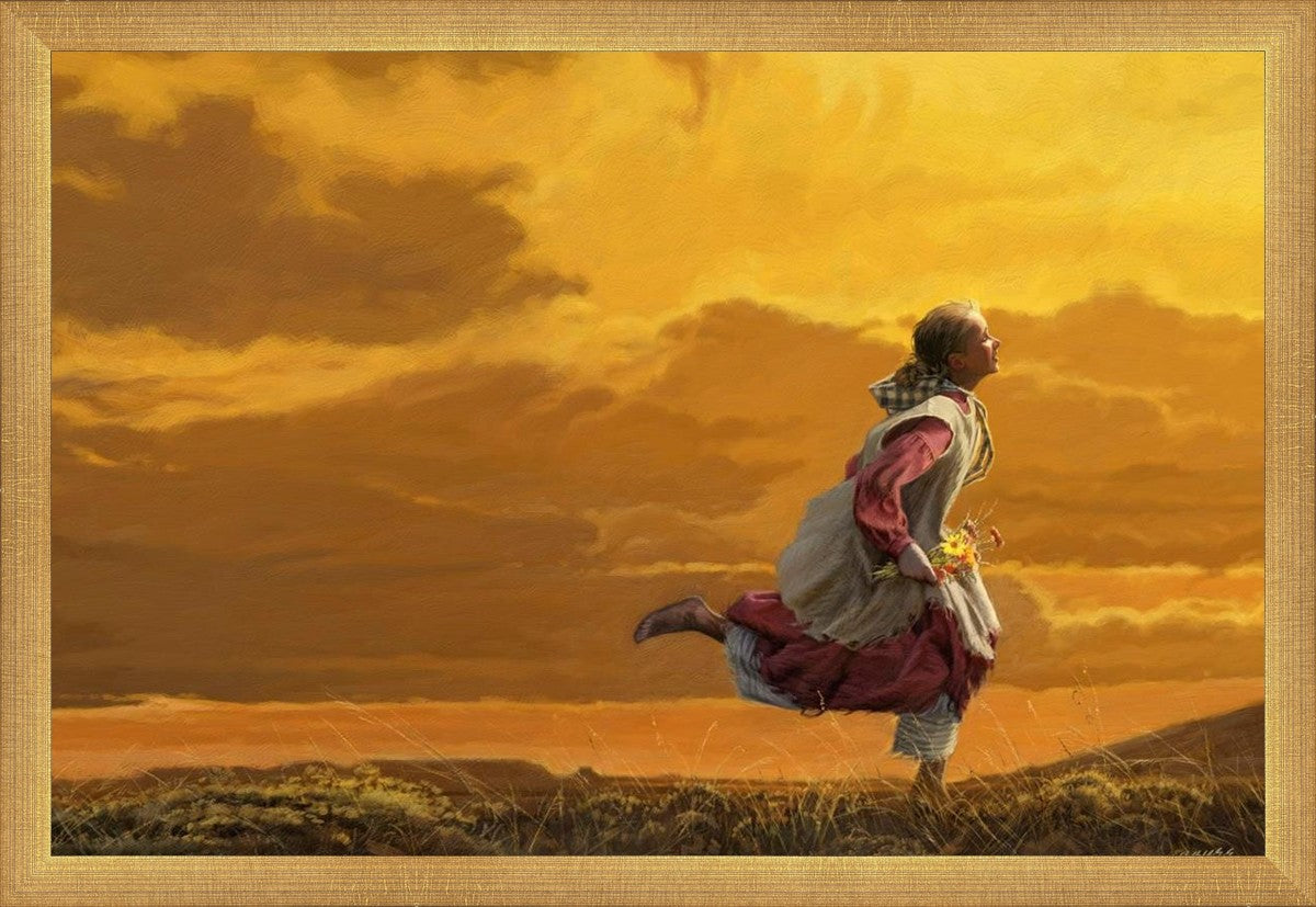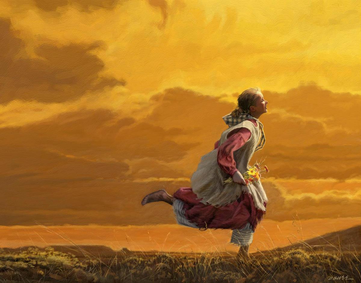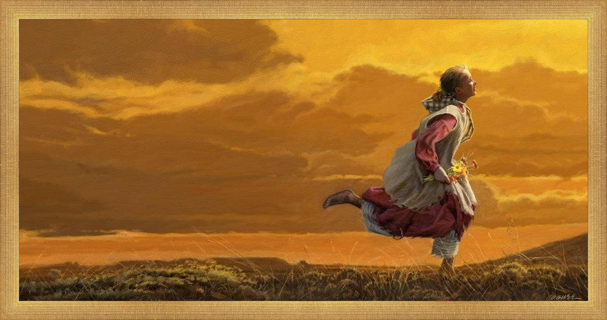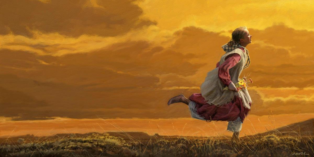 Young pioneer girl running with a handful of wildflowers. This painting was originally part of the book The White Ox I later added the flowers and it was used as a cover for the Friend Magazine.