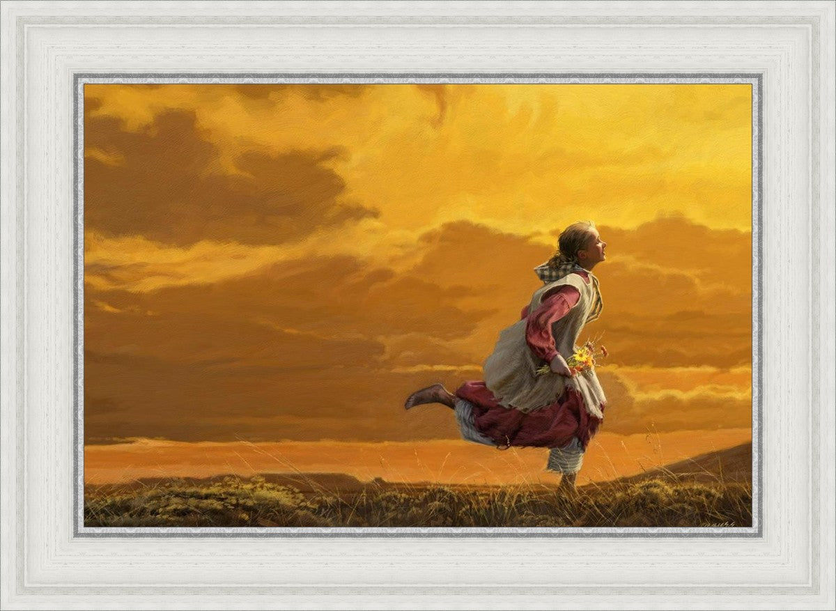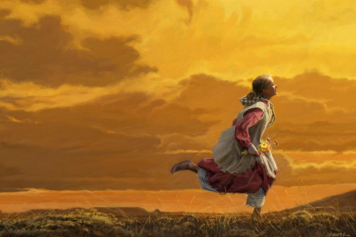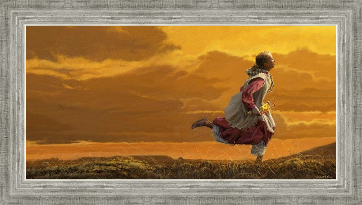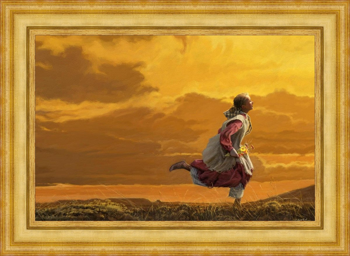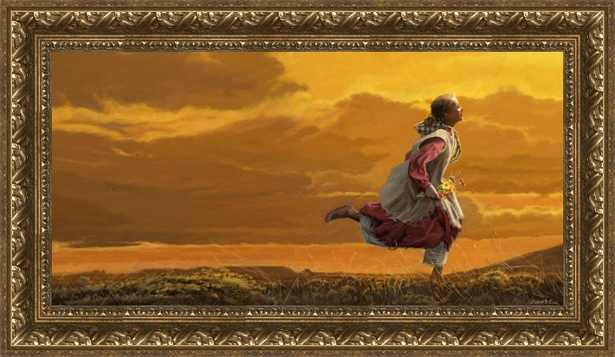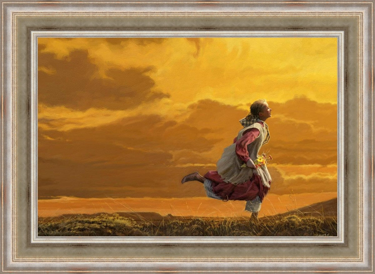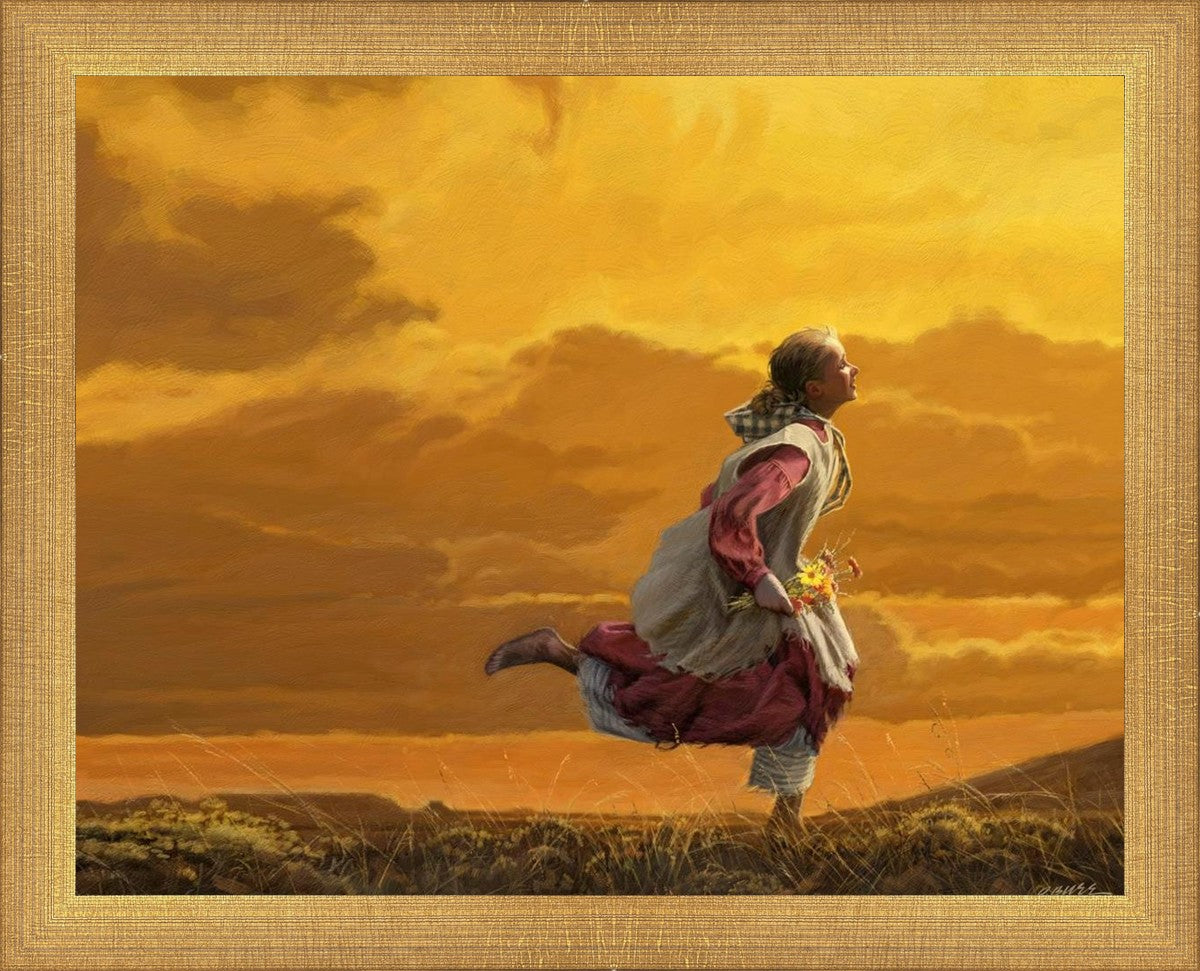 Young pioneer girl running with a handful of wildflowers. This painting was originally part of the book The White Ox I later added the flowers and it was used as a cover for the Friend Magazine.