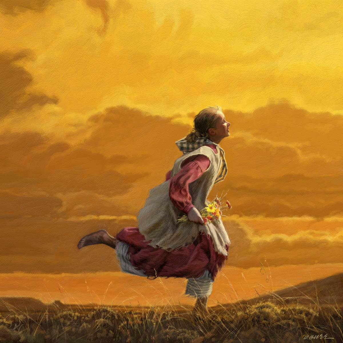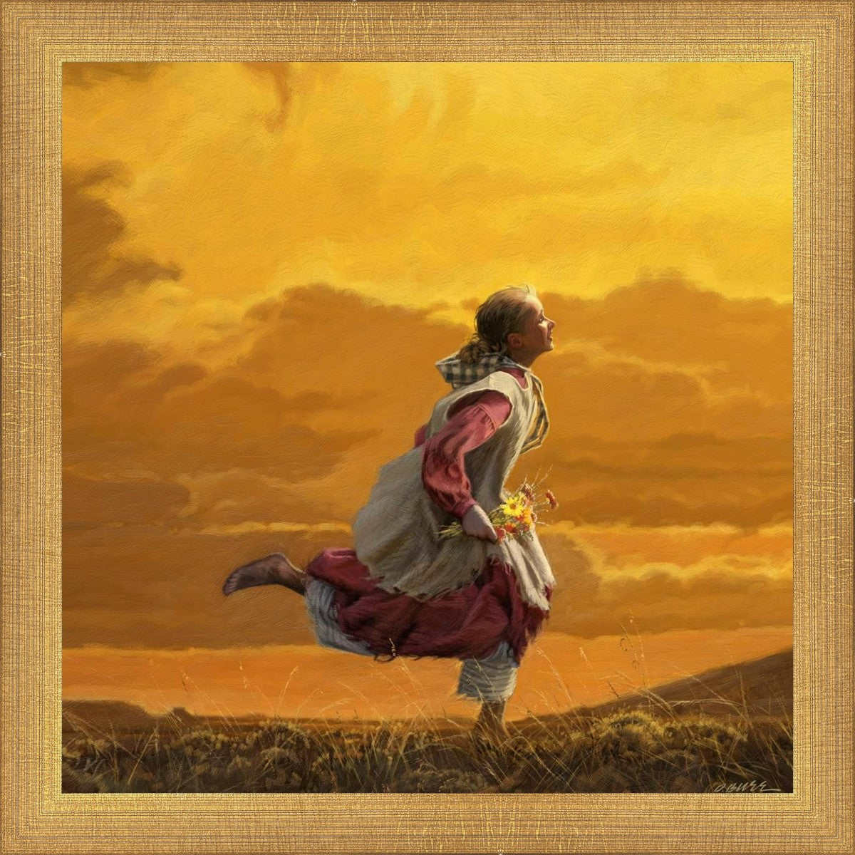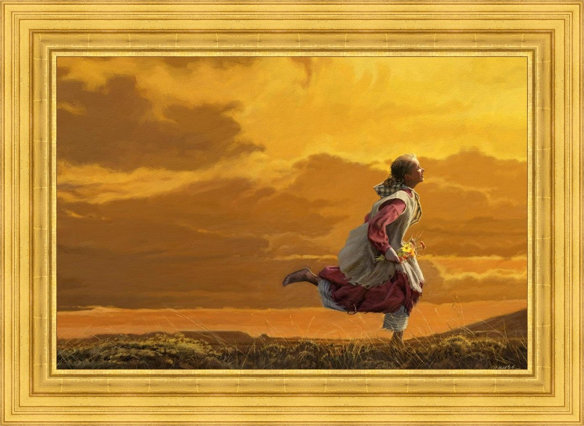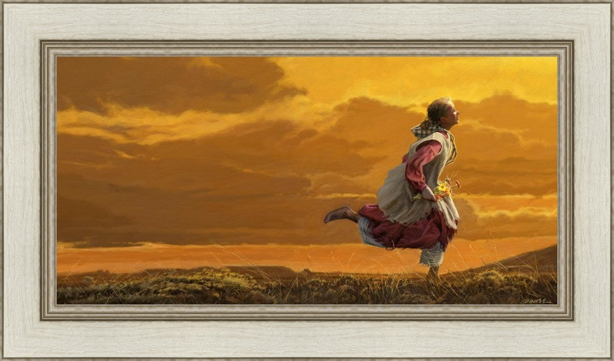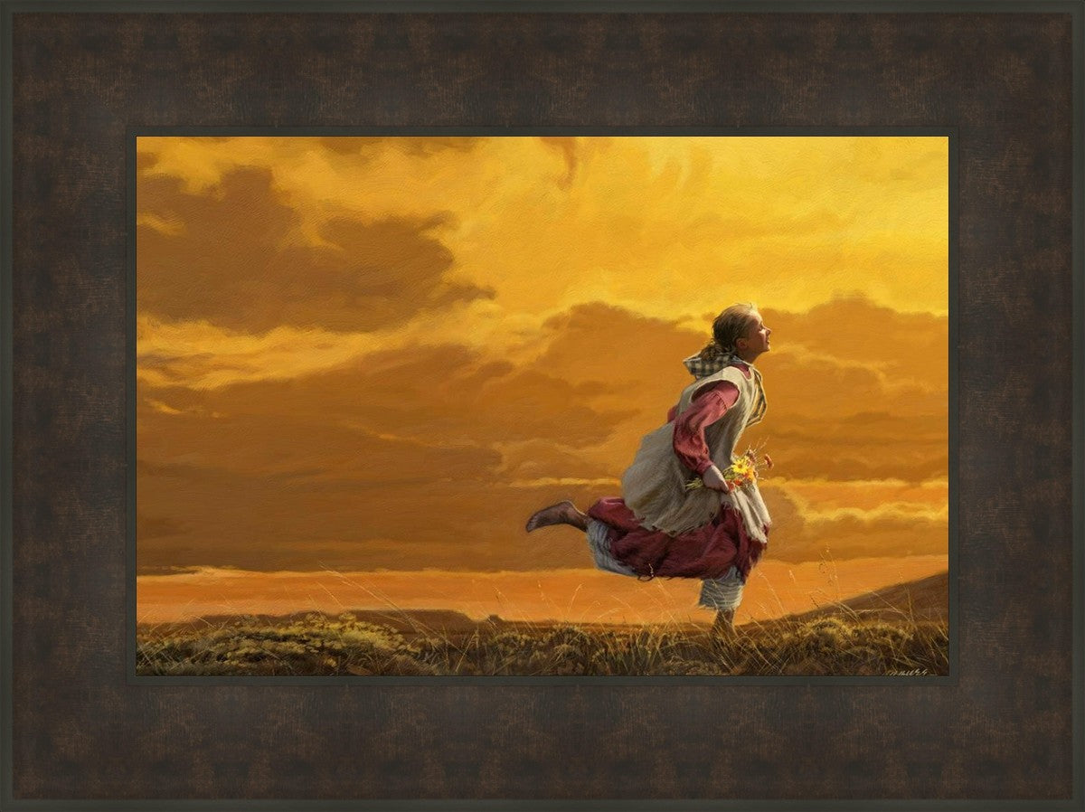 Young pioneer girl running with a handful of wildflowers. This painting was originally part of the book The White Ox I later added the flowers and it was used as a cover for the Friend Magazine.