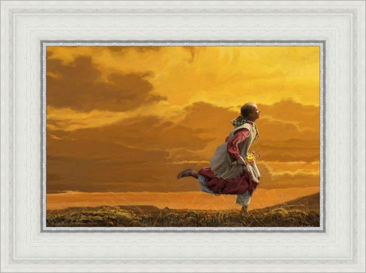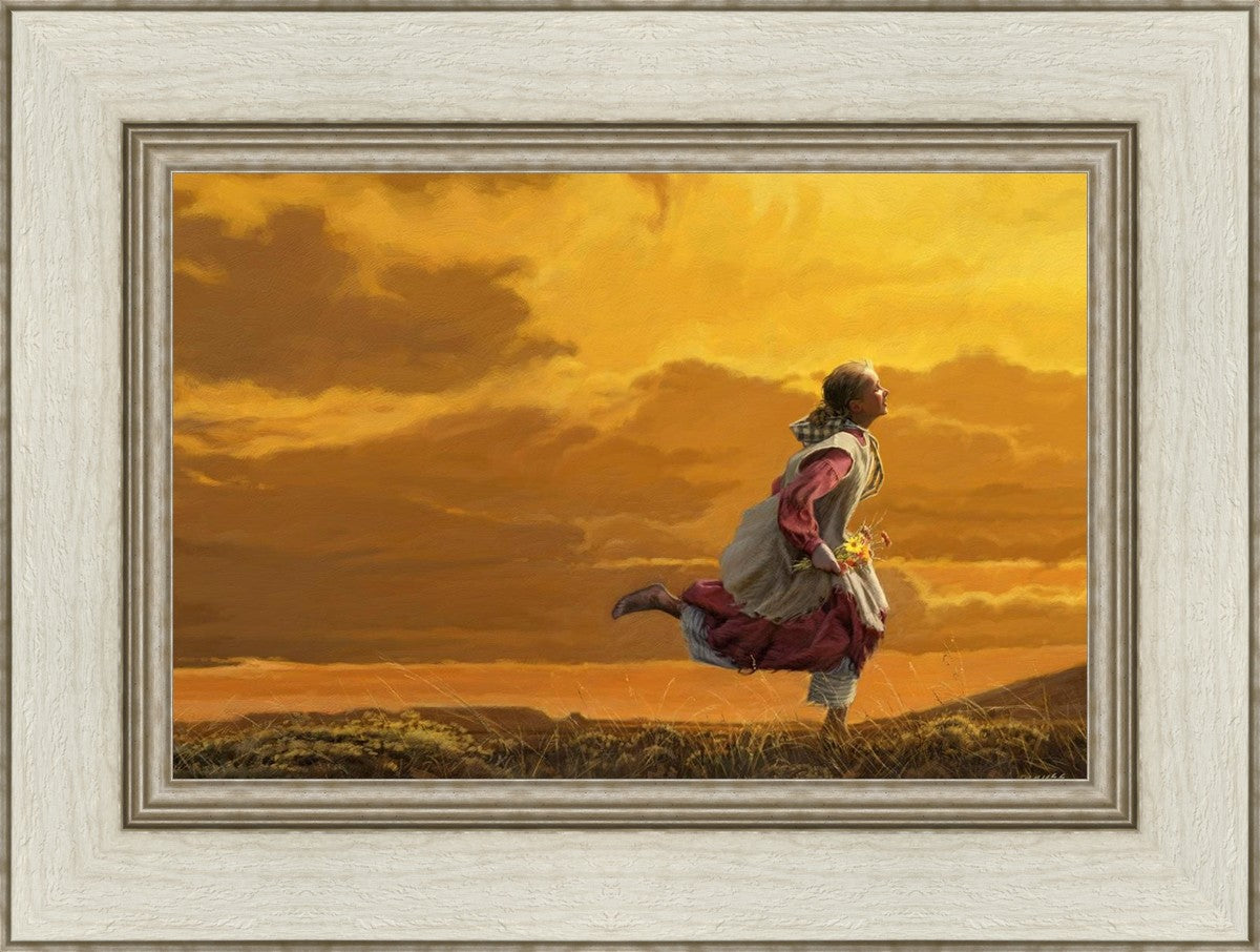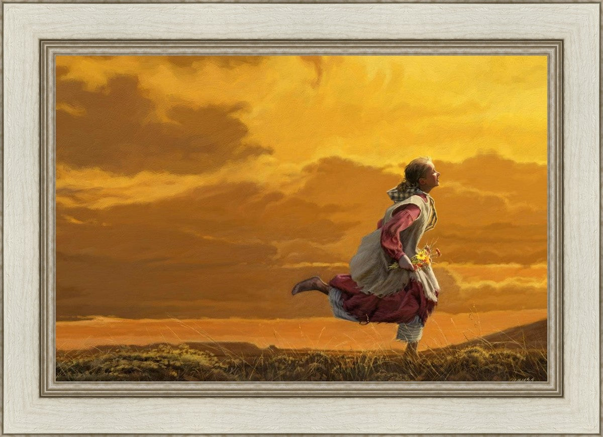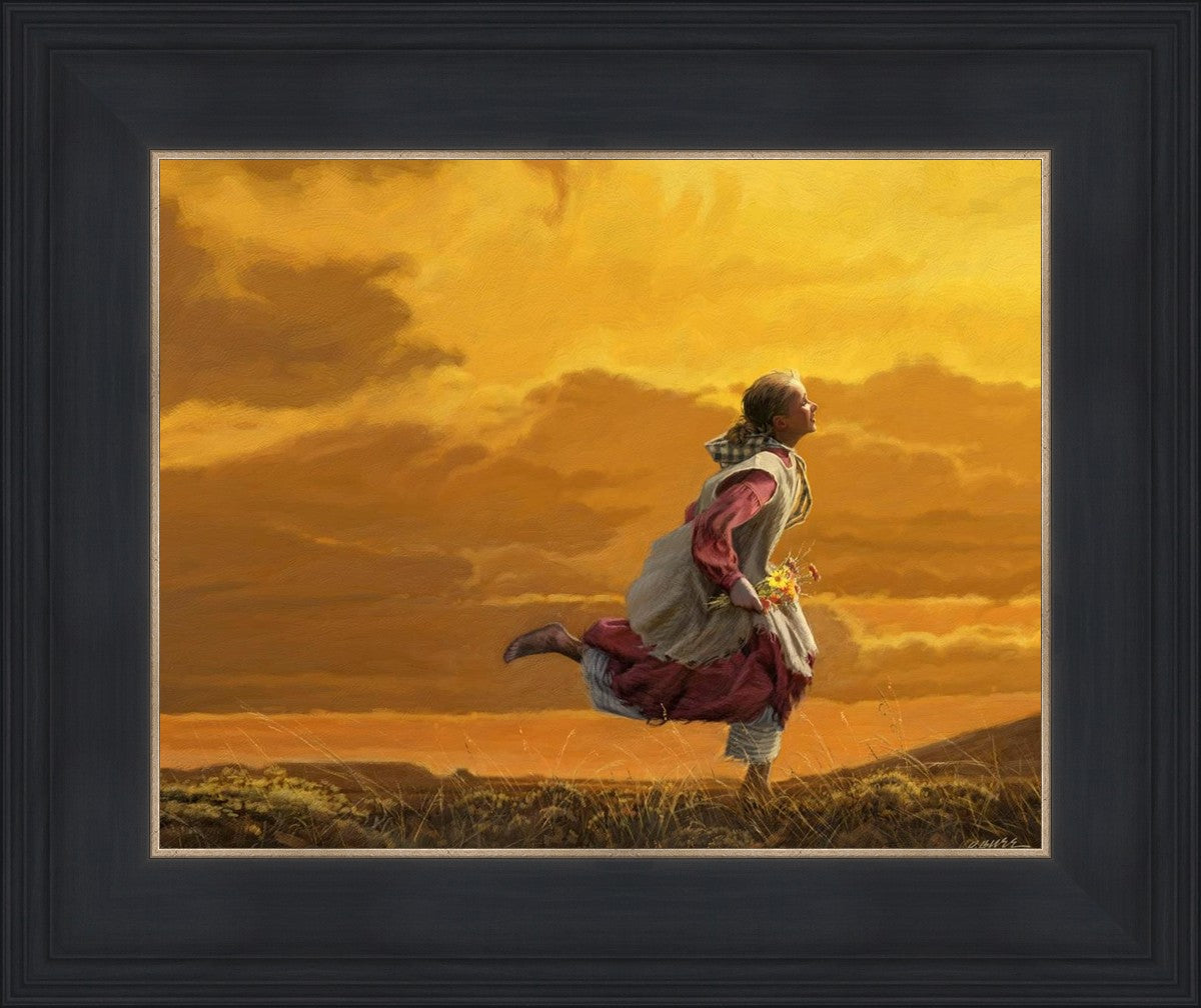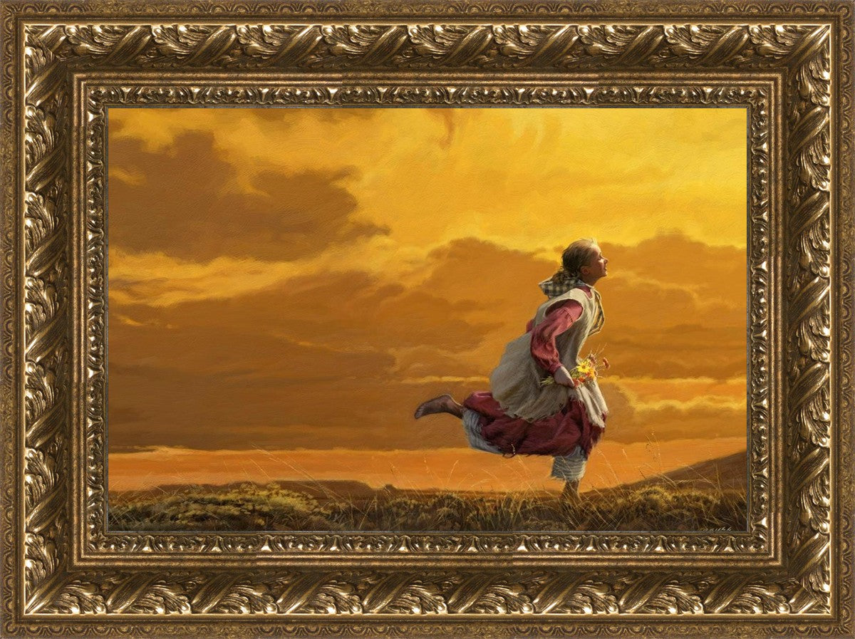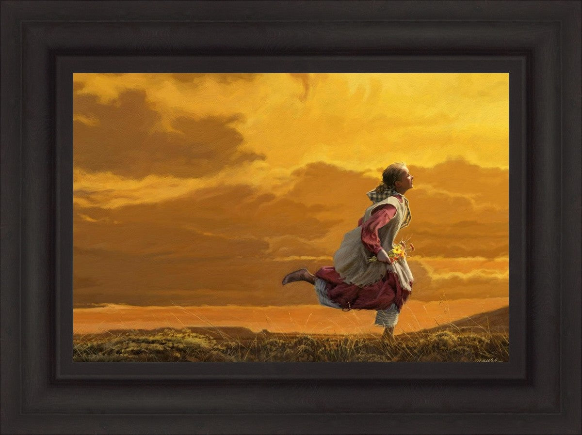 Young pioneer girl running with a handful of wildflowers. This painting was originally part of the book The White Ox I later added the flowers and it was used as a cover for the Friend Magazine.