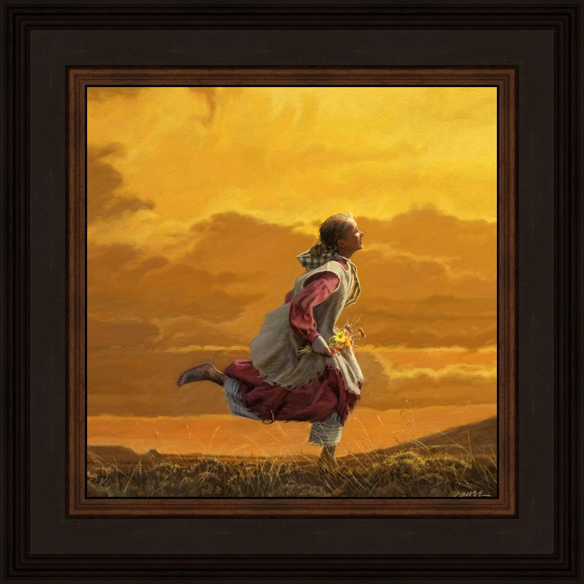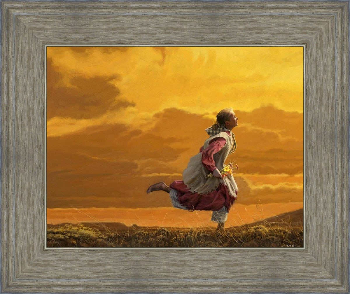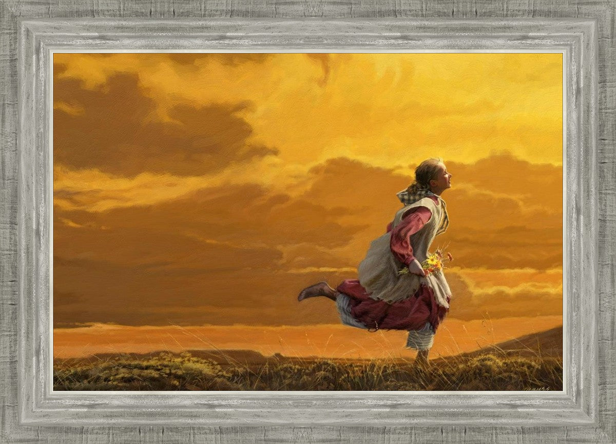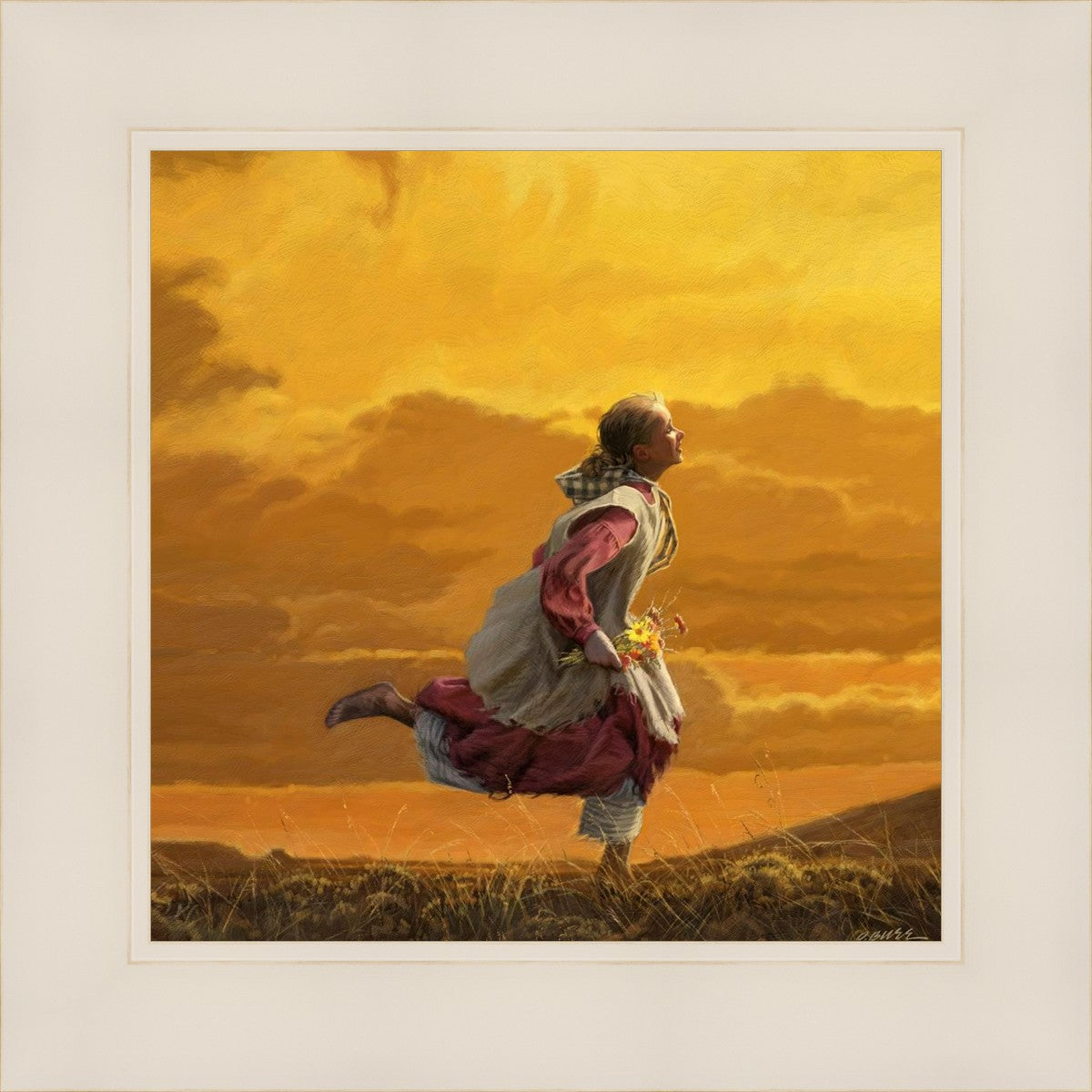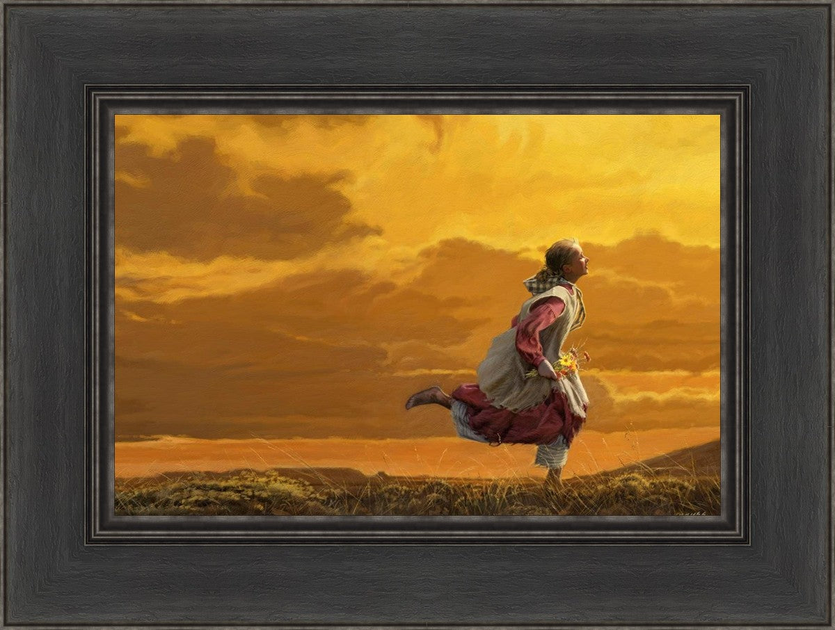 Young pioneer girl running with a handful of wildflowers. This painting was originally part of the book The White Ox I later added the flowers and it was used as a cover for the Friend Magazine.