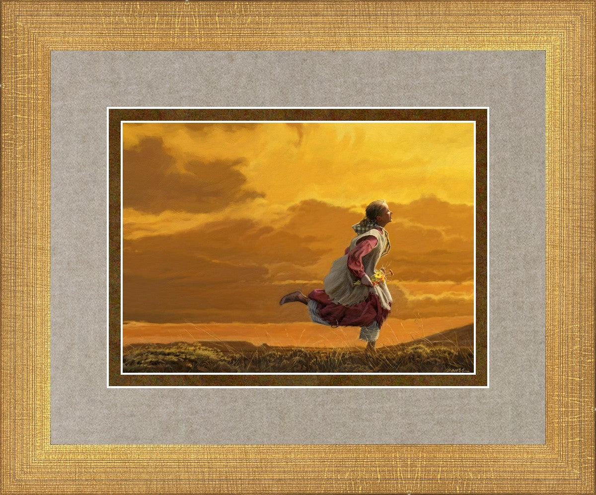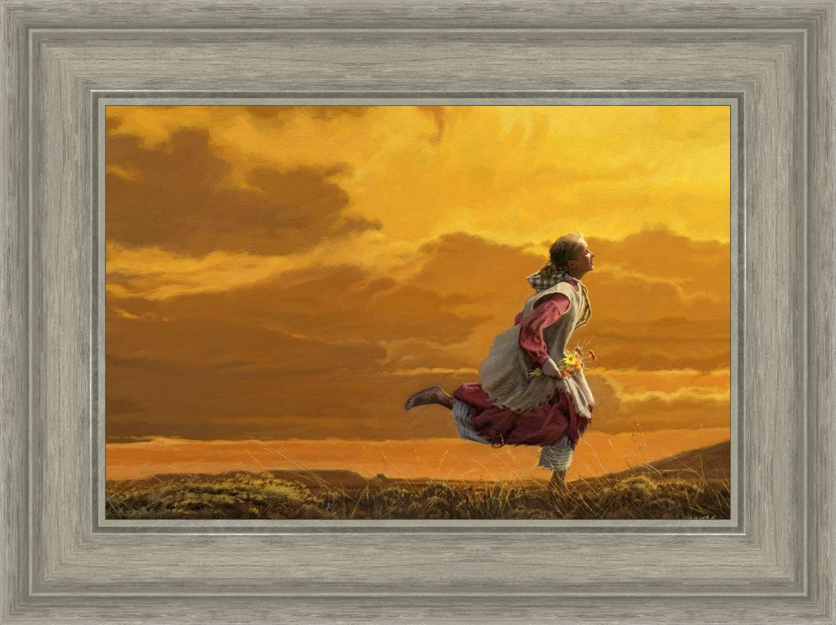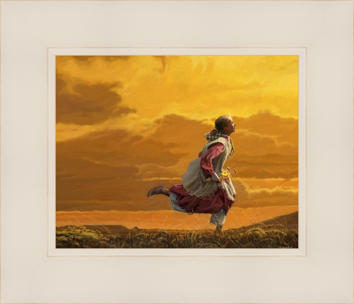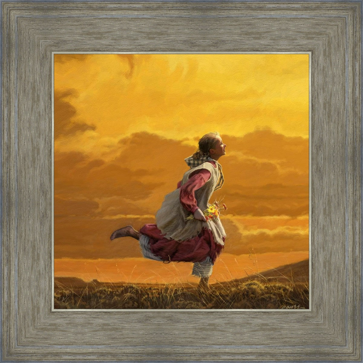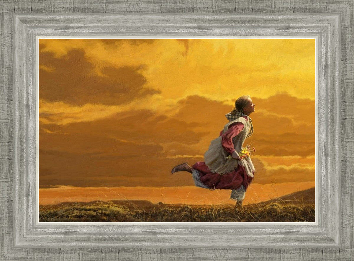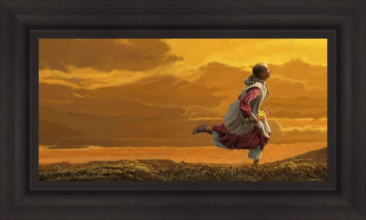Young pioneer girl running with a handful of wildflowers. This painting was originally part of the book The White Ox I later added the flowers and it was used as a cover for the Friend Magazine.