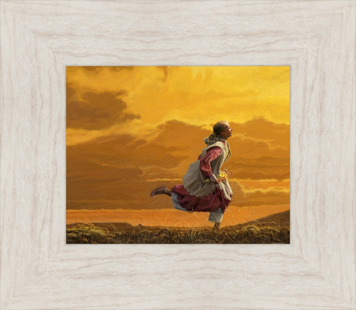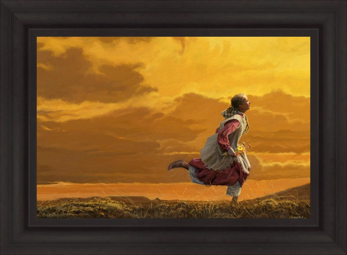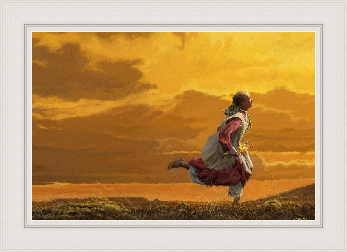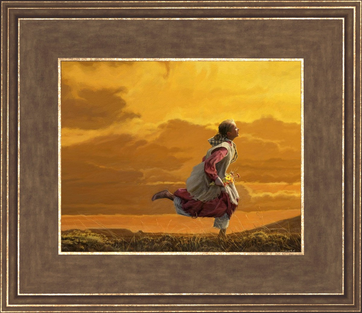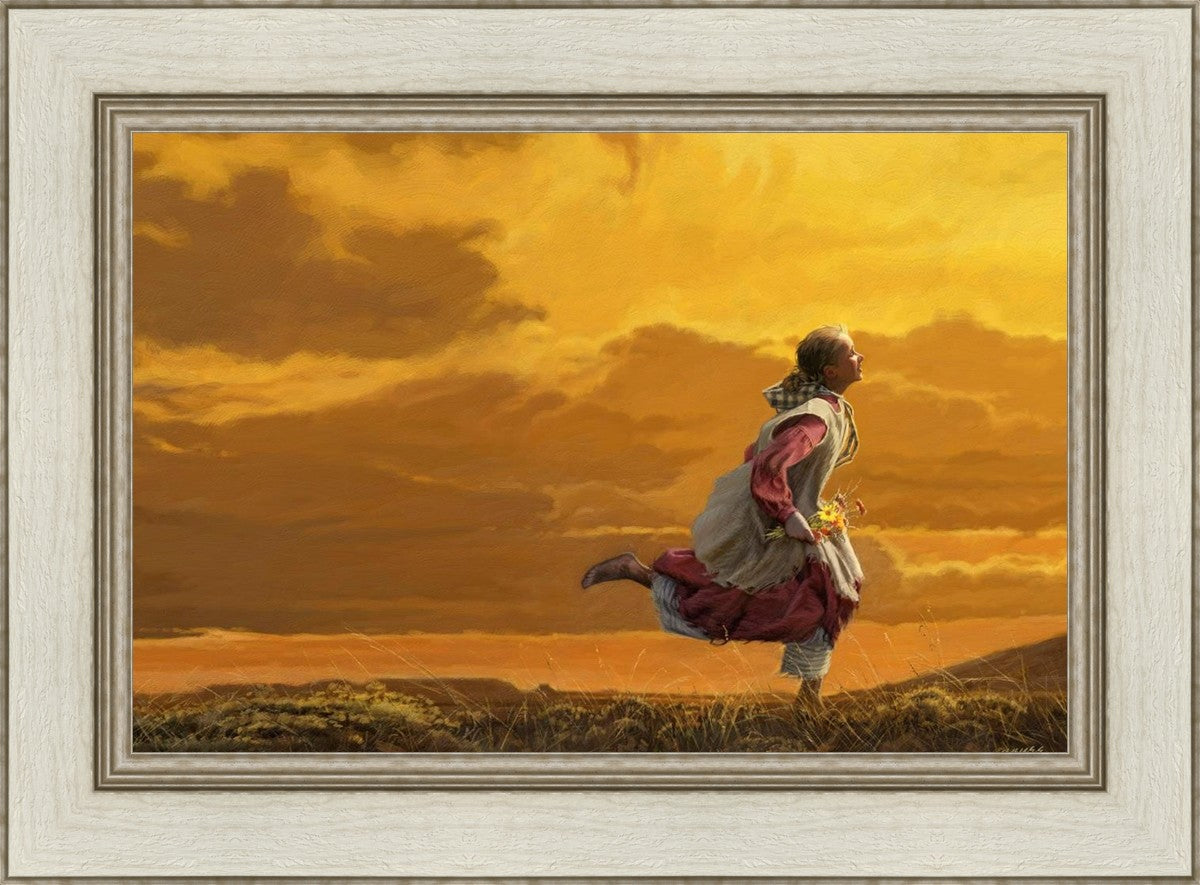 Young pioneer girl running with a handful of wildflowers. This painting was originally part of the book The White Ox I later added the flowers and it was used as a cover for the Friend Magazine.