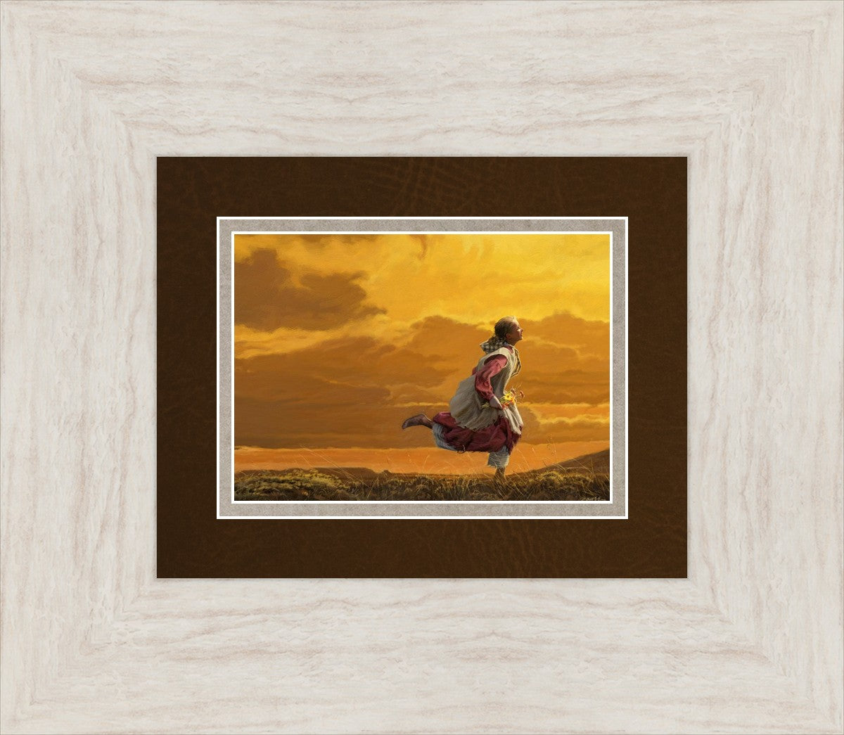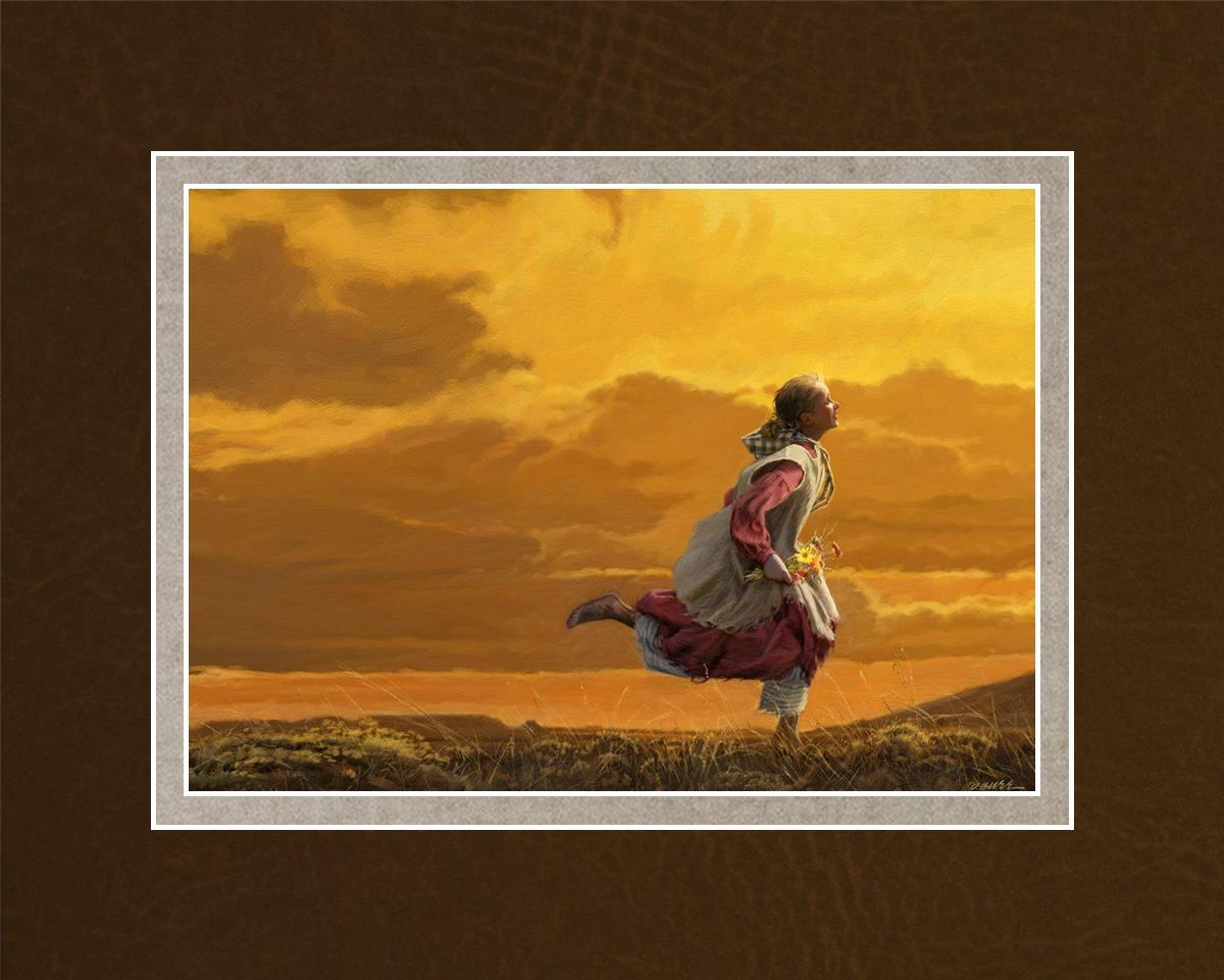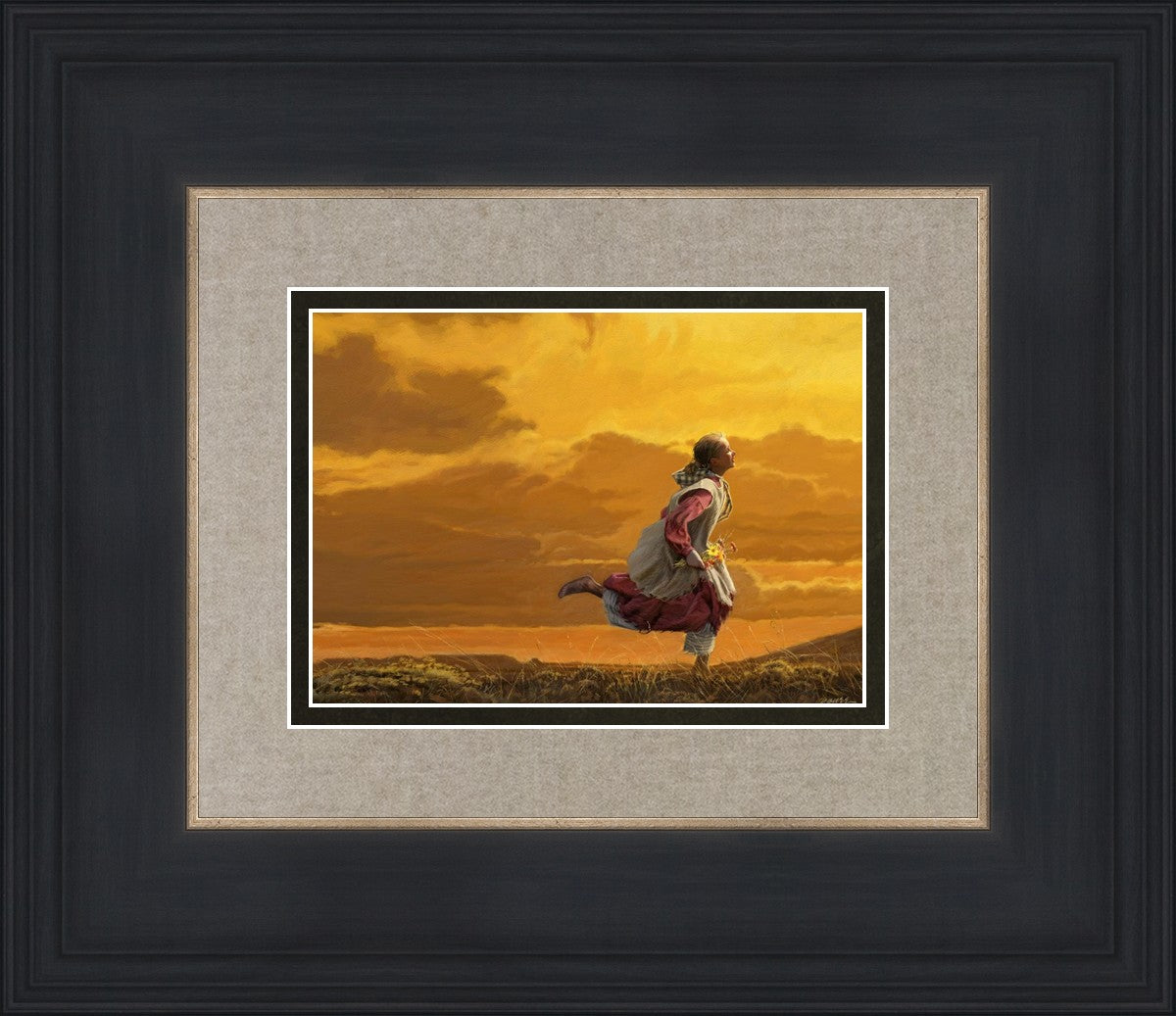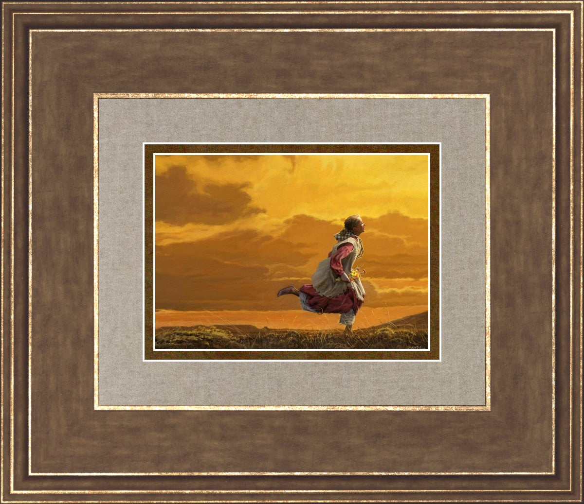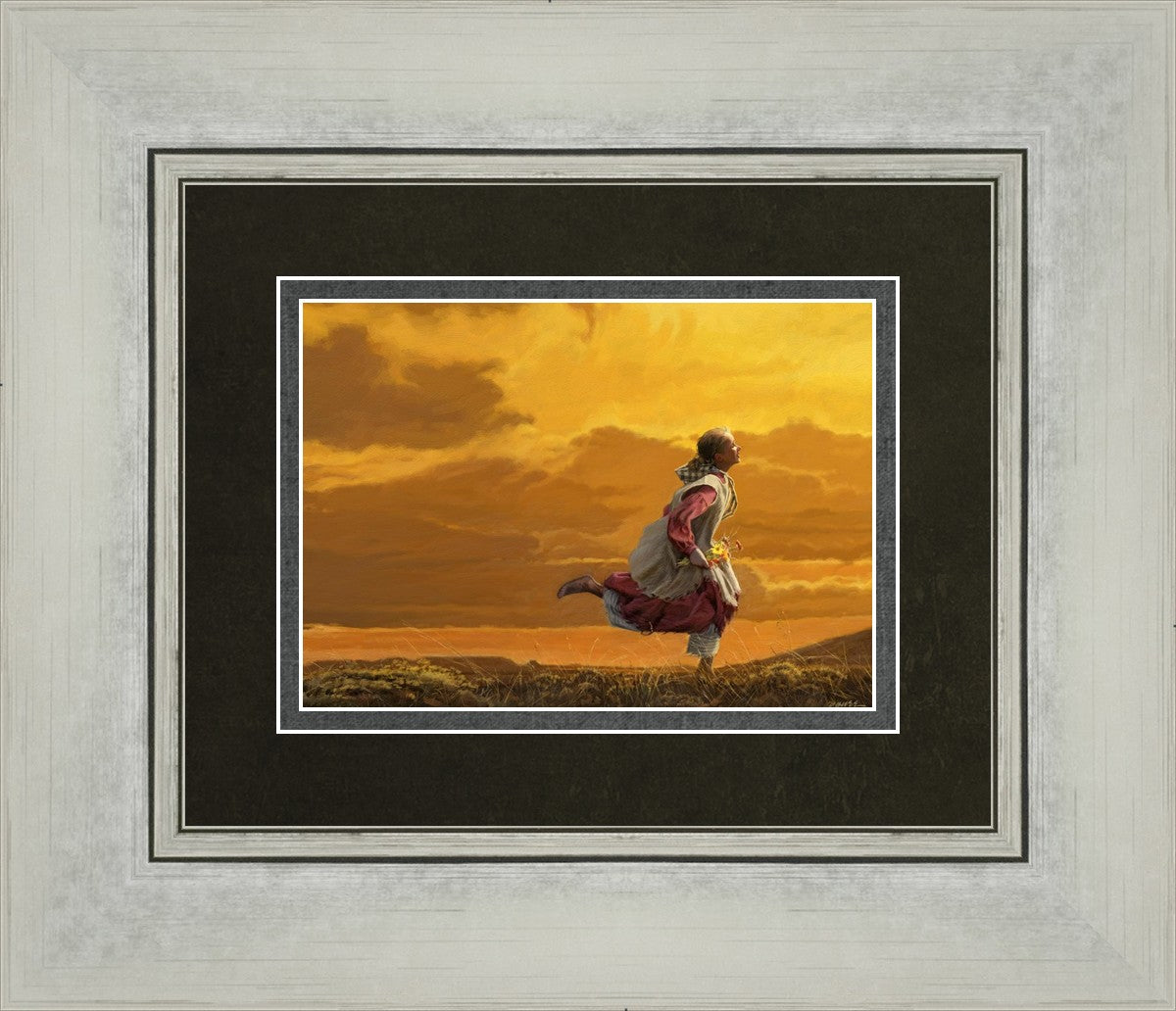 Young pioneer girl running with a handful of wildflowers. This painting was originally part of the book The White Ox I later added the flowers and it was used as a cover for the Friend Magazine.