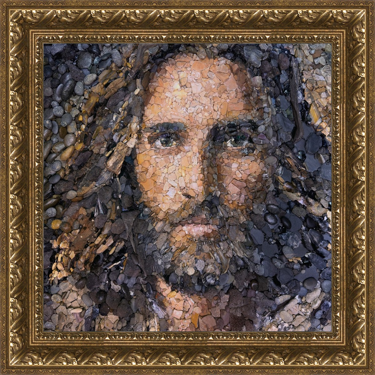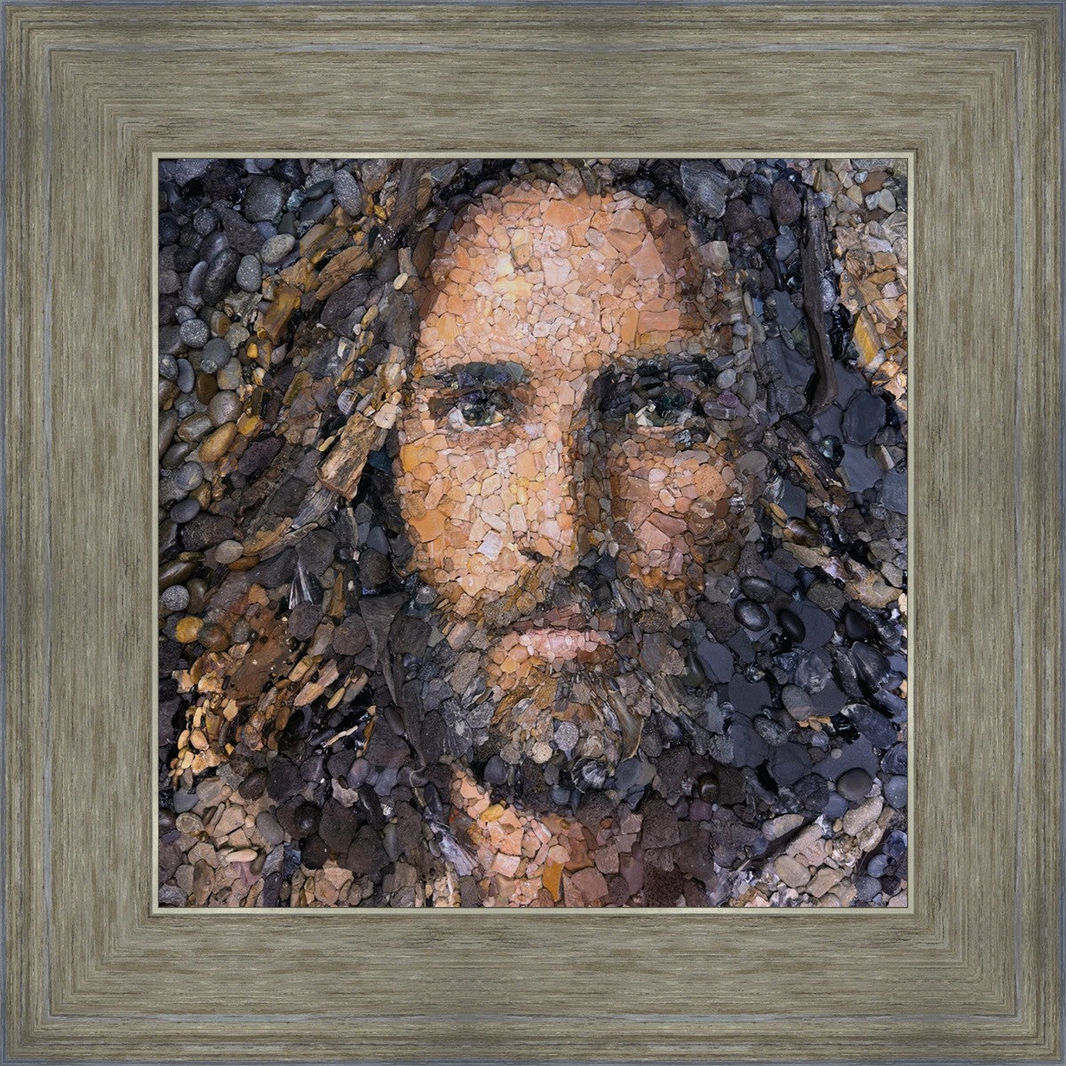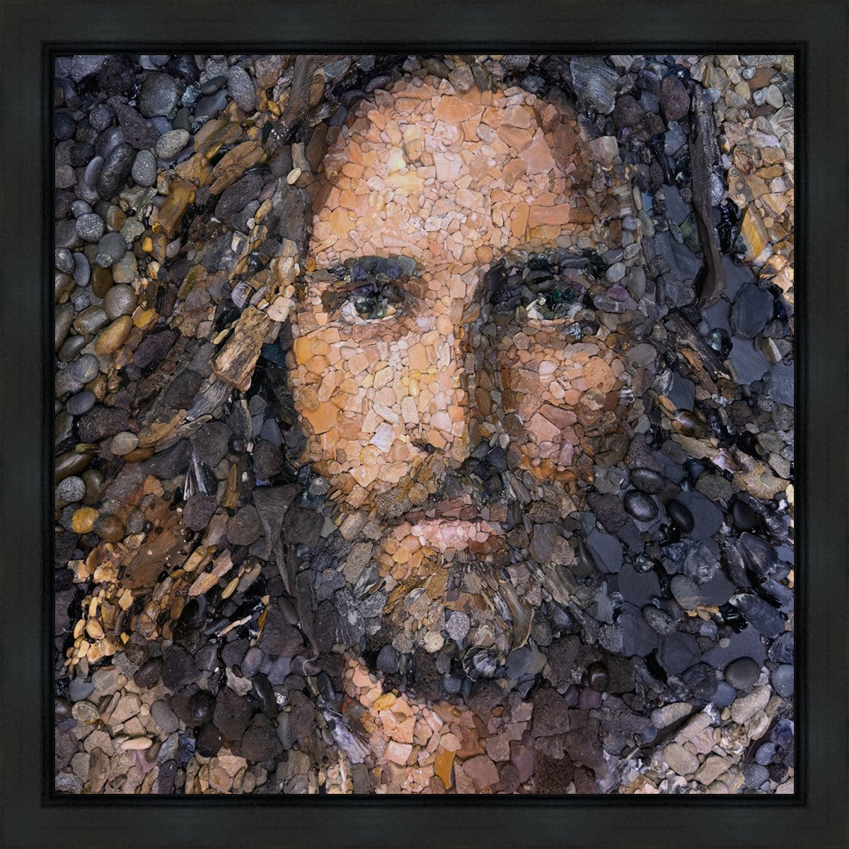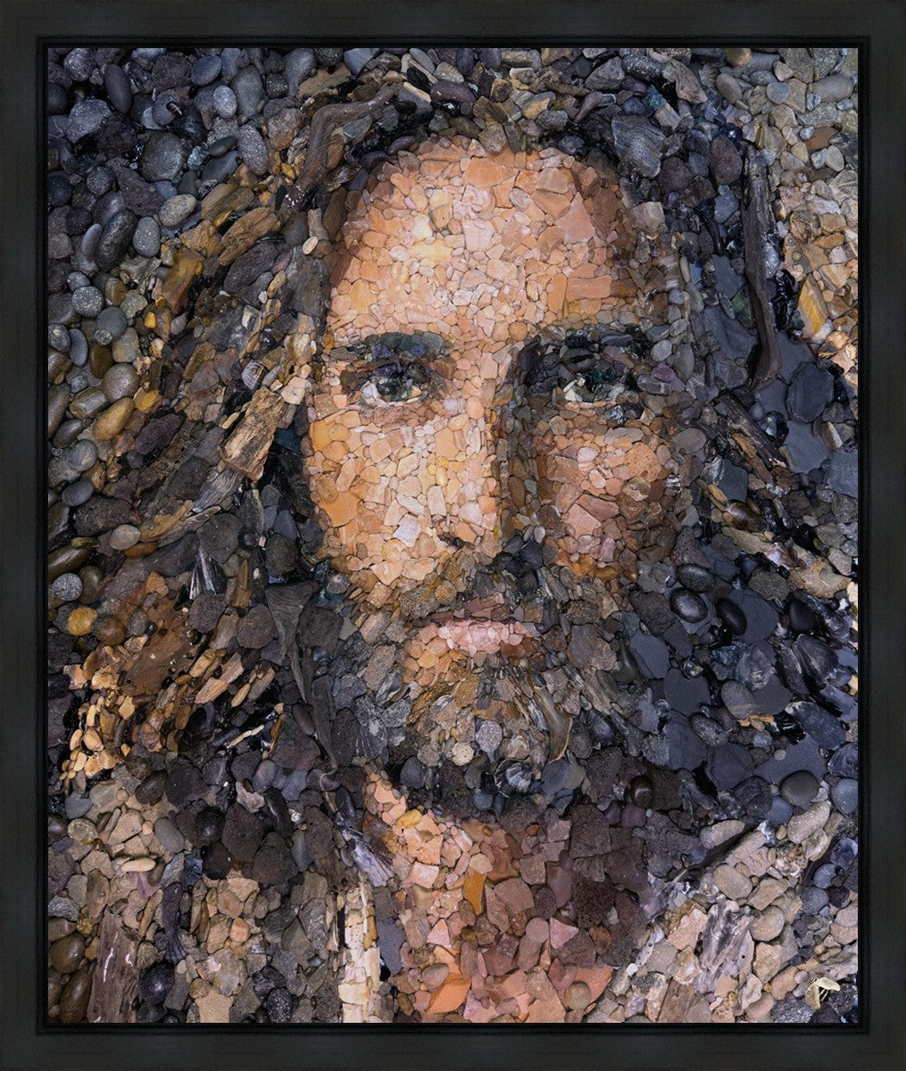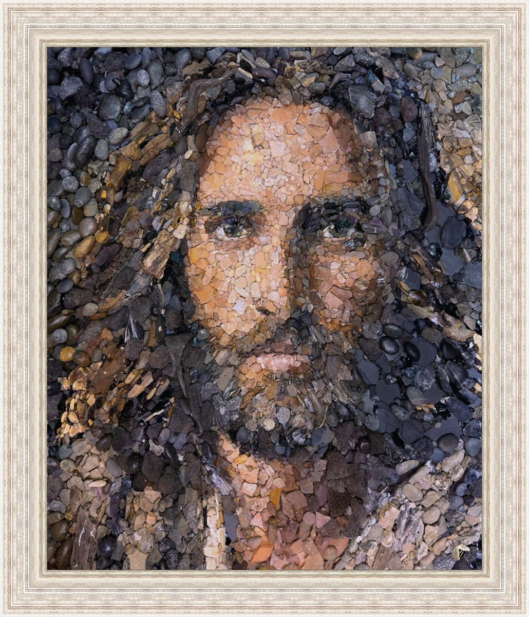 "A Sure Foundation" by Shelby Stroud is a remarkable portrait of Jesus created from a collage of stones, wood, and other earth elements, symbolizing strength and steadfastness. This unique artwork by Shelby Stroud is perfect for Christian homes and spaces, offering a powerful visual representation of faith and resilience.