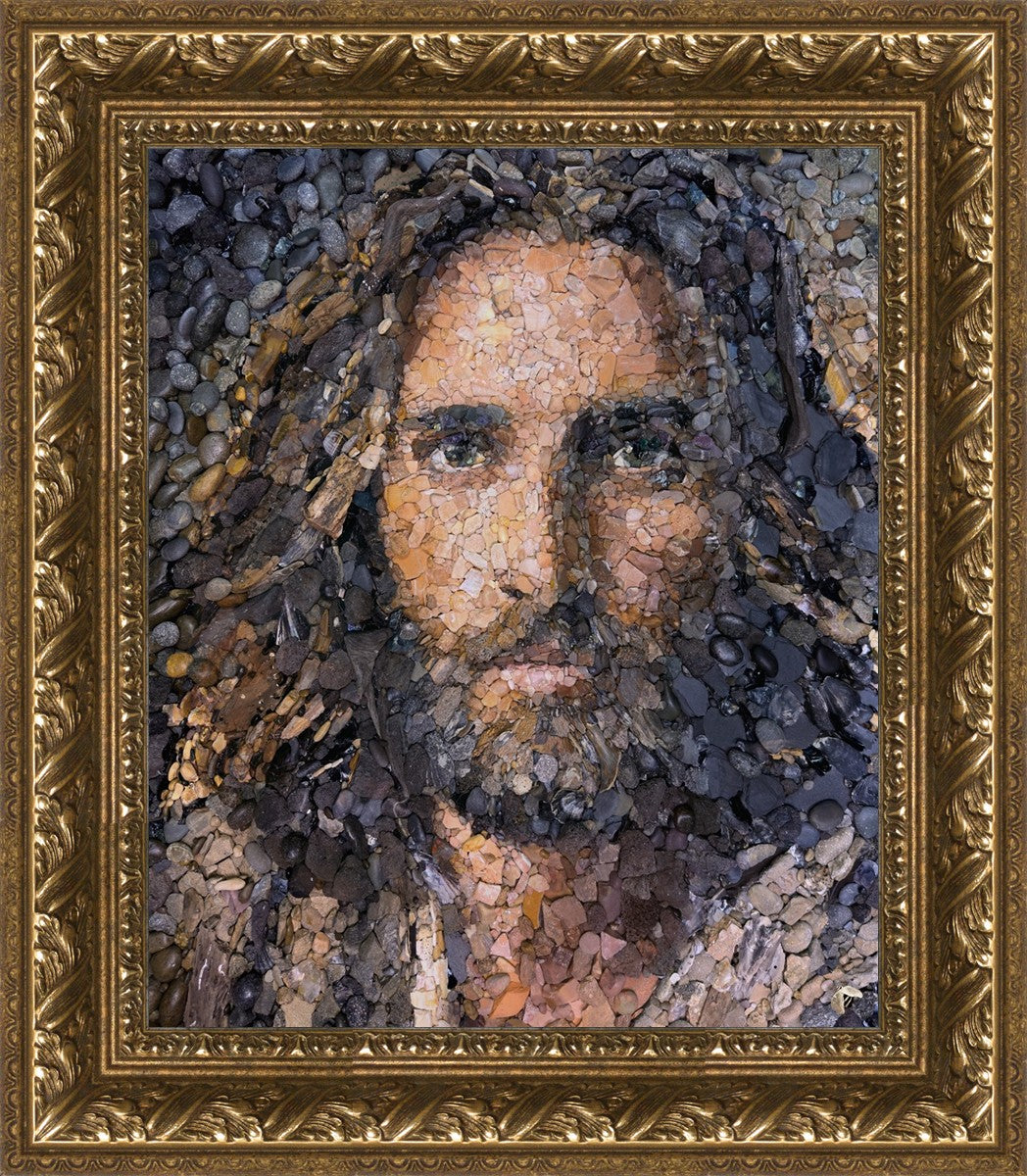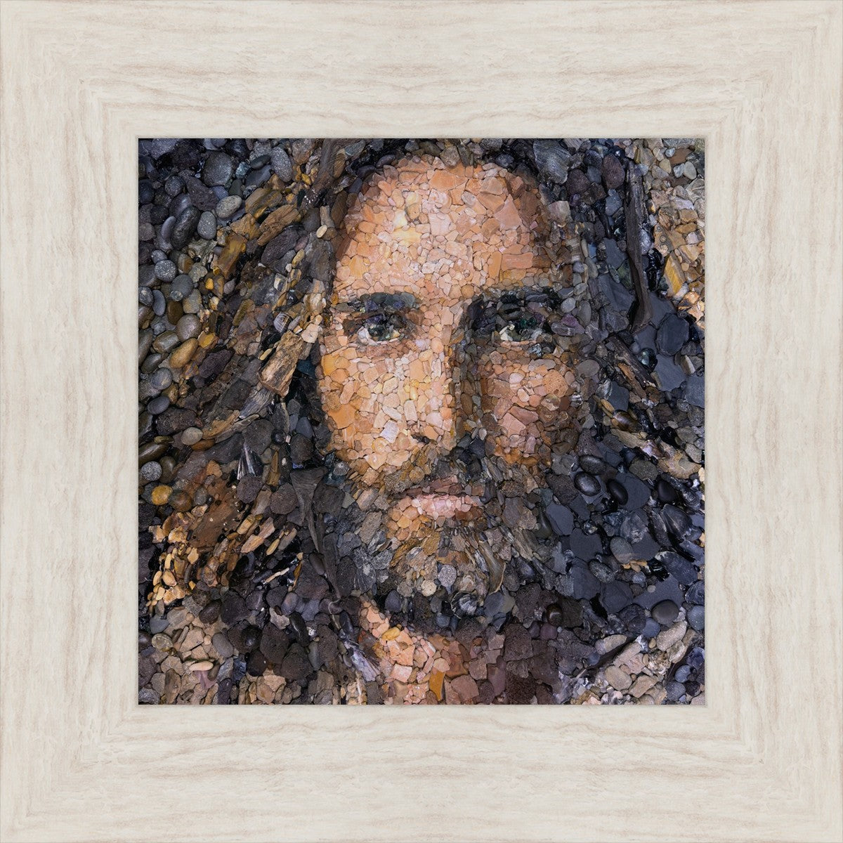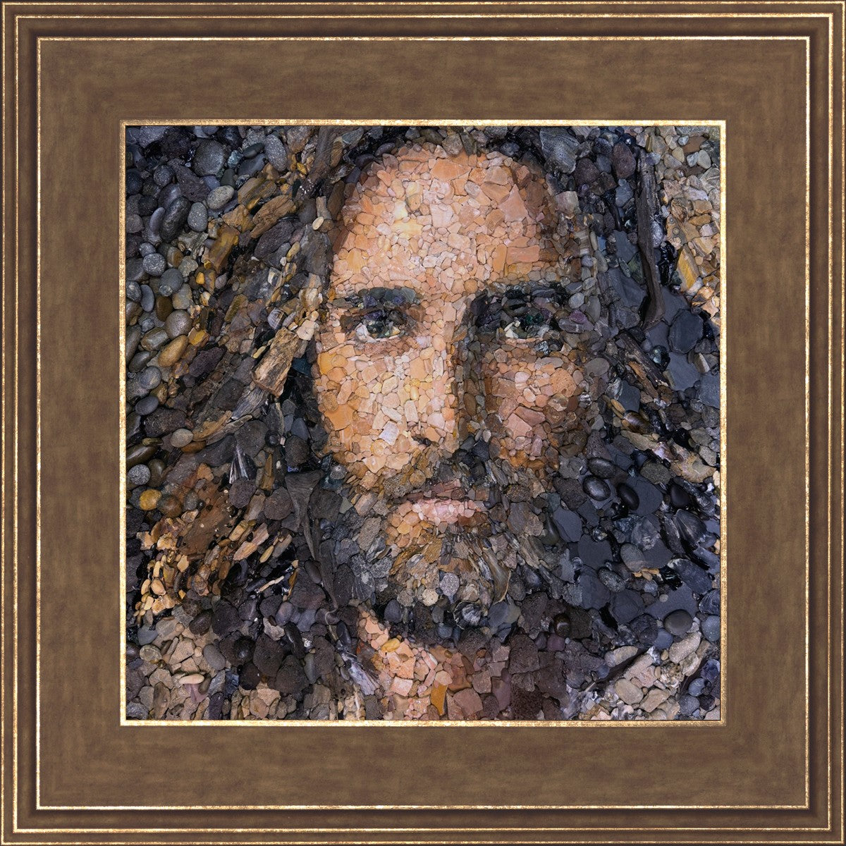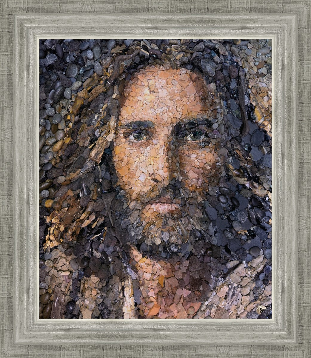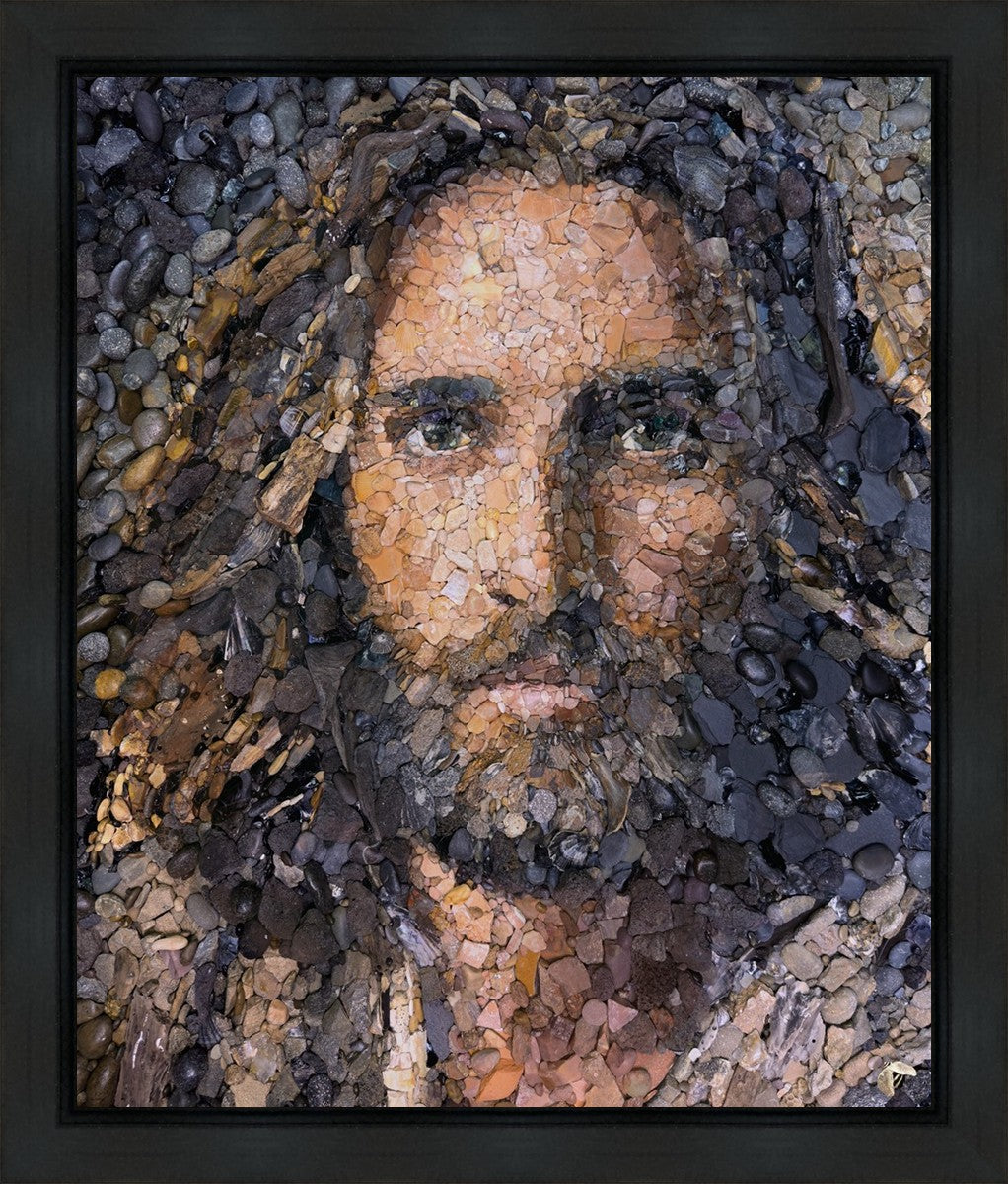 "A Sure Foundation" by Shelby Stroud is a remarkable portrait of Jesus created from a collage of stones, wood, and other earth elements, symbolizing strength and steadfastness. This unique artwork by Shelby Stroud is perfect for Christian homes and spaces, offering a powerful visual representation of faith and resilience.