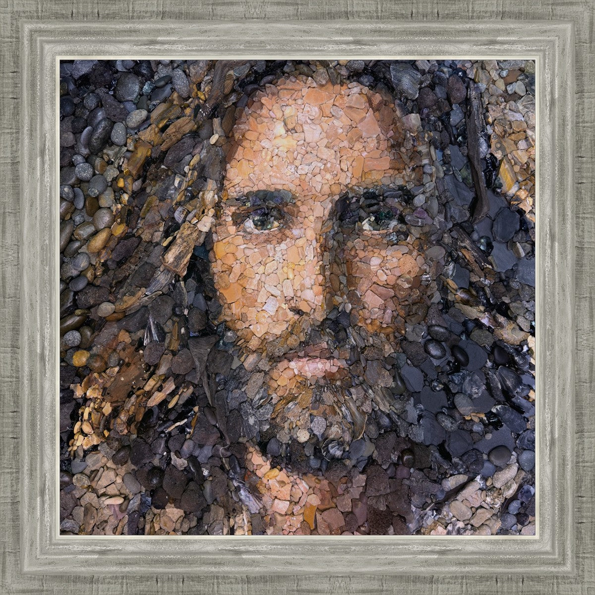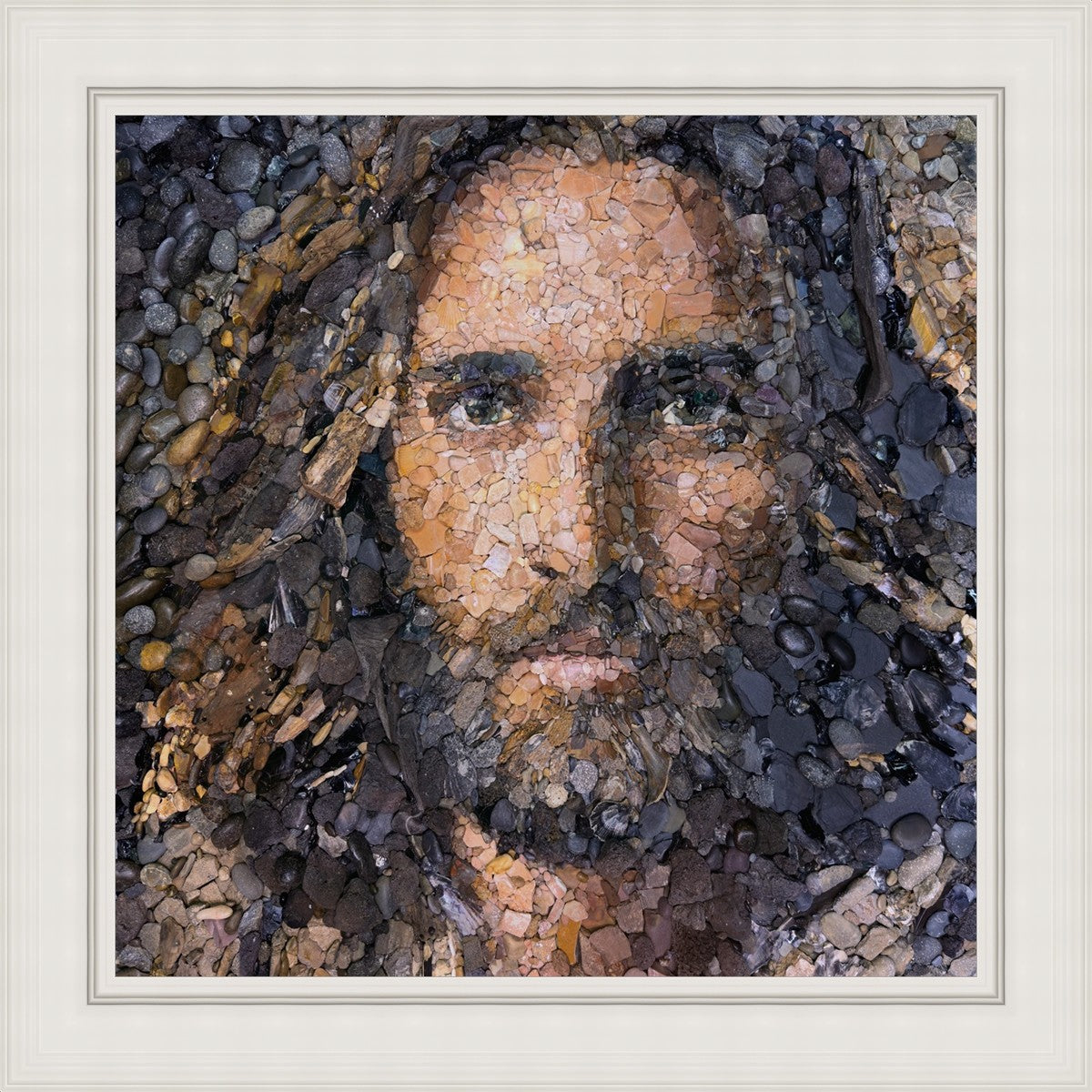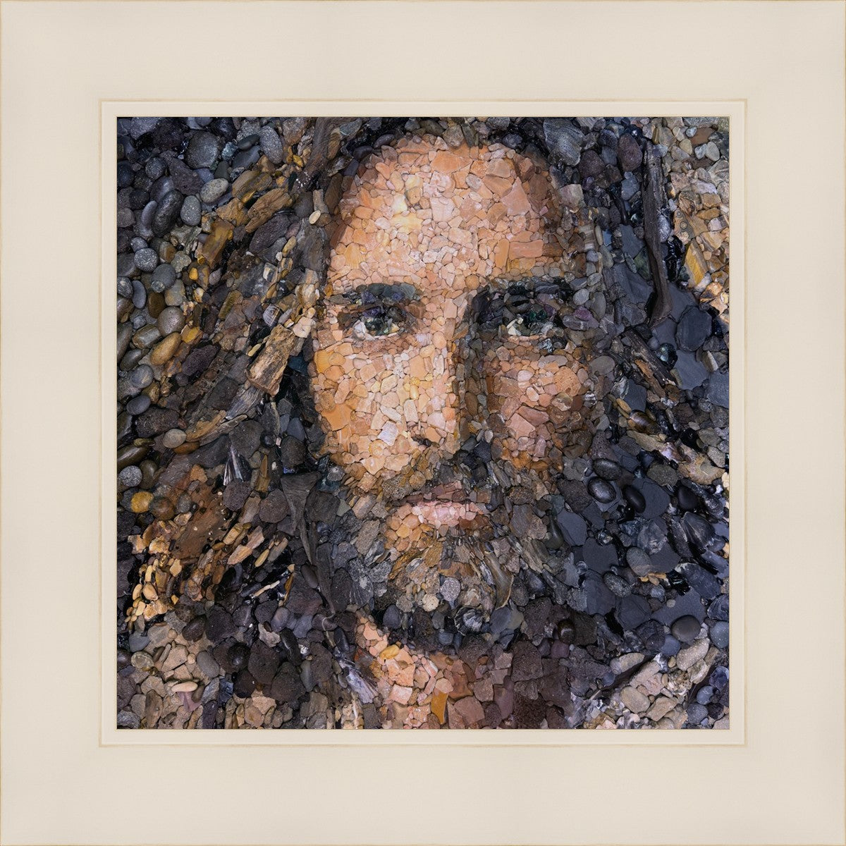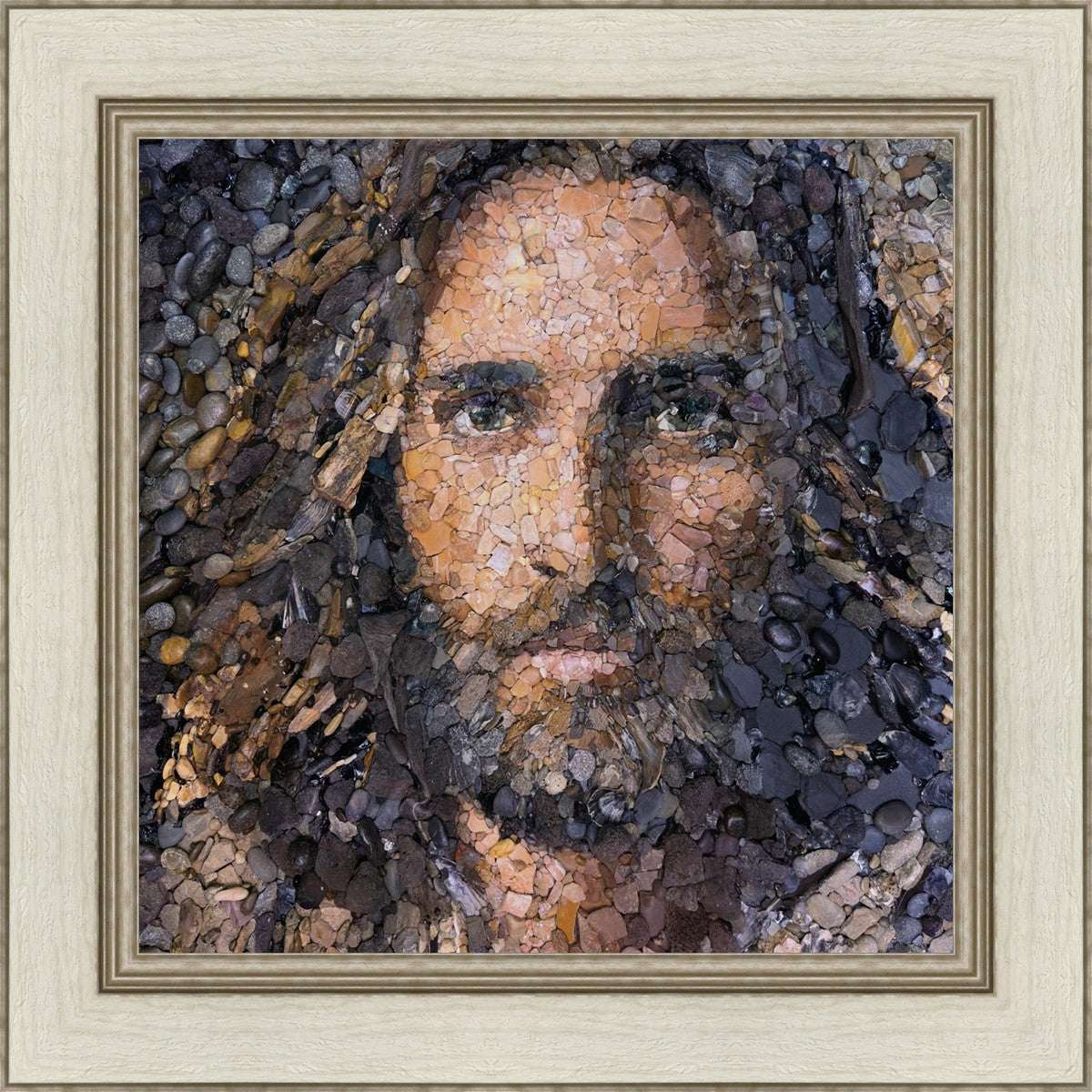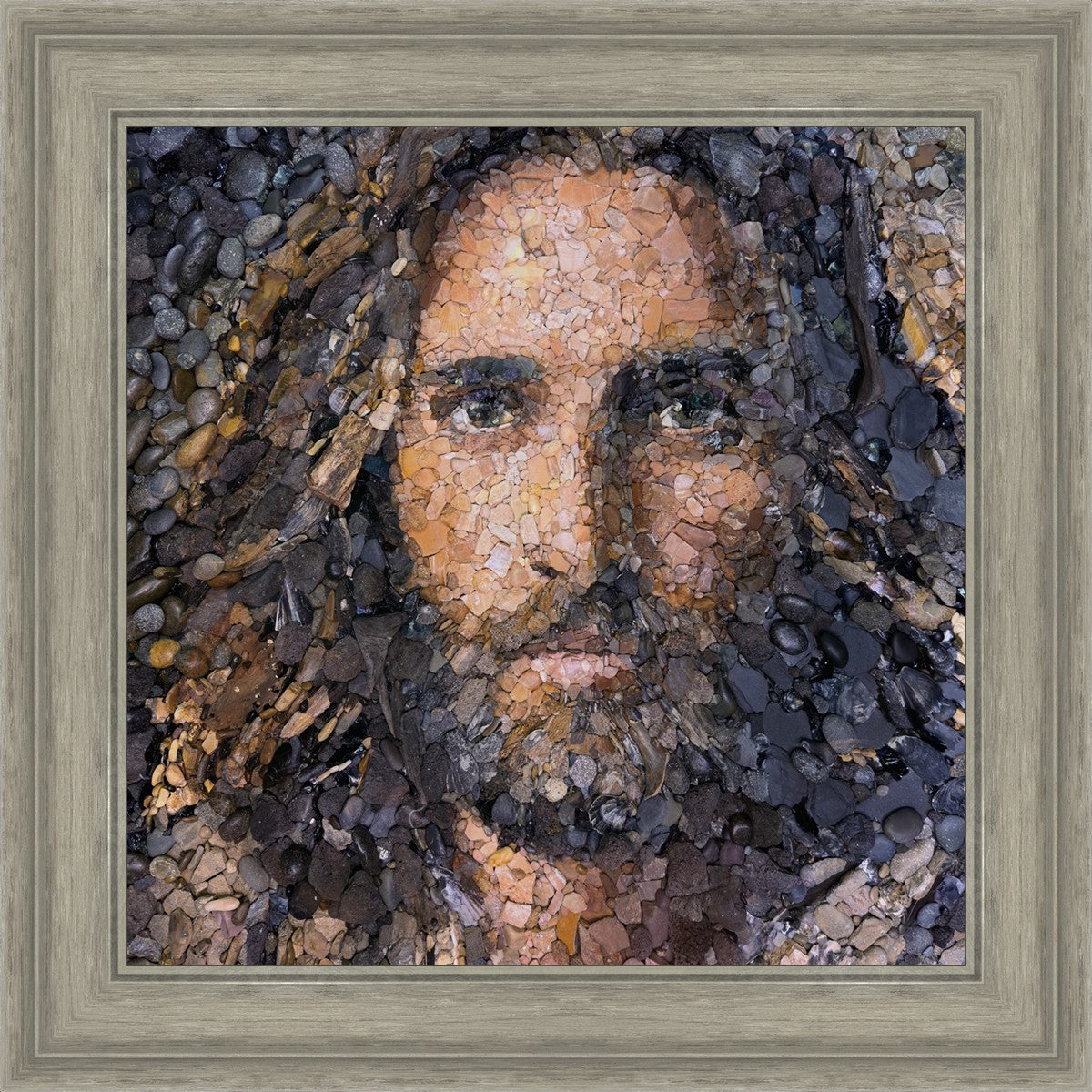 "A Sure Foundation" by Shelby Stroud is a remarkable portrait of Jesus created from a collage of stones, wood, and other earth elements, symbolizing strength and steadfastness. This unique artwork by Shelby Stroud is perfect for Christian homes and spaces, offering a powerful visual representation of faith and resilience.