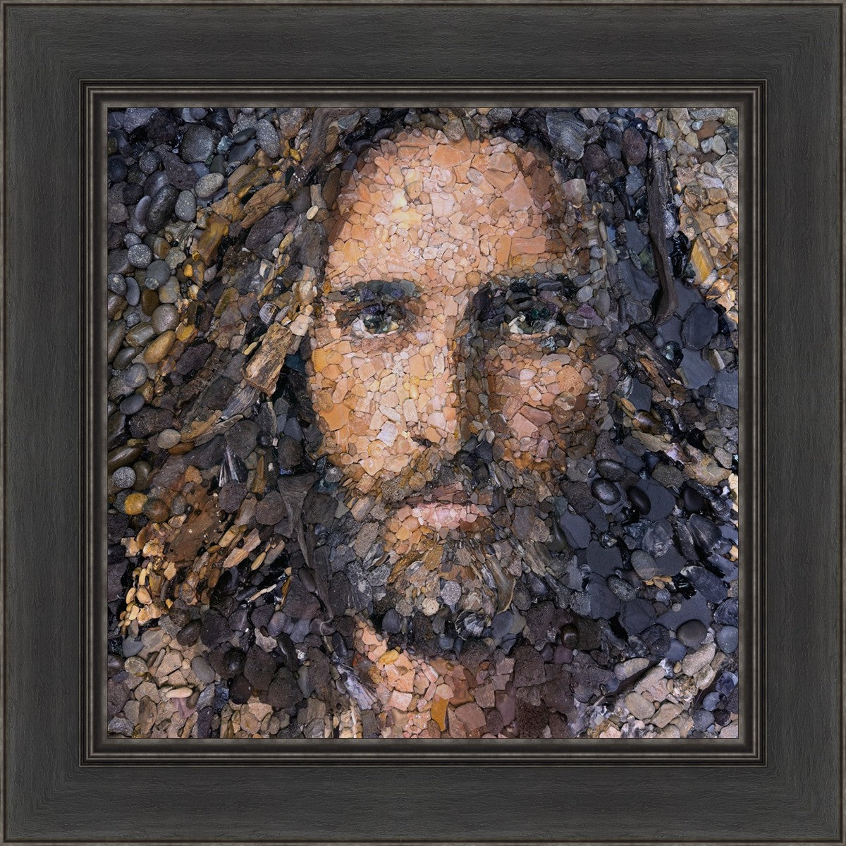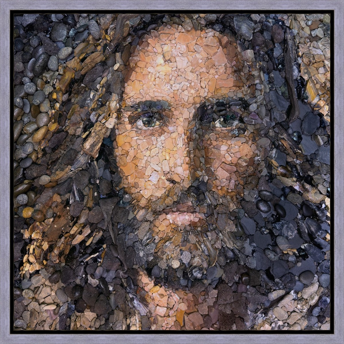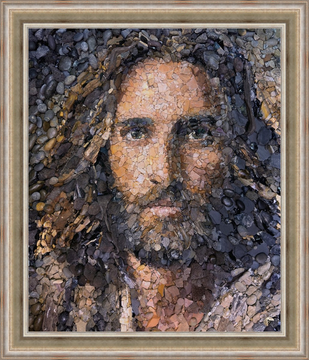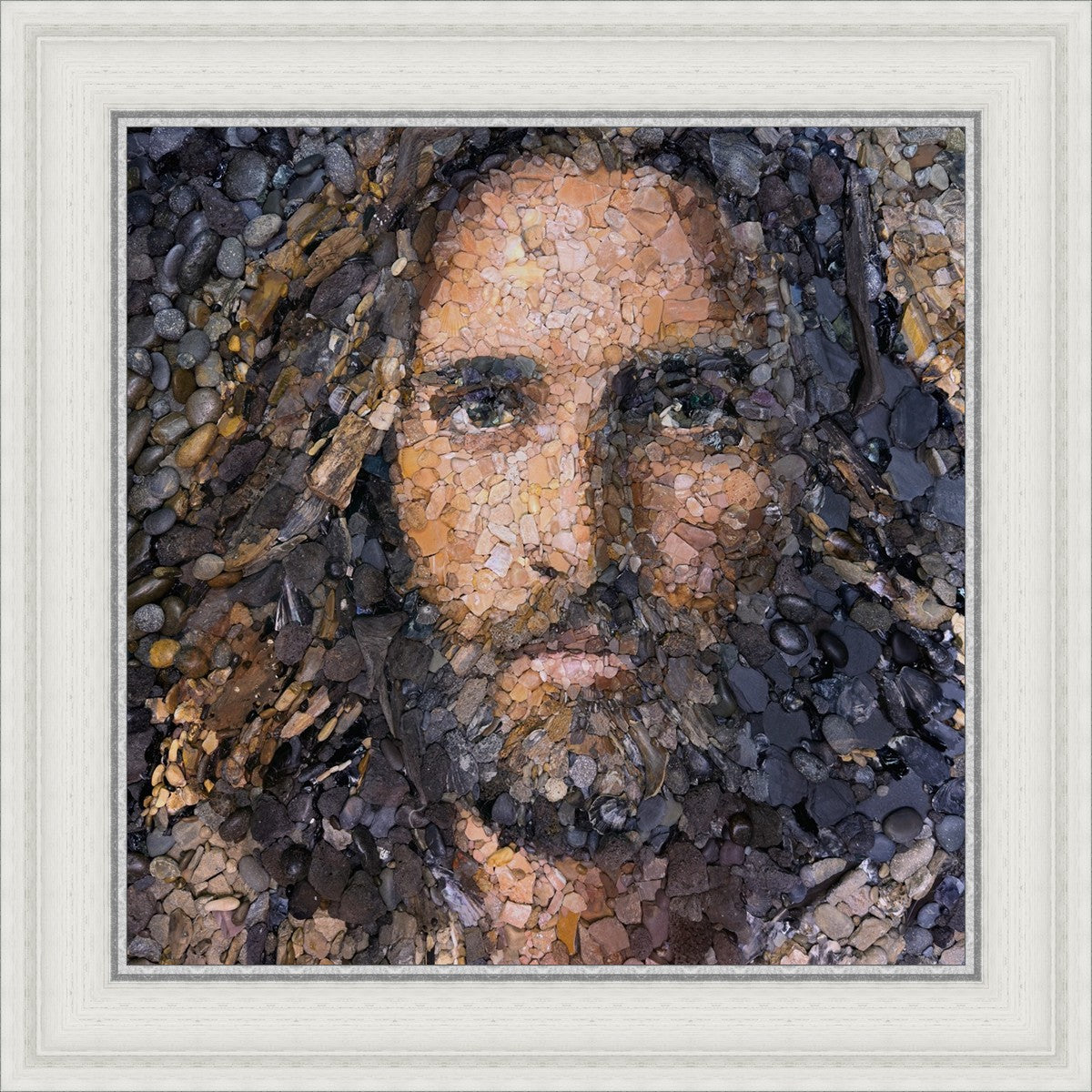 "A Sure Foundation" by Shelby Stroud is a remarkable portrait of Jesus created from a collage of stones, wood, and other earth elements, symbolizing strength and steadfastness. This unique artwork by Shelby Stroud is perfect for Christian homes and spaces, offering a powerful visual representation of faith and resilience.