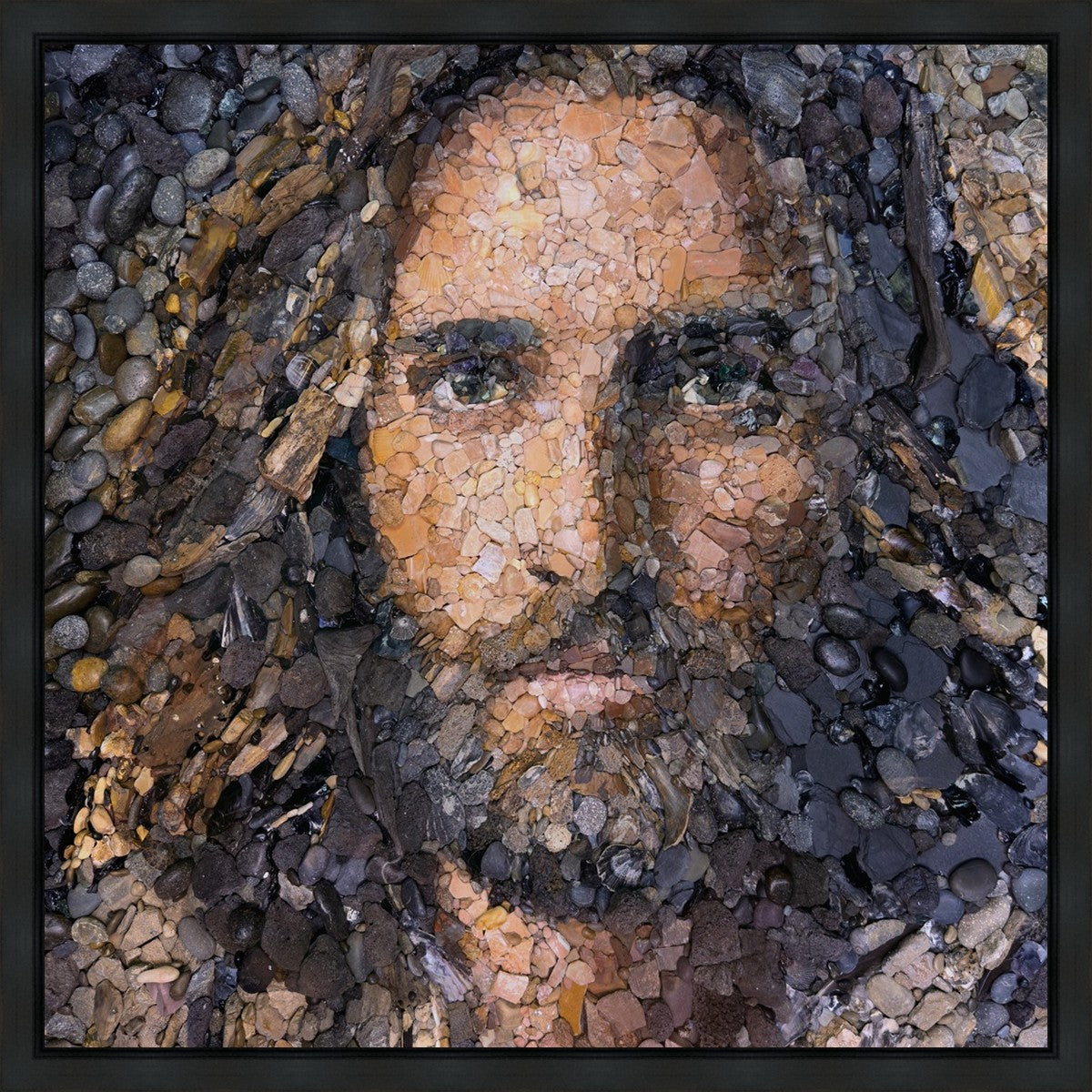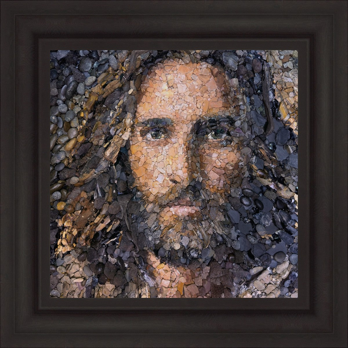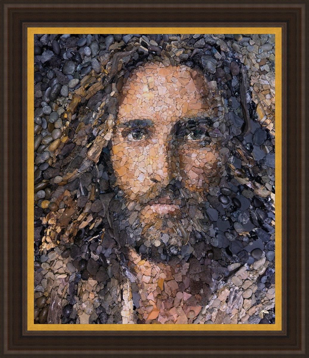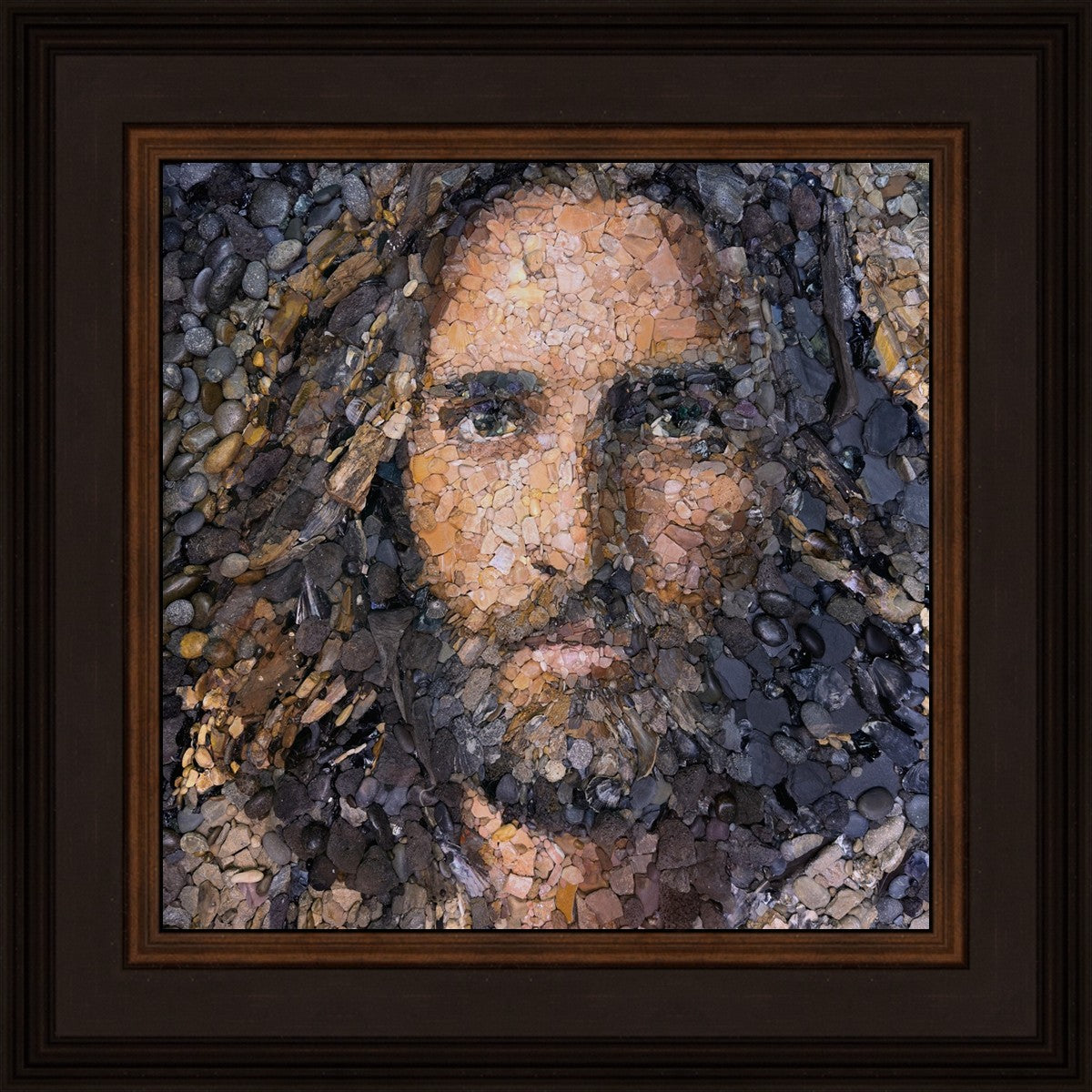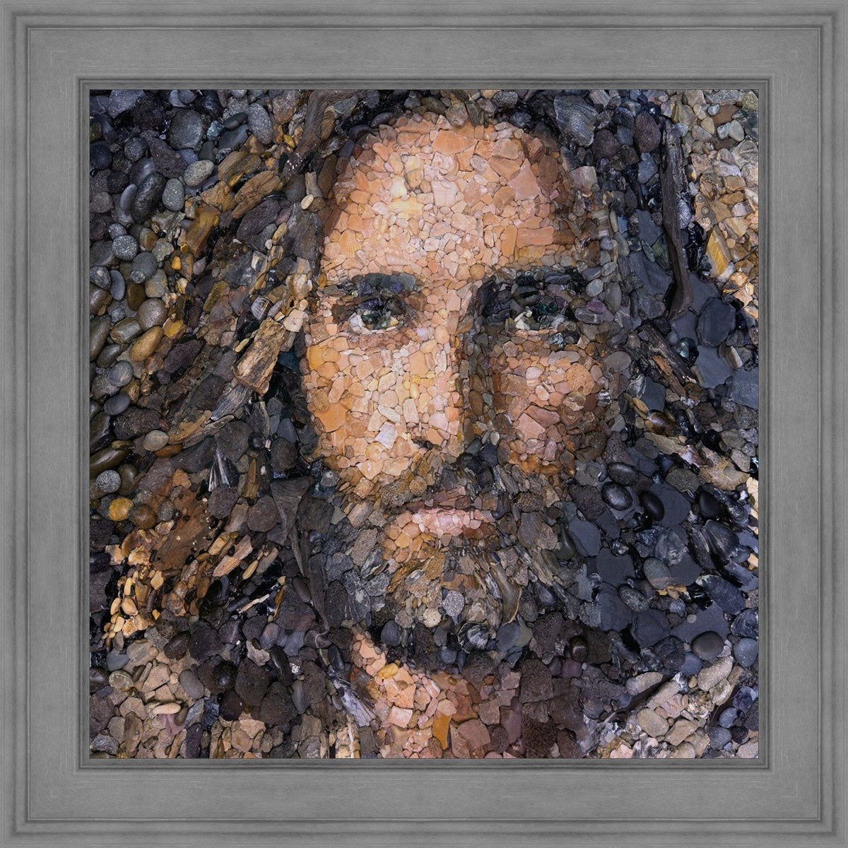 "A Sure Foundation" by Shelby Stroud is a remarkable portrait of Jesus created from a collage of stones, wood, and other earth elements, symbolizing strength and steadfastness. This unique artwork by Shelby Stroud is perfect for Christian homes and spaces, offering a powerful visual representation of faith and resilience.