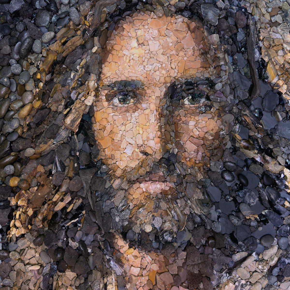 In addition to collecting shells, I have always gathered everything else i found beautiful. My aesthetic could best be described as “natural history museum”. In fourth grade, my friend Jodi and her family took me with them to Slide Rock, AZ and shook their heads as I insisted on bringing home a rock about the size of a phone book because it was the EXACT same color as my skin. Exact! I have fossils, arrowheads, feathers and petrified wood. As i looked over my collection, I knew a portrait of Jesus Christ has to be done out of rocks. He is the Rock of our Salvation, after all.