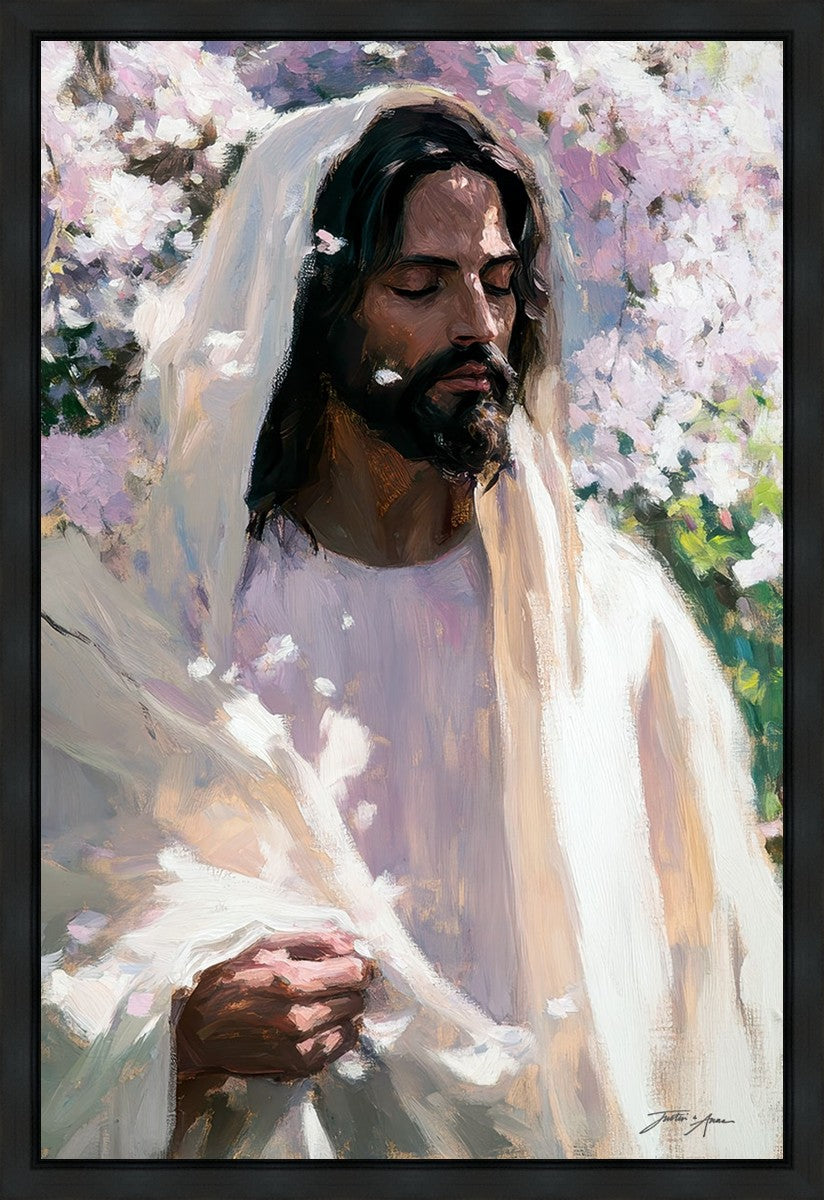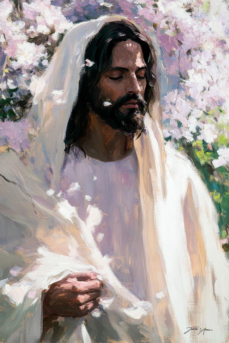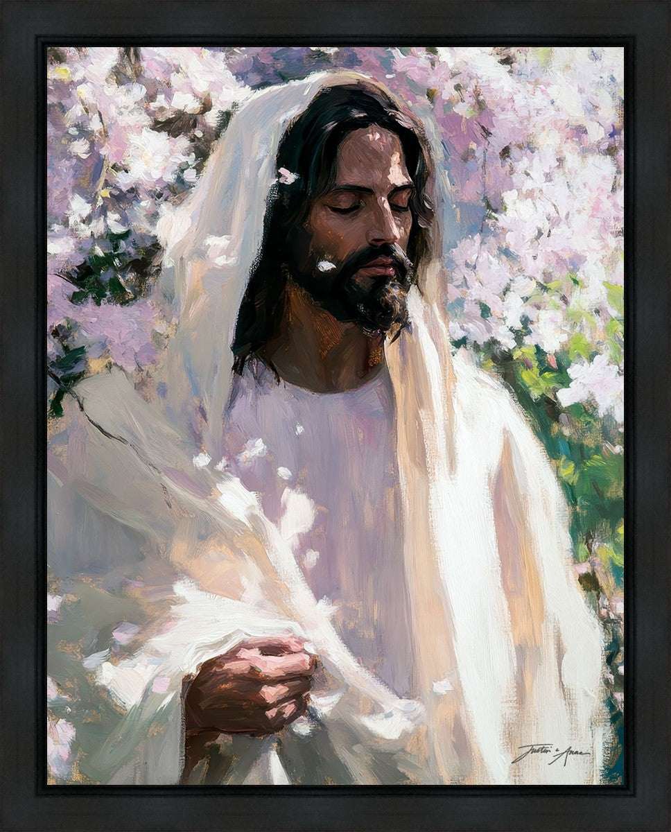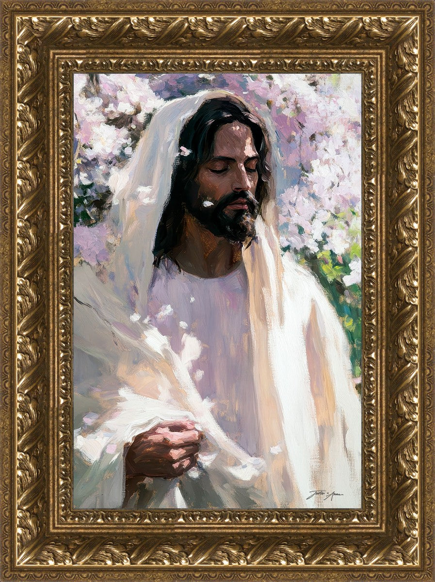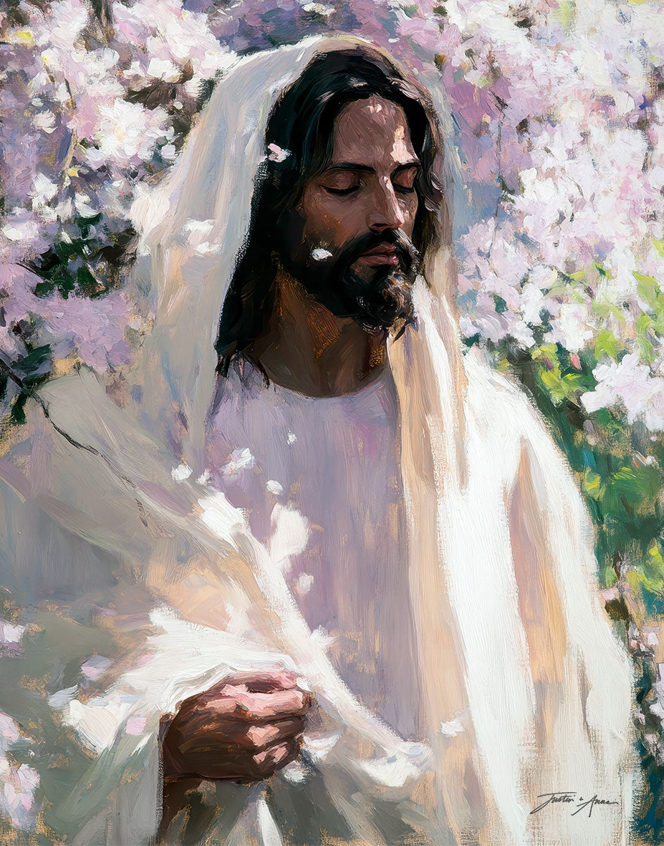With this piece, we wanted to create more than an image—we wanted to capture a setting you can truly feel: the warmth of sunlight on your skin, the sound of a gentle breeze in the trees, and the soft fragrance of blossoms. The Savior often invites His followers to “be still,” and in that stillness, we can find peace in simply abiding with Him.