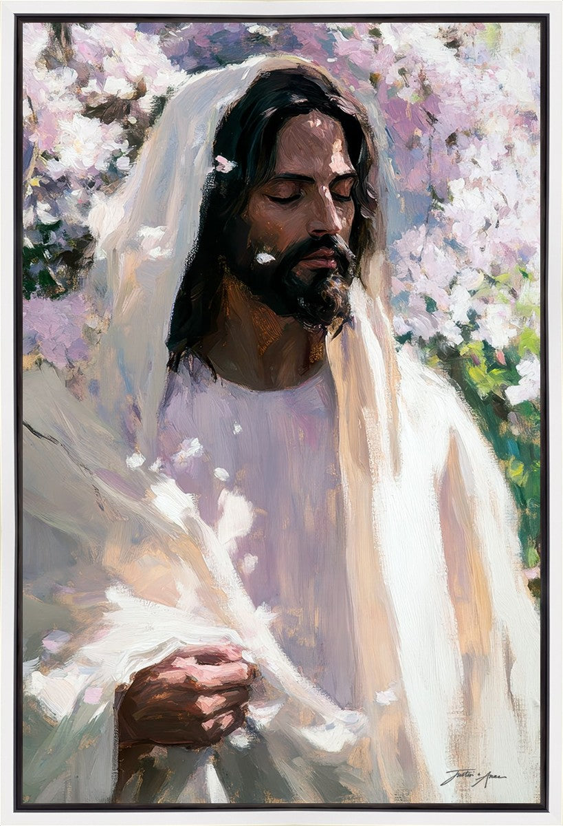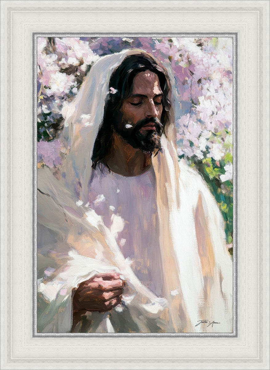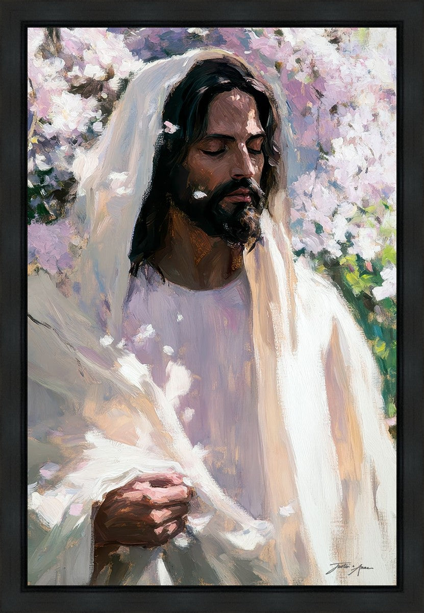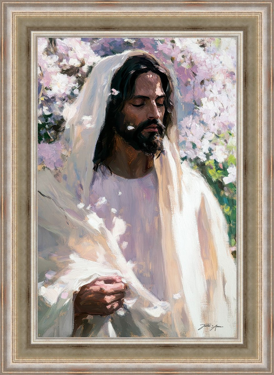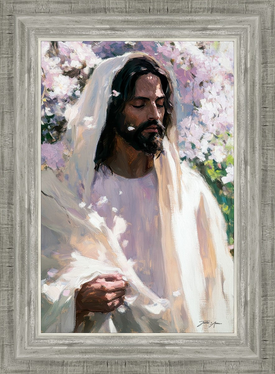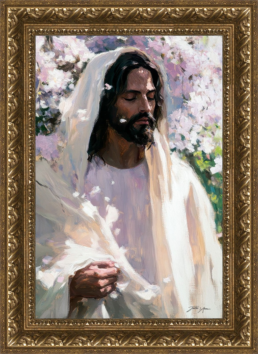 With this piece, we wanted to create more than an image—we wanted to capture a setting you can truly feel: the warmth of sunlight on your skin, the sound of a gentle breeze in the trees, and the soft fragrance of blossoms. The Savior often invites His followers to “be still,” and in that stillness, we can find peace in simply abiding with Him.