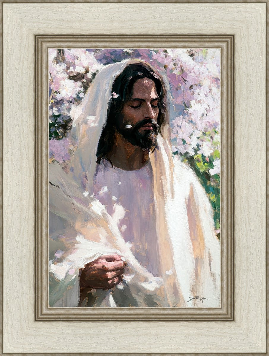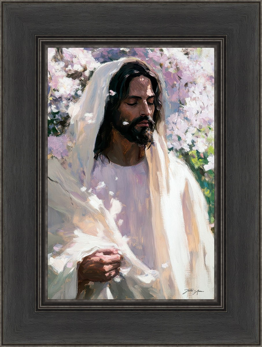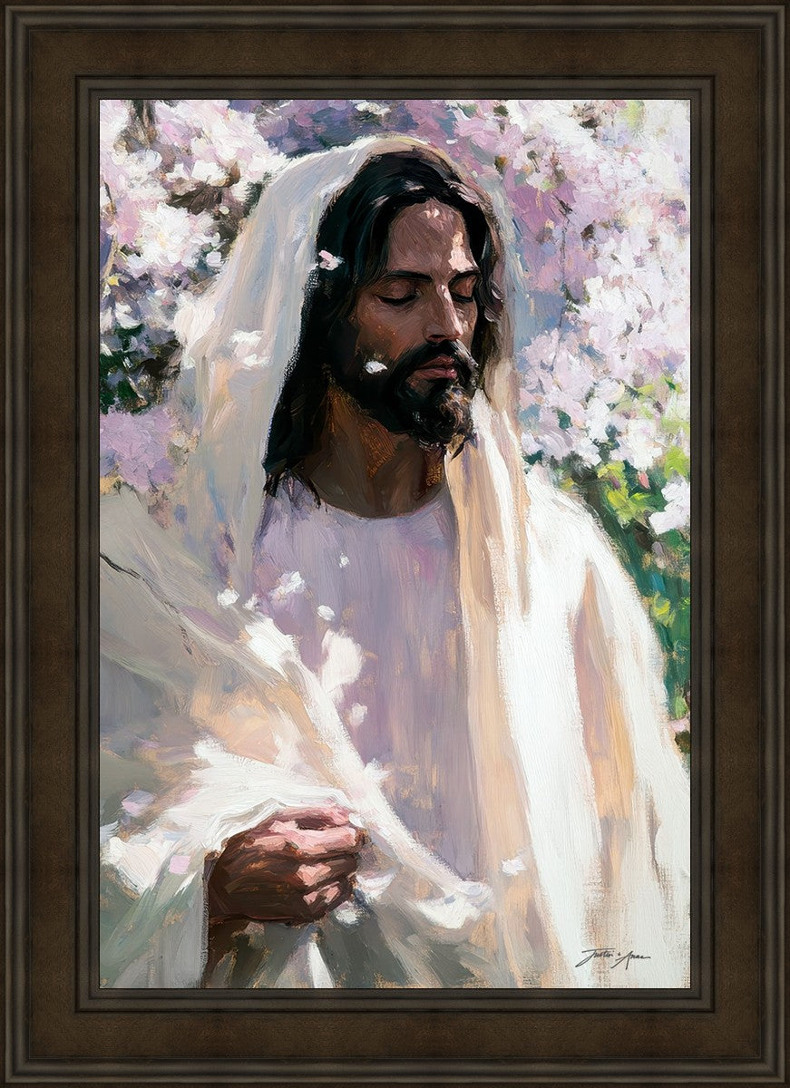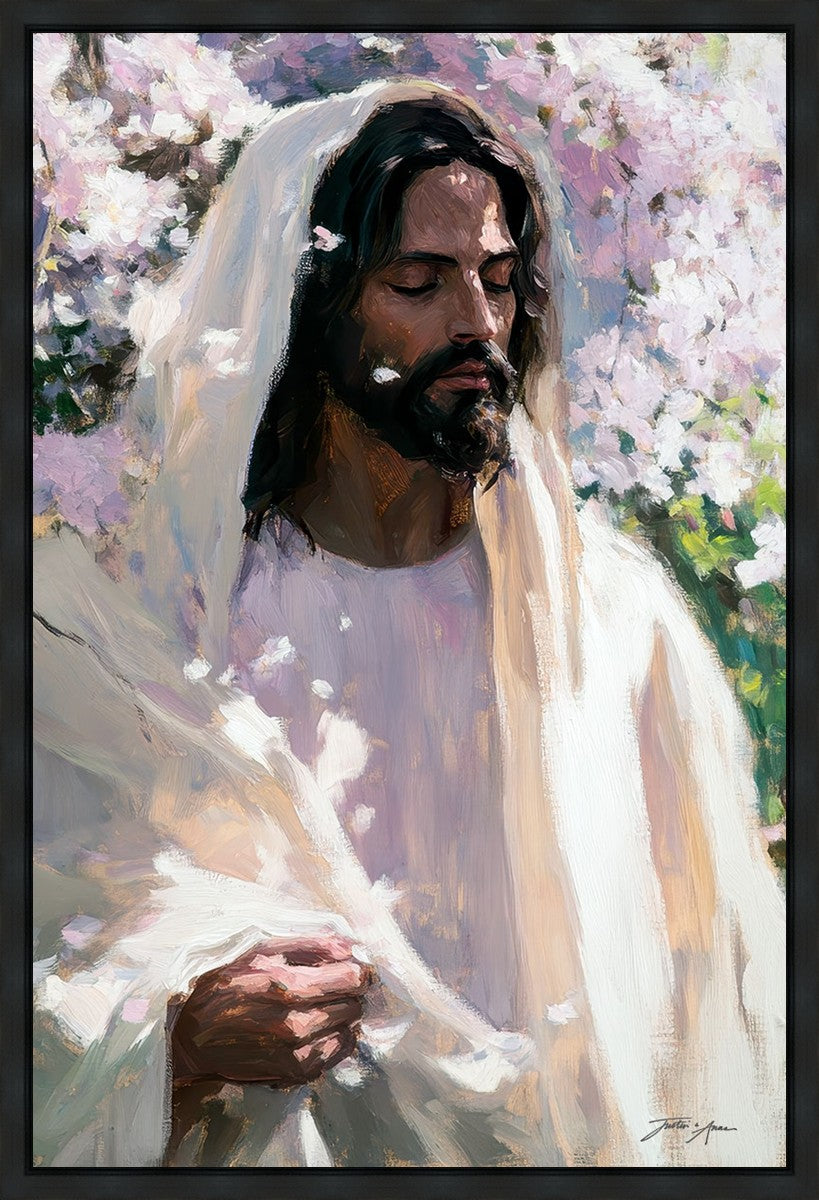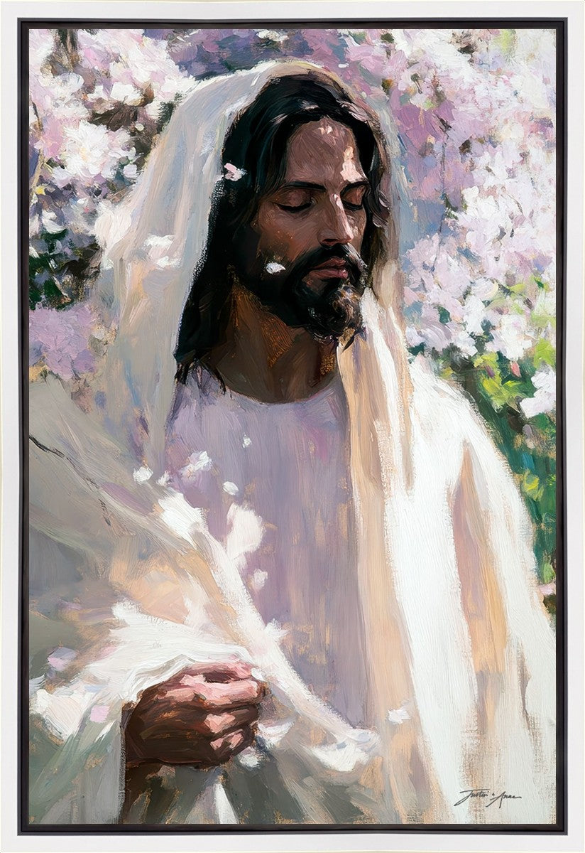 With this piece, we wanted to create more than an image—we wanted to capture a setting you can truly feel: the warmth of sunlight on your skin, the sound of a gentle breeze in the trees, and the soft fragrance of blossoms. The Savior often invites His followers to “be still,” and in that stillness, we can find peace in simply abiding with Him.