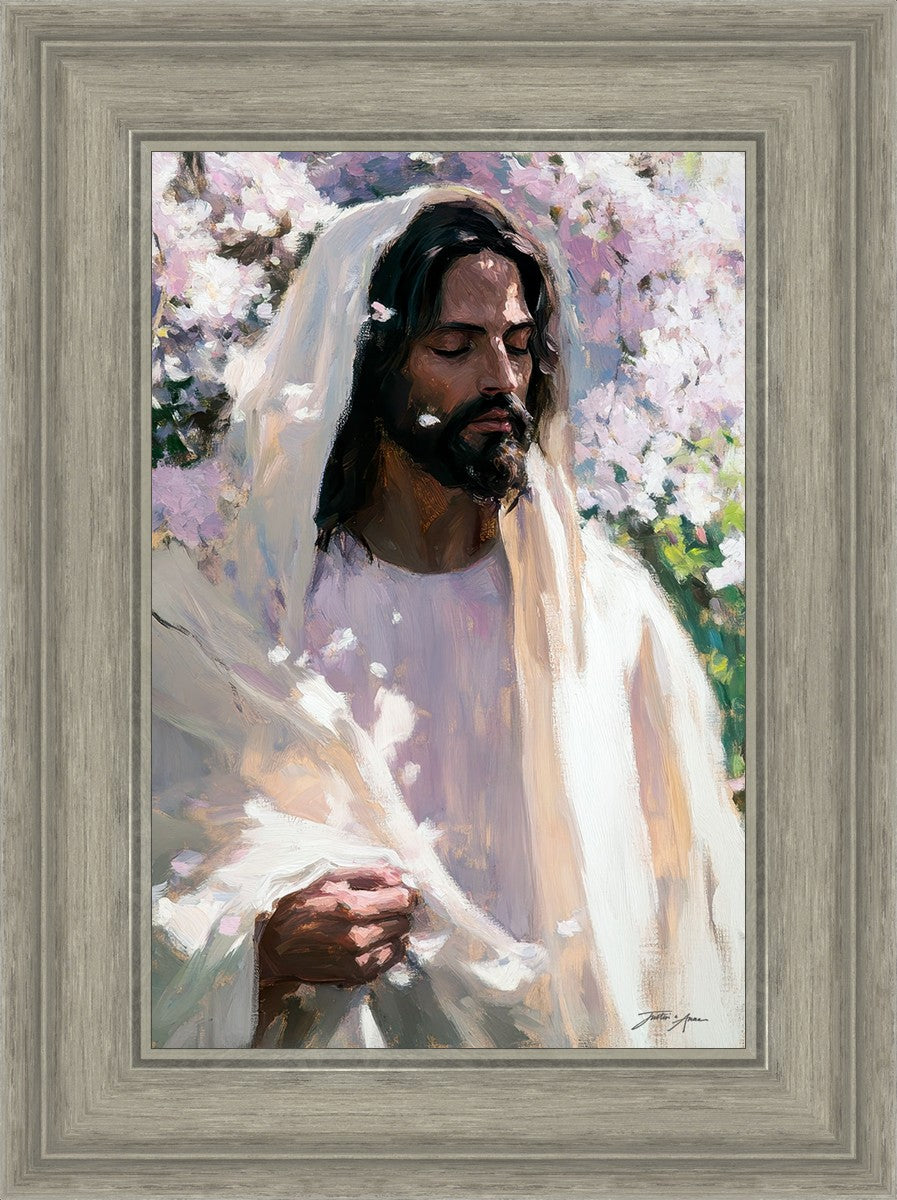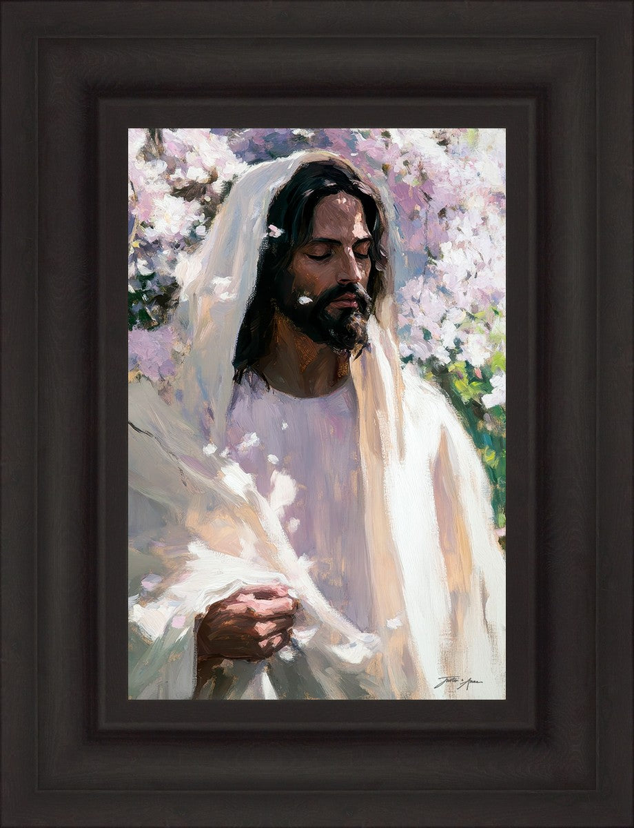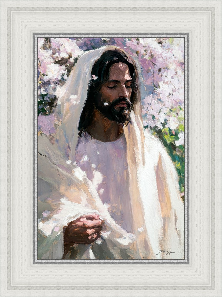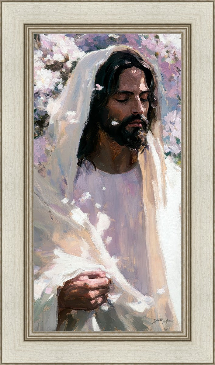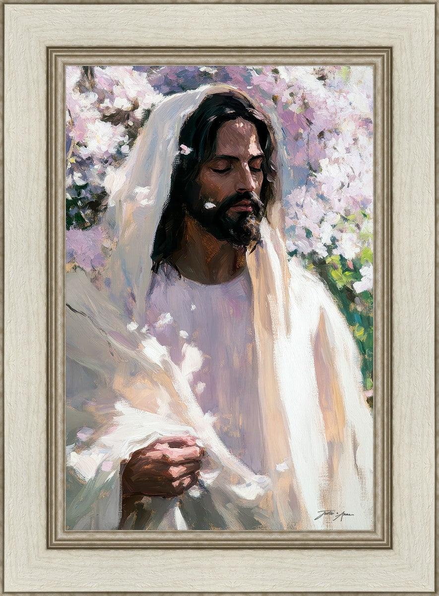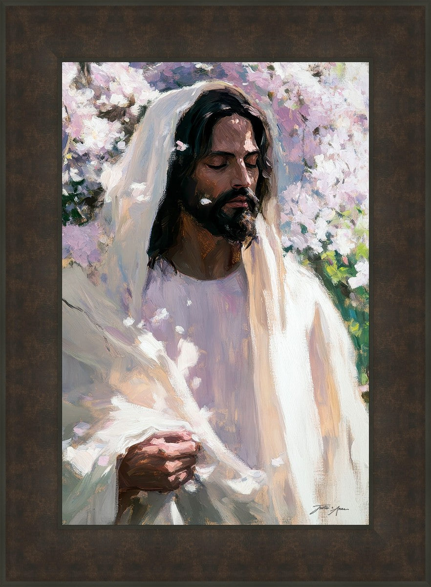 With this piece, we wanted to create more than an image—we wanted to capture a setting you can truly feel: the warmth of sunlight on your skin, the sound of a gentle breeze in the trees, and the soft fragrance of blossoms. The Savior often invites His followers to “be still,” and in that stillness, we can find peace in simply abiding with Him.