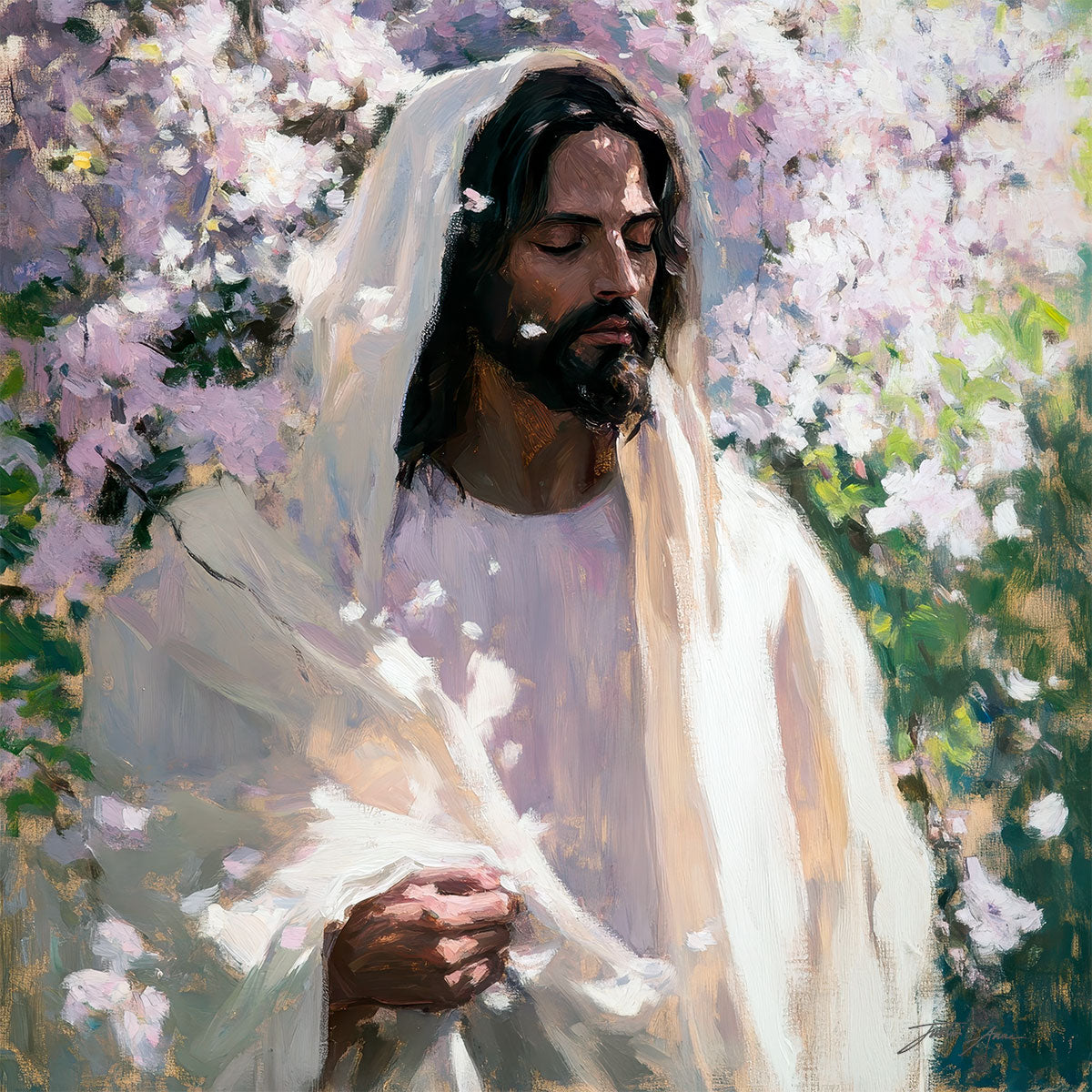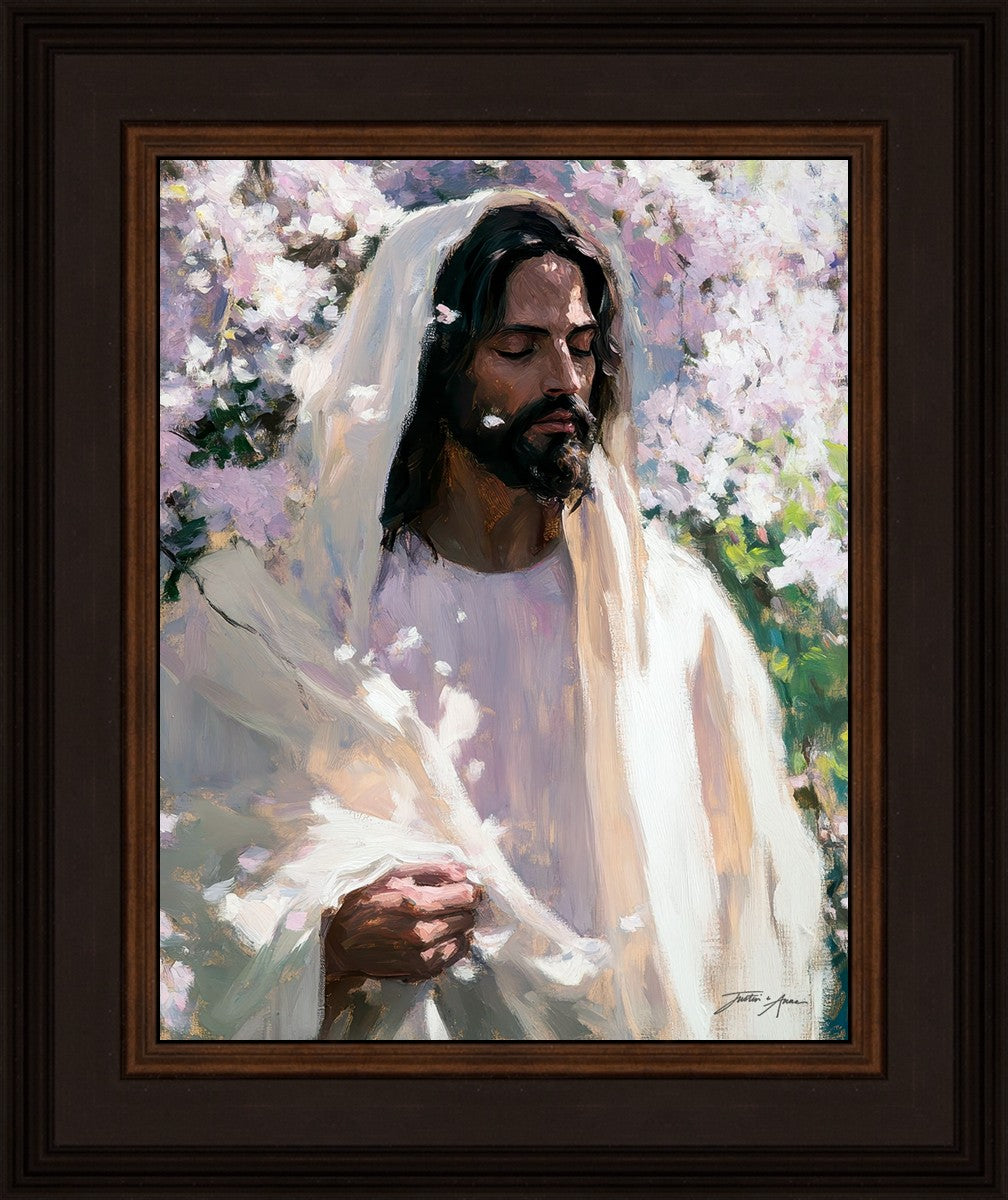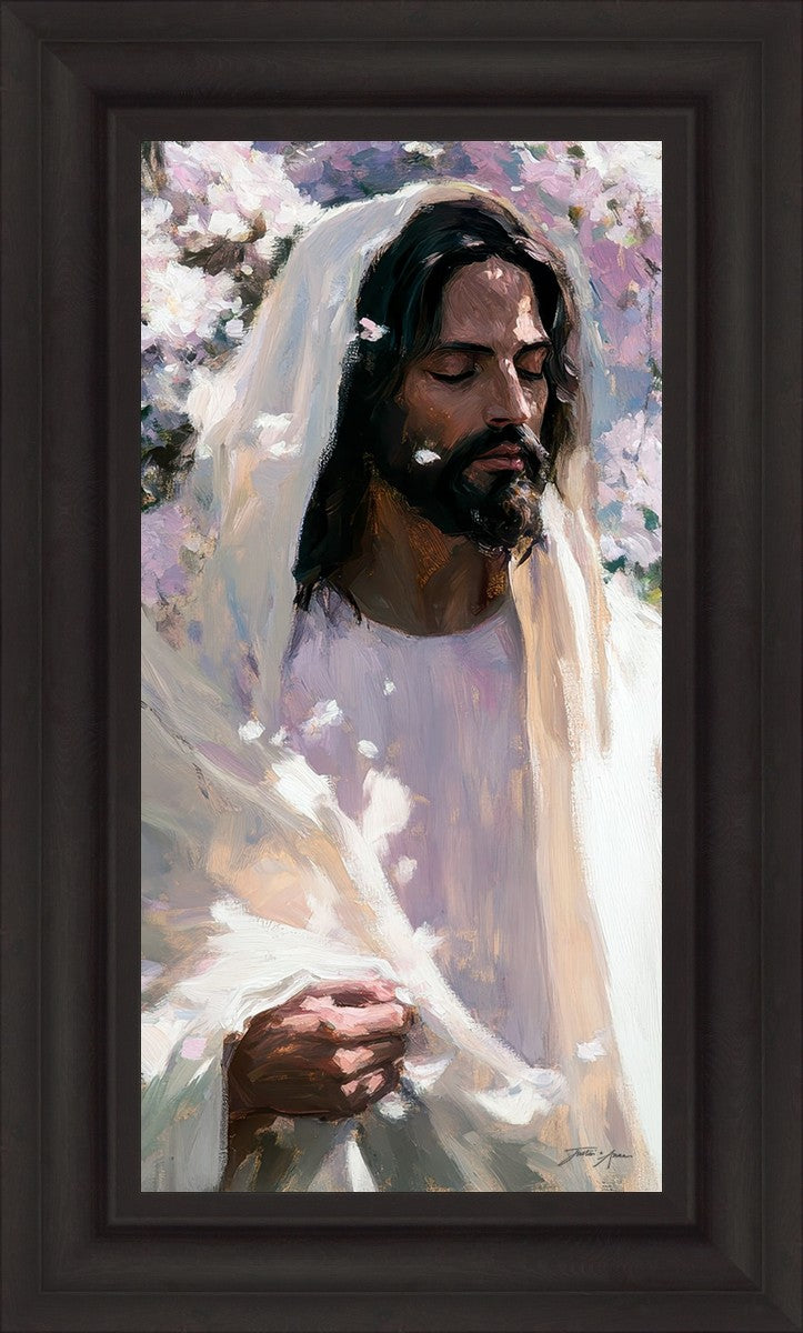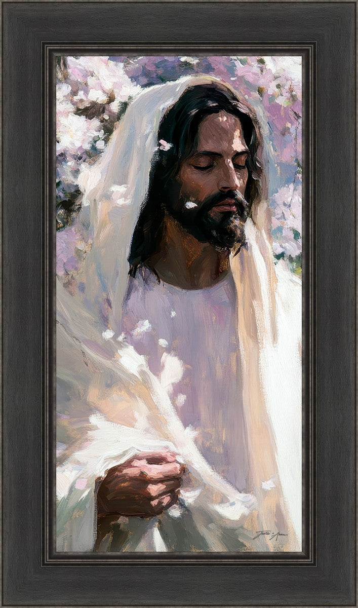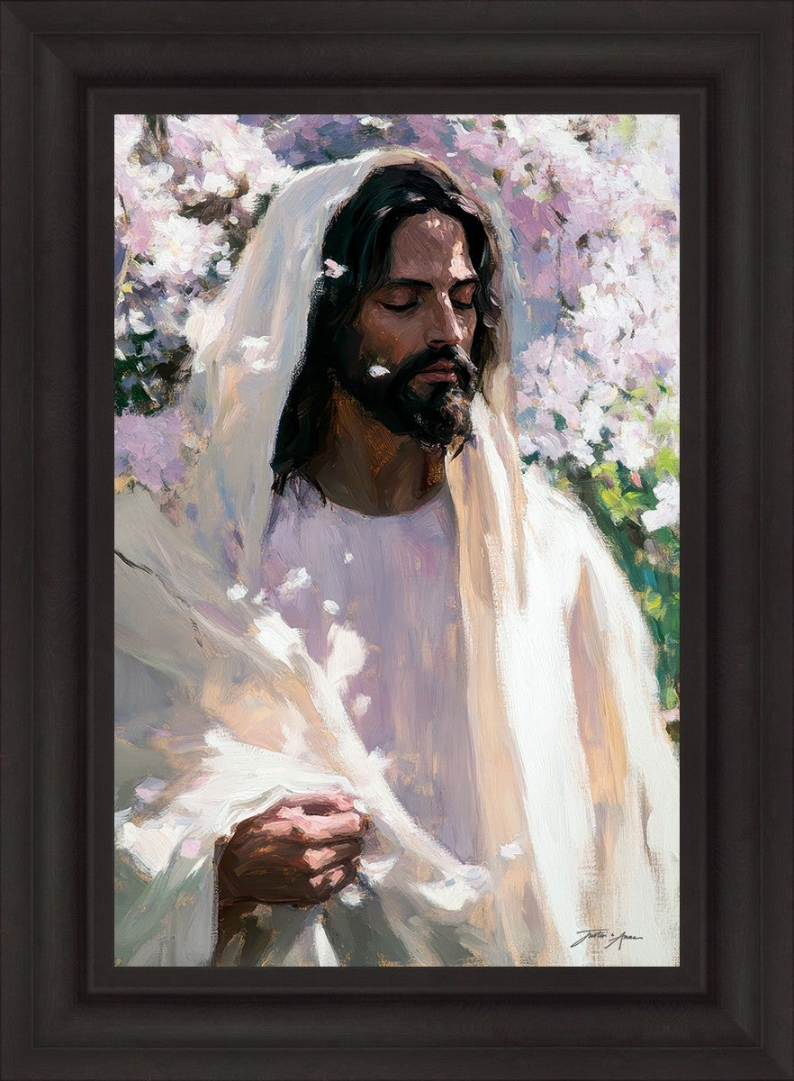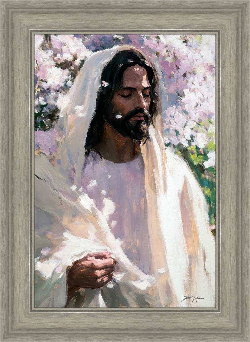 With this piece, we wanted to create more than an image—we wanted to capture a setting you can truly feel: the warmth of sunlight on your skin, the sound of a gentle breeze in the trees, and the soft fragrance of blossoms. The Savior often invites His followers to “be still,” and in that stillness, we can find peace in simply abiding with Him.
