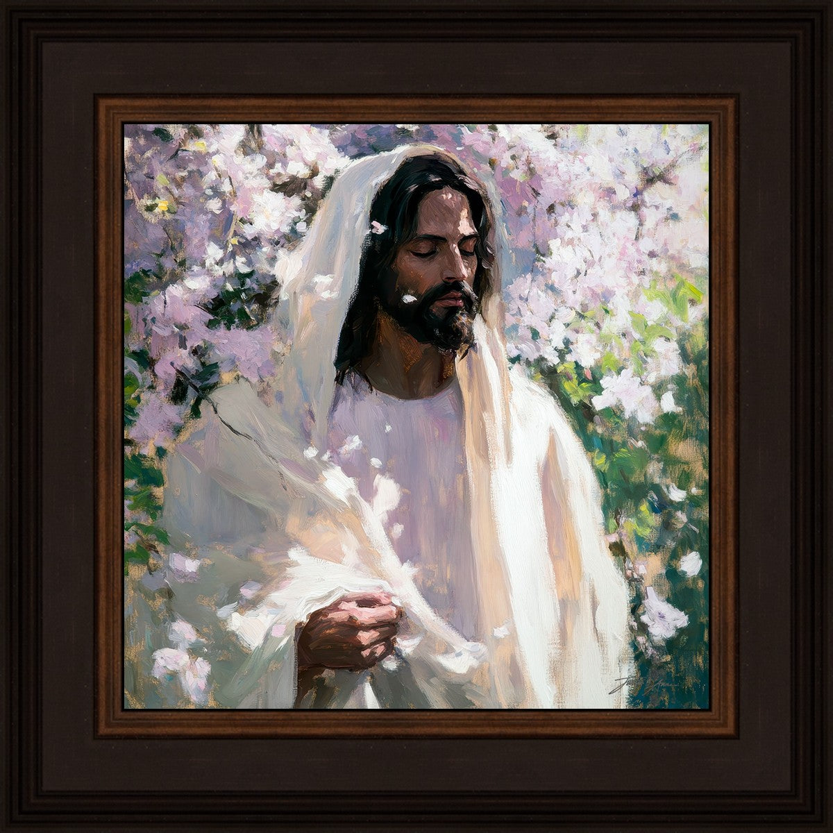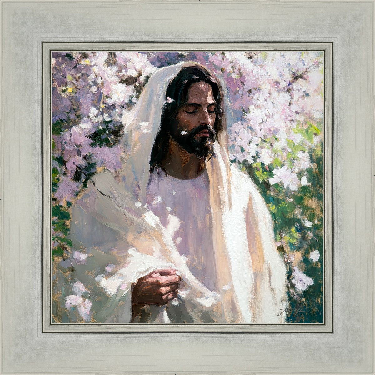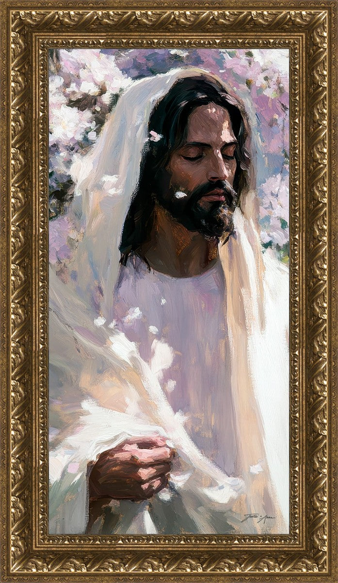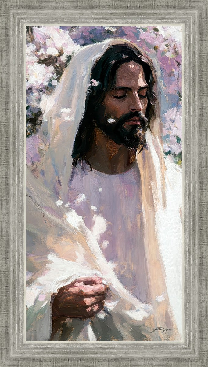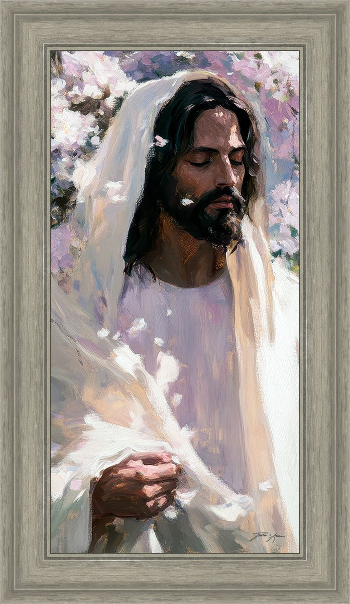 With this piece, we wanted to create more than an image—we wanted to capture a setting you can truly feel: the warmth of sunlight on your skin, the sound of a gentle breeze in the trees, and the soft fragrance of blossoms. The Savior often invites His followers to “be still,” and in that stillness, we can find peace in simply abiding with Him.