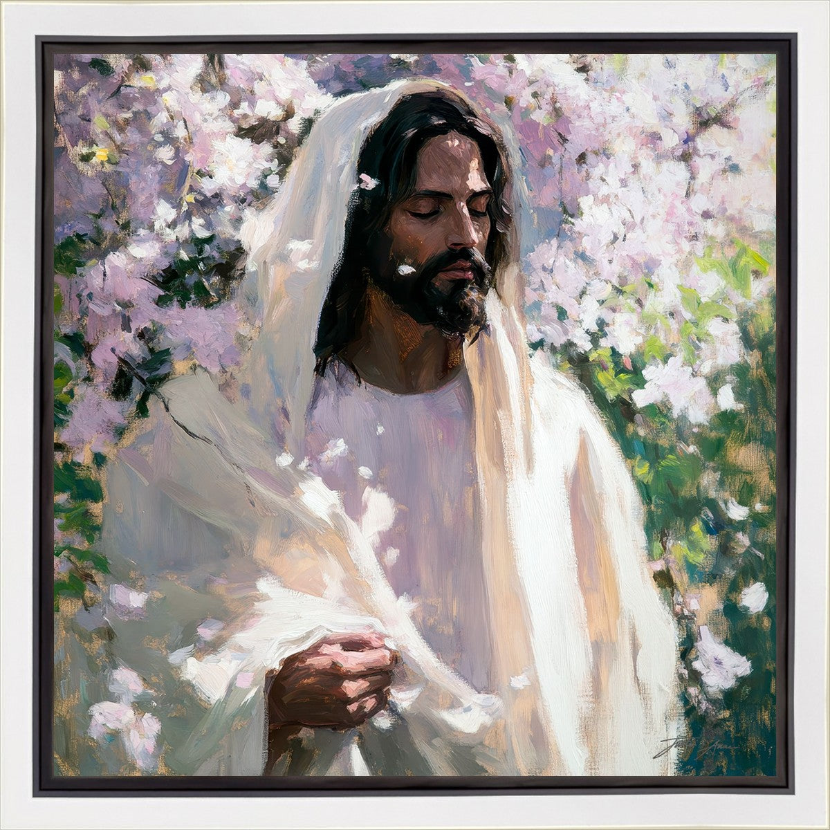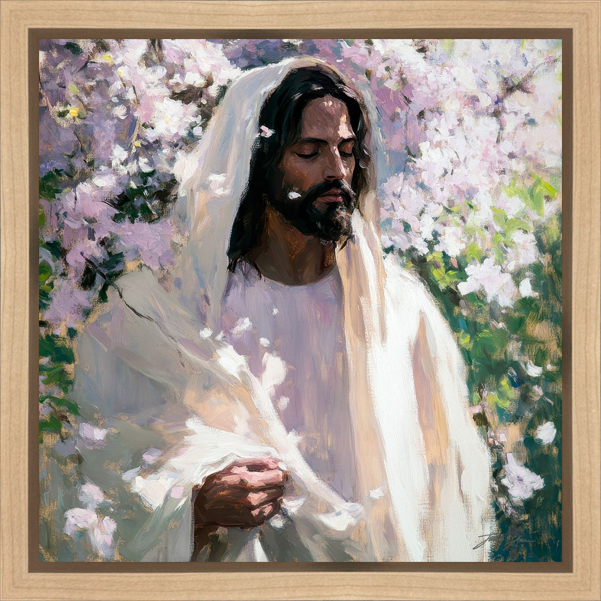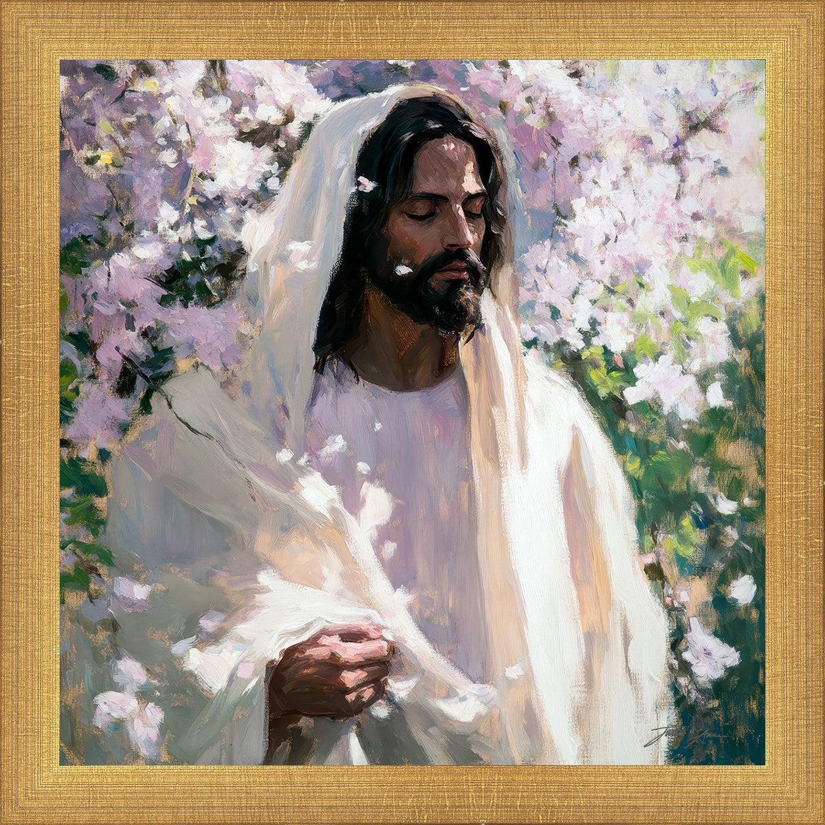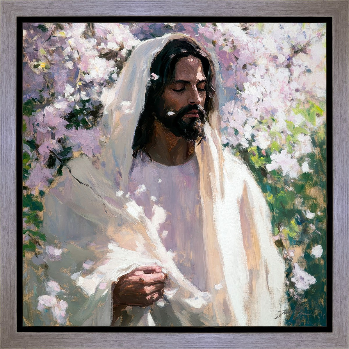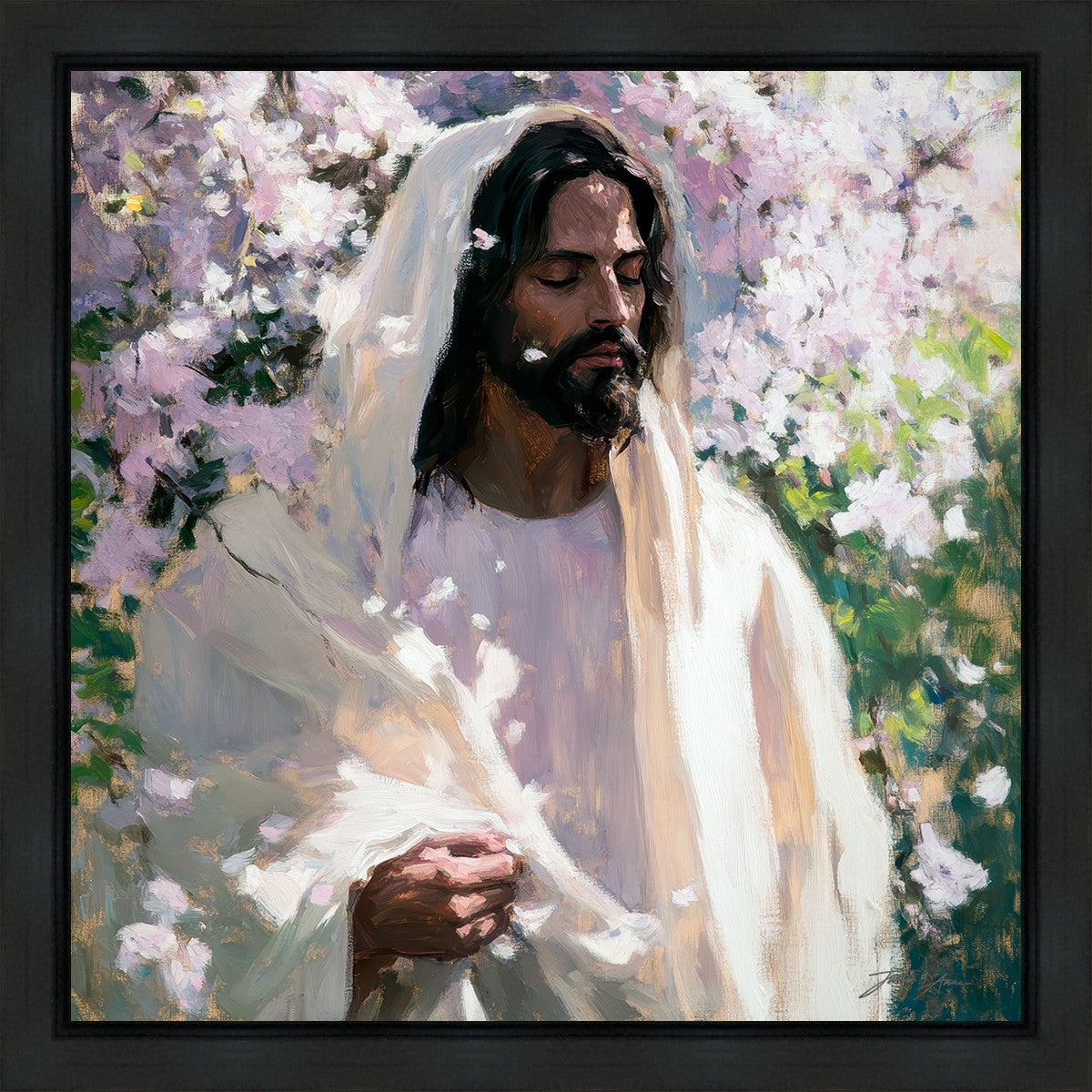 With this piece, we wanted to create more than an image—we wanted to capture a setting you can truly feel: the warmth of sunlight on your skin, the sound of a gentle breeze in the trees, and the soft fragrance of blossoms. The Savior often invites His followers to “be still,” and in that stillness, we can find peace in simply abiding with Him.