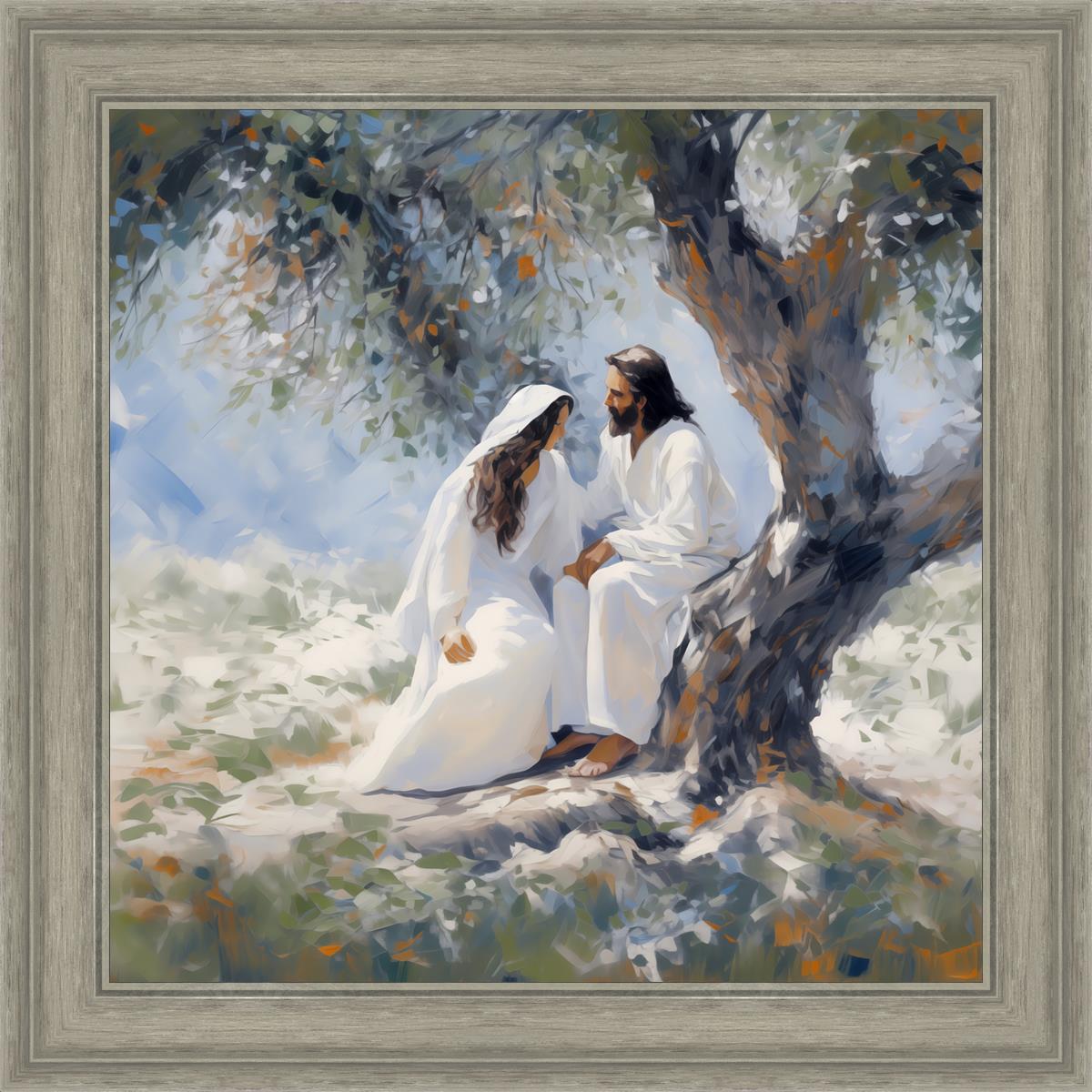 In this image, I wanted to depict Christ in the Garden with a woman, any woman, who would accept his sacrifice. It could be Mary Magdalene or it could be you. I believe that the image of those who would accept his message strengthened him as he bore our afflictions and carried our burdens.