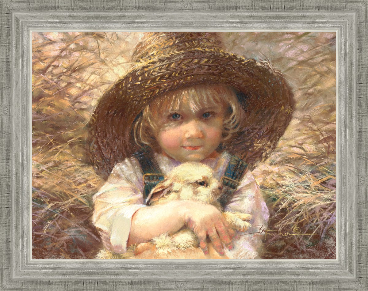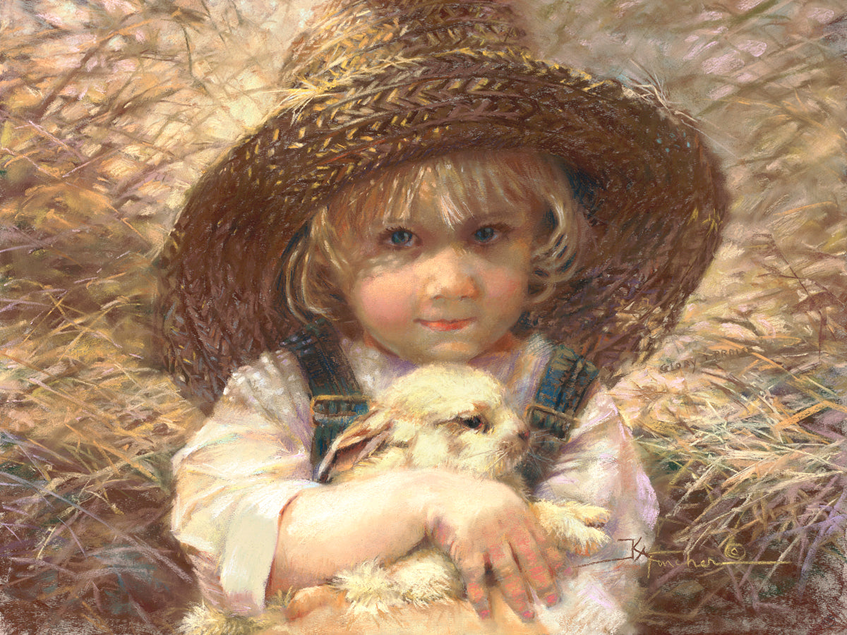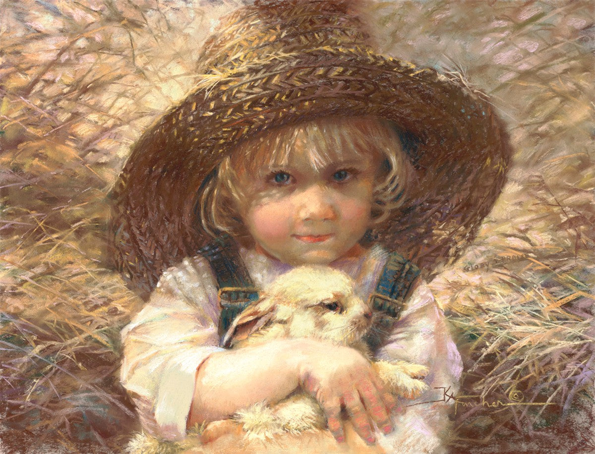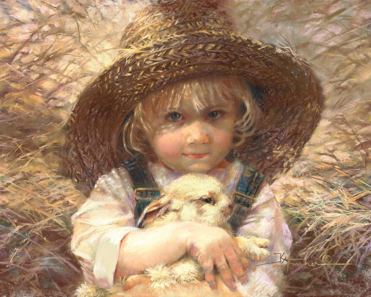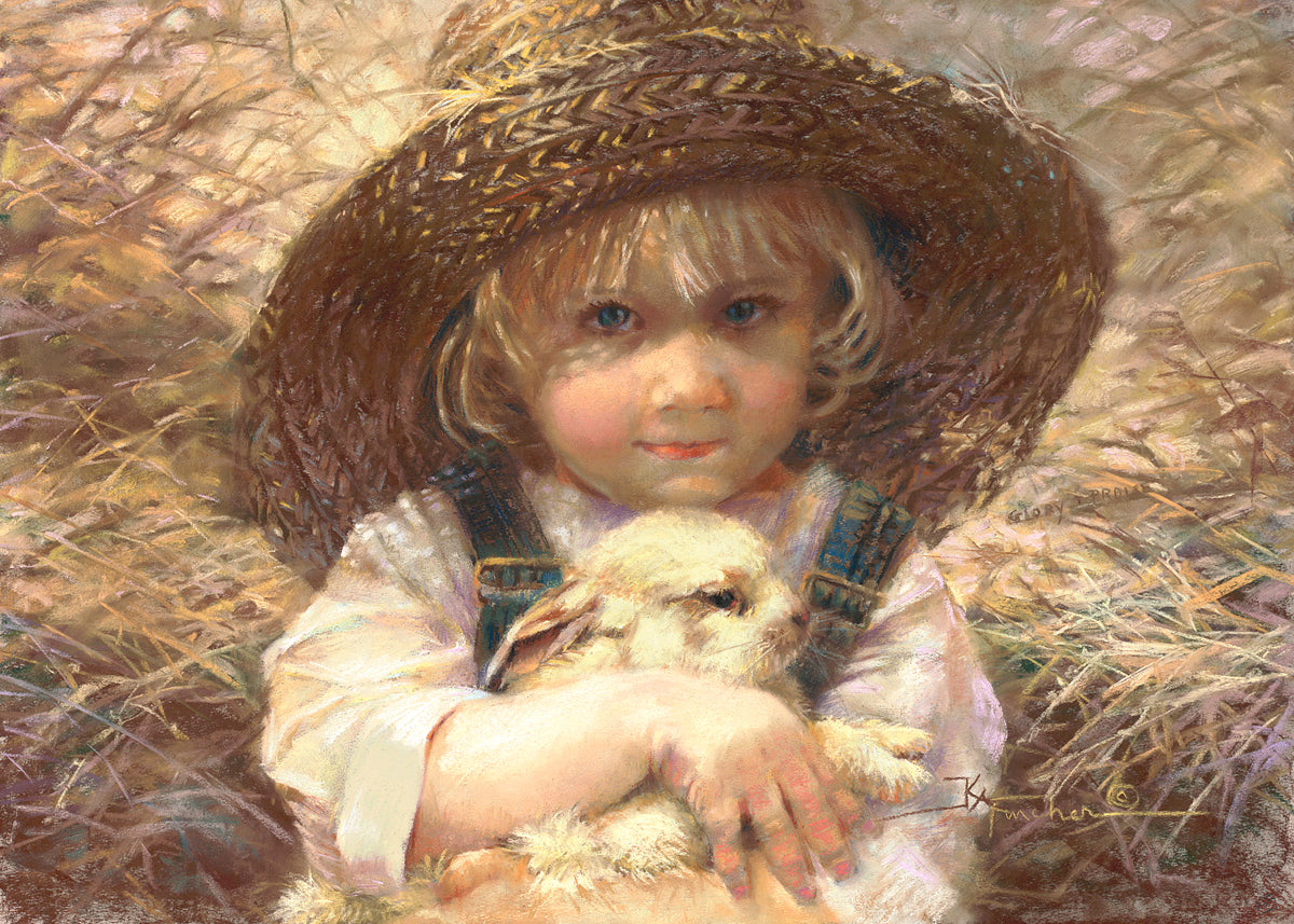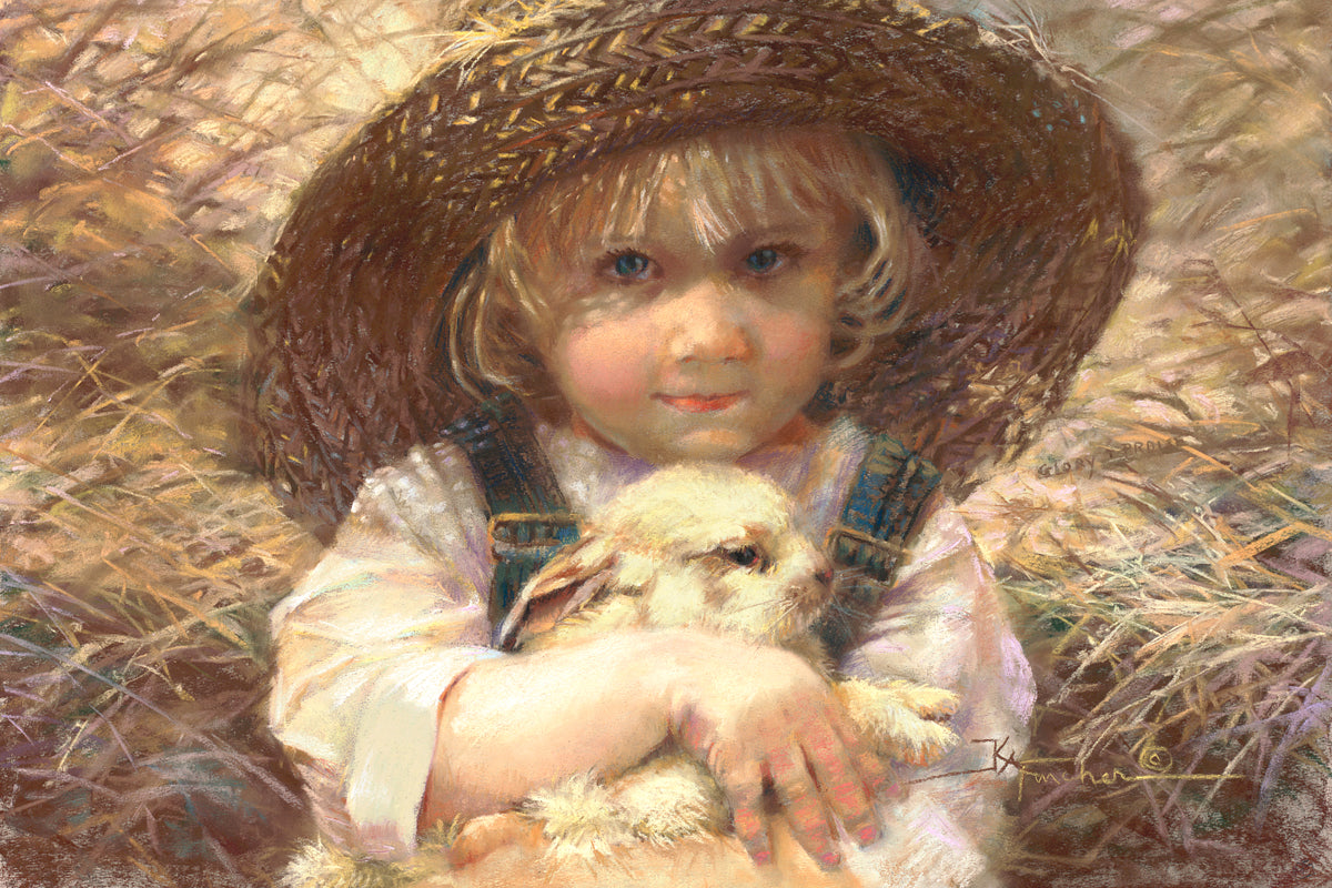 I decided to change the scene. Flowers became straw, and a prissy shirt was traded for overalls. Her blue jean hat became a large straw one. I have painted many children through the years, but if I may claim an artist’s favorite, All Mine would be it.