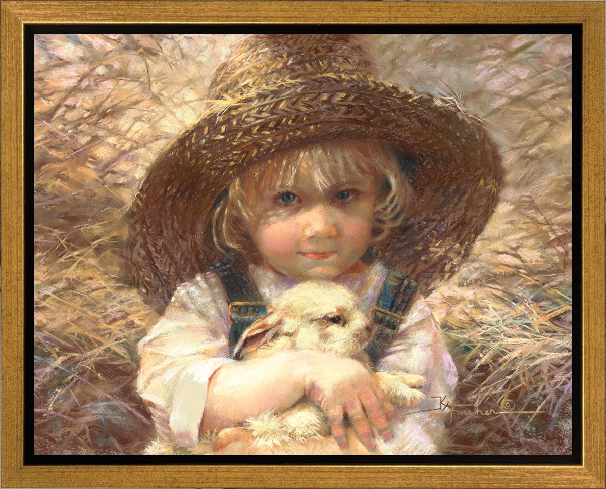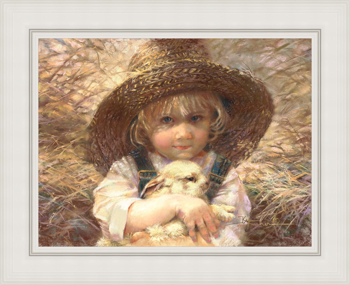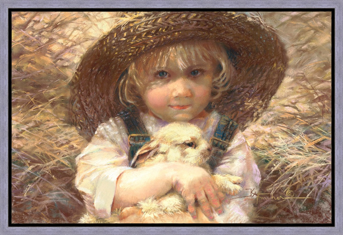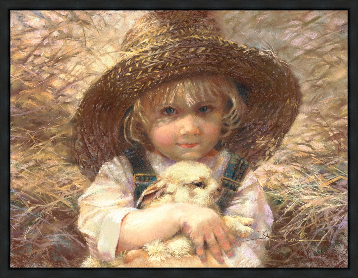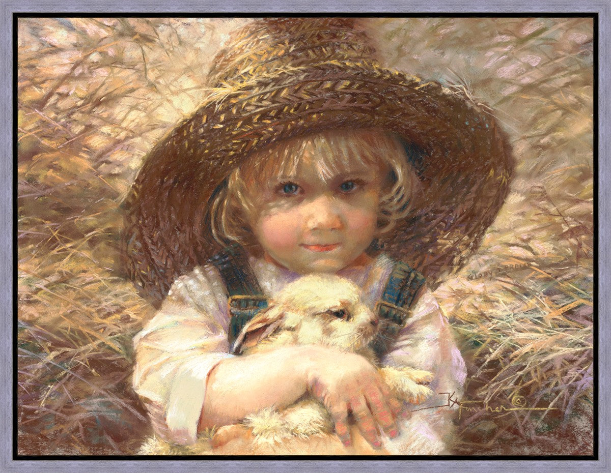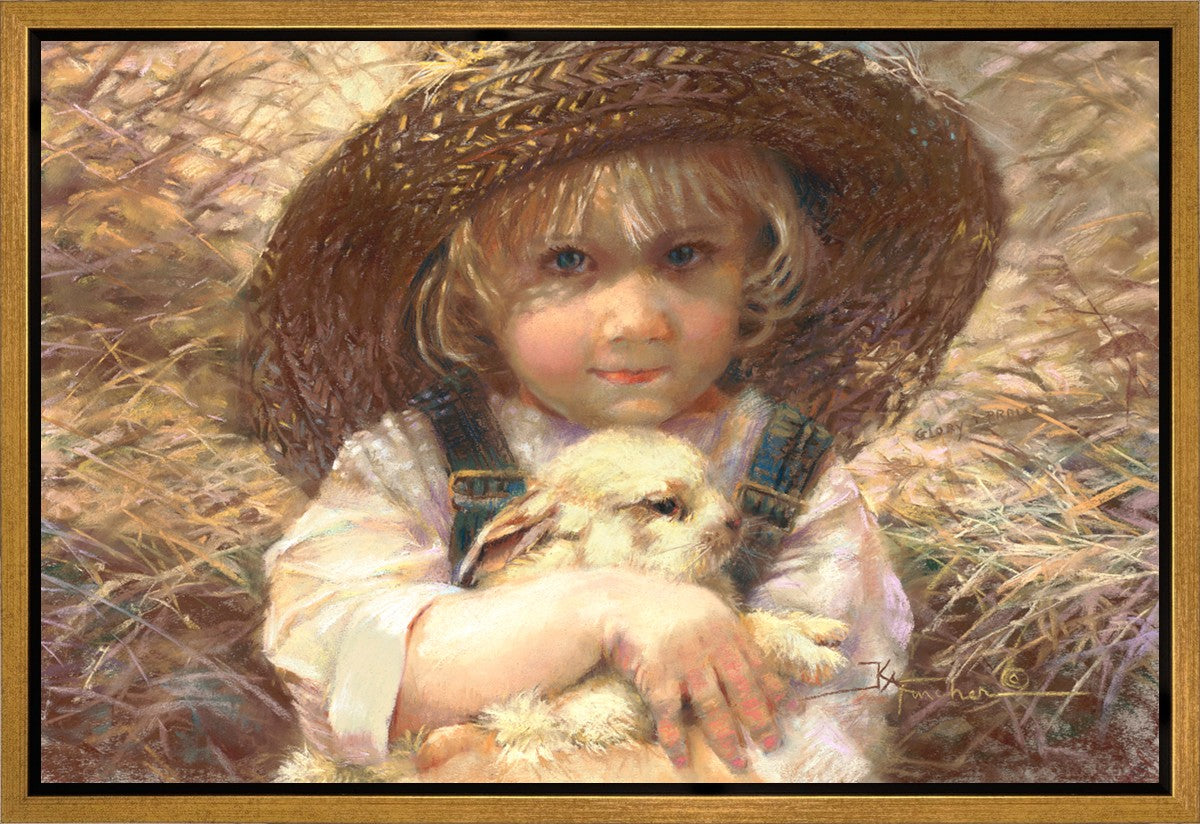 I decided to change the scene. Flowers became straw, and a prissy shirt was traded for overalls. Her blue jean hat became a large straw one. I have painted many children through the years, but if I may claim an artist’s favorite, All Mine would be it.