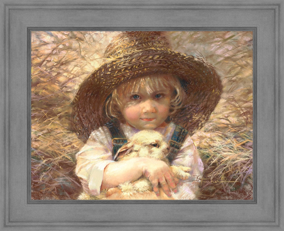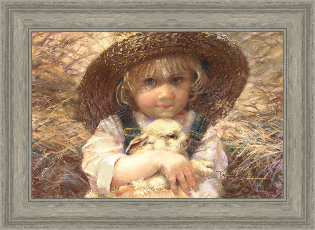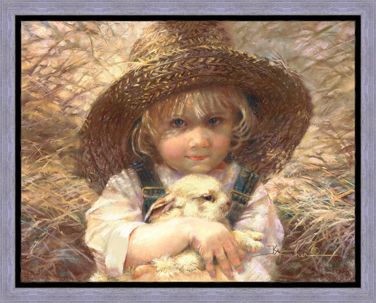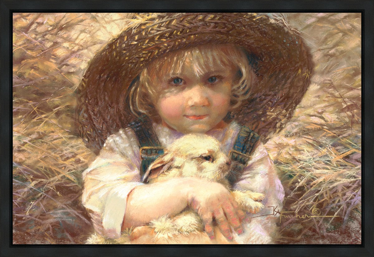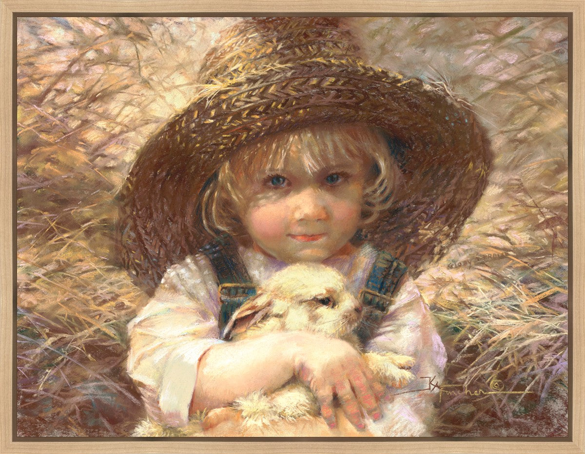 I decided to change the scene. Flowers became straw, and a prissy shirt was traded for overalls. Her blue jean hat became a large straw one. I have painted many children through the years, but if I may claim an artist’s favorite, All Mine would be it.