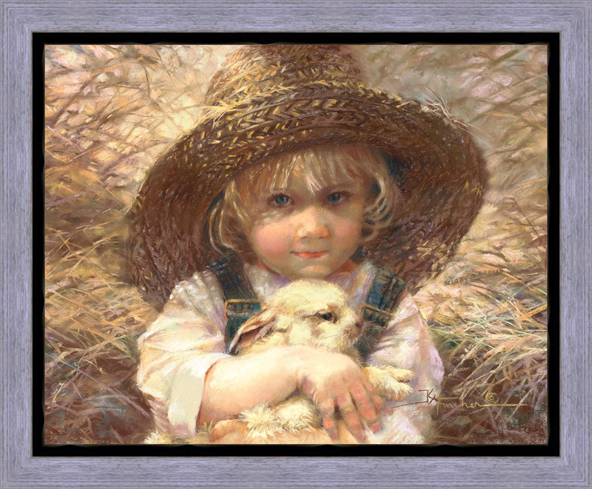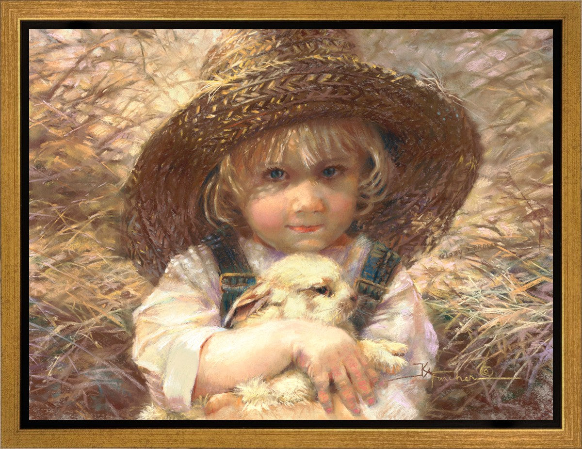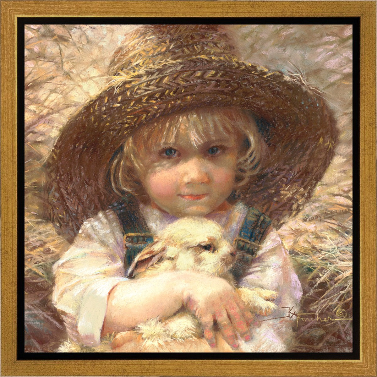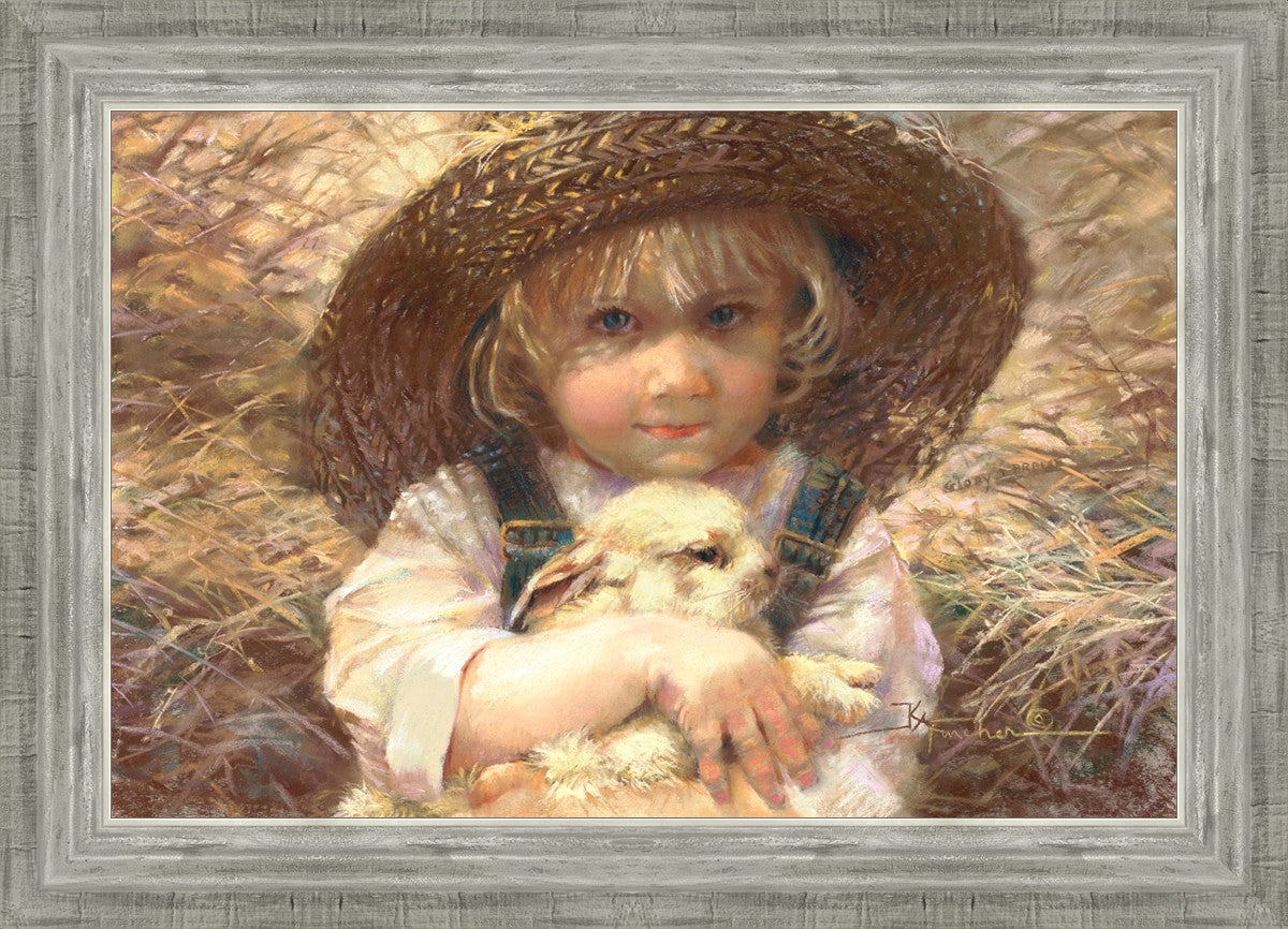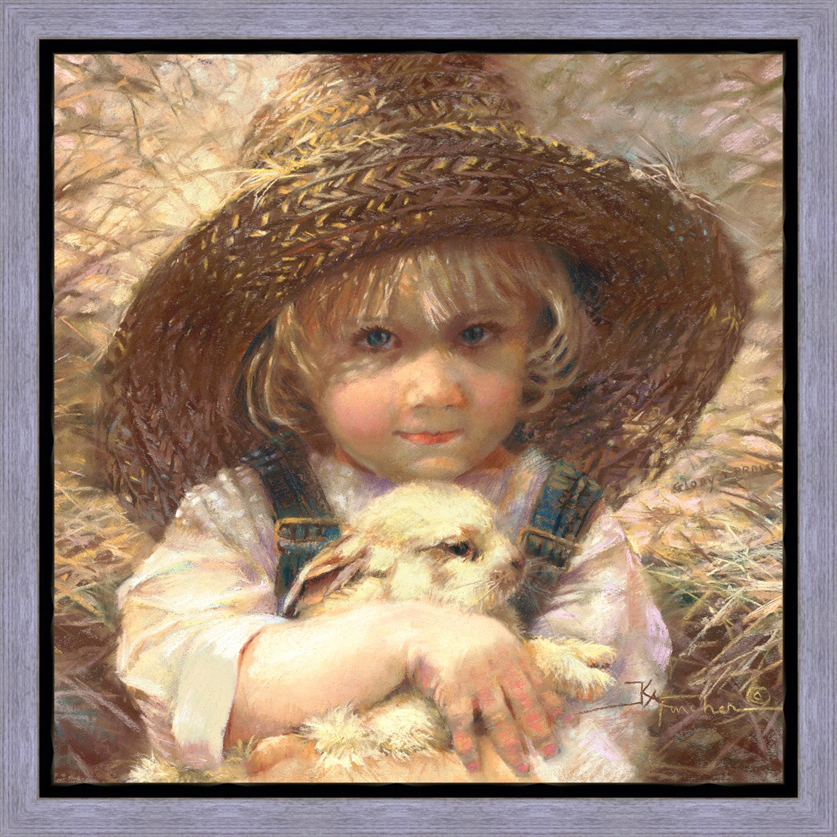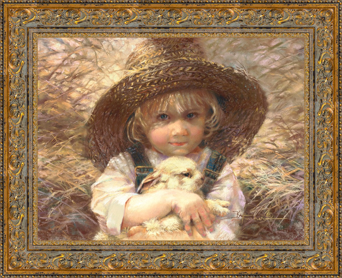 I decided to change the scene. Flowers became straw, and a prissy shirt was traded for overalls. Her blue jean hat became a large straw one. I have painted many children through the years, but if I may claim an artist’s favorite, All Mine would be it.