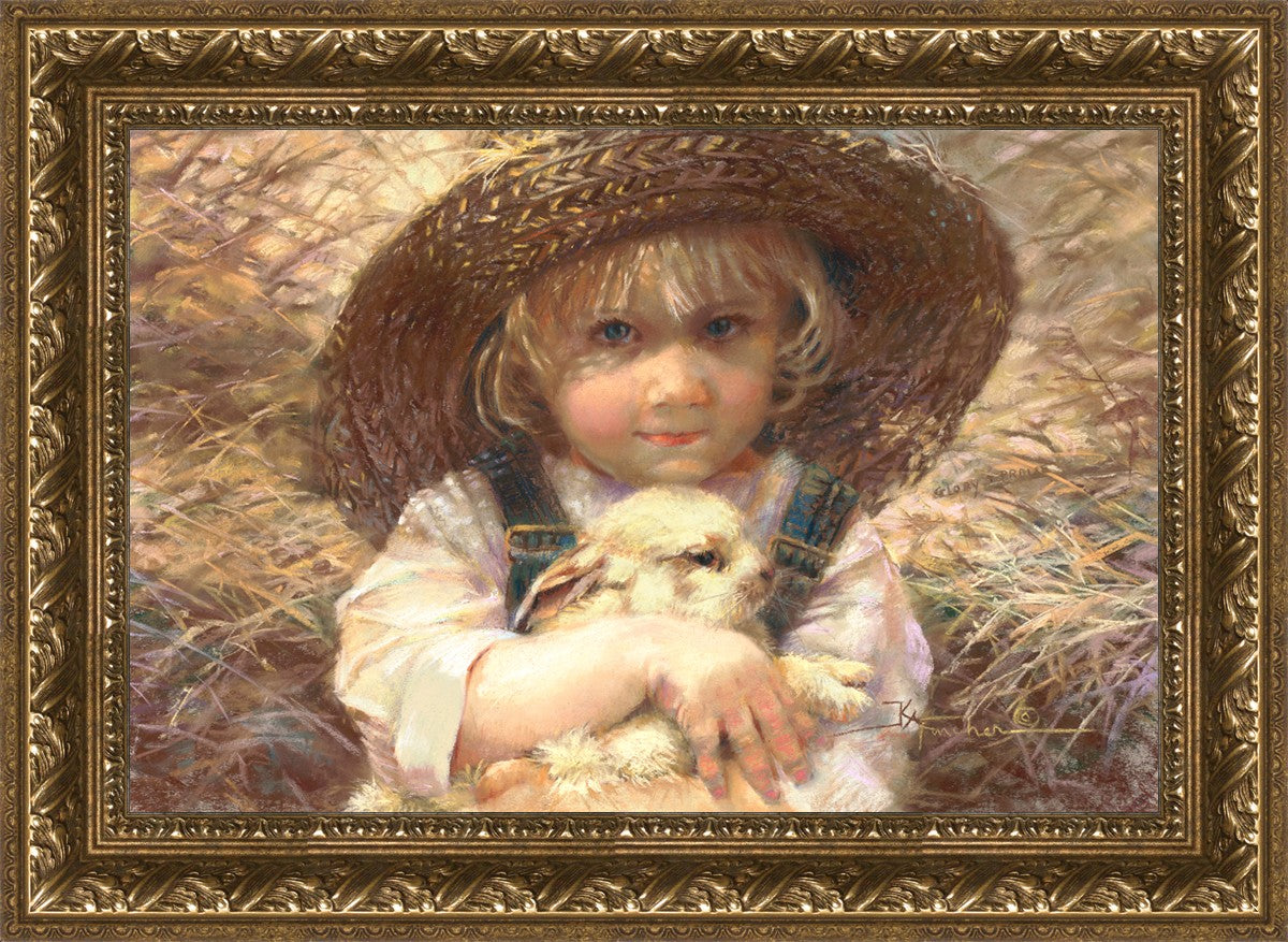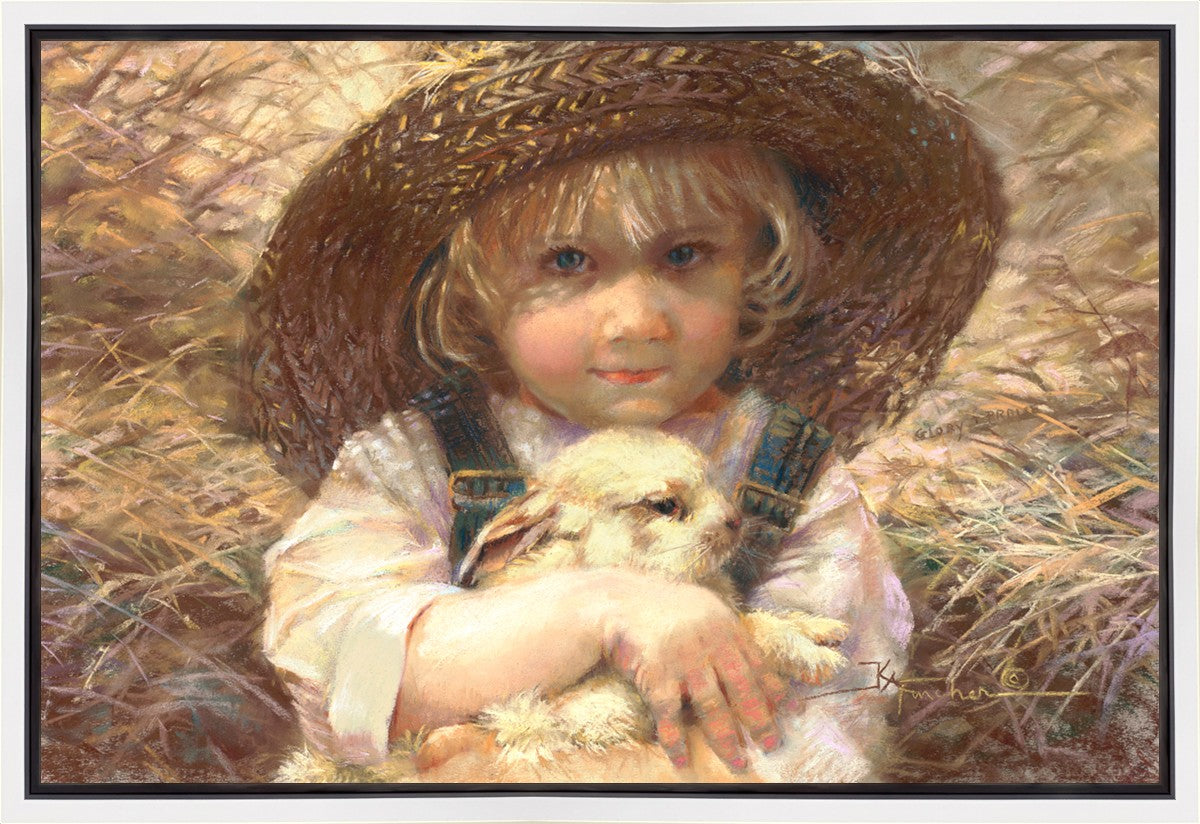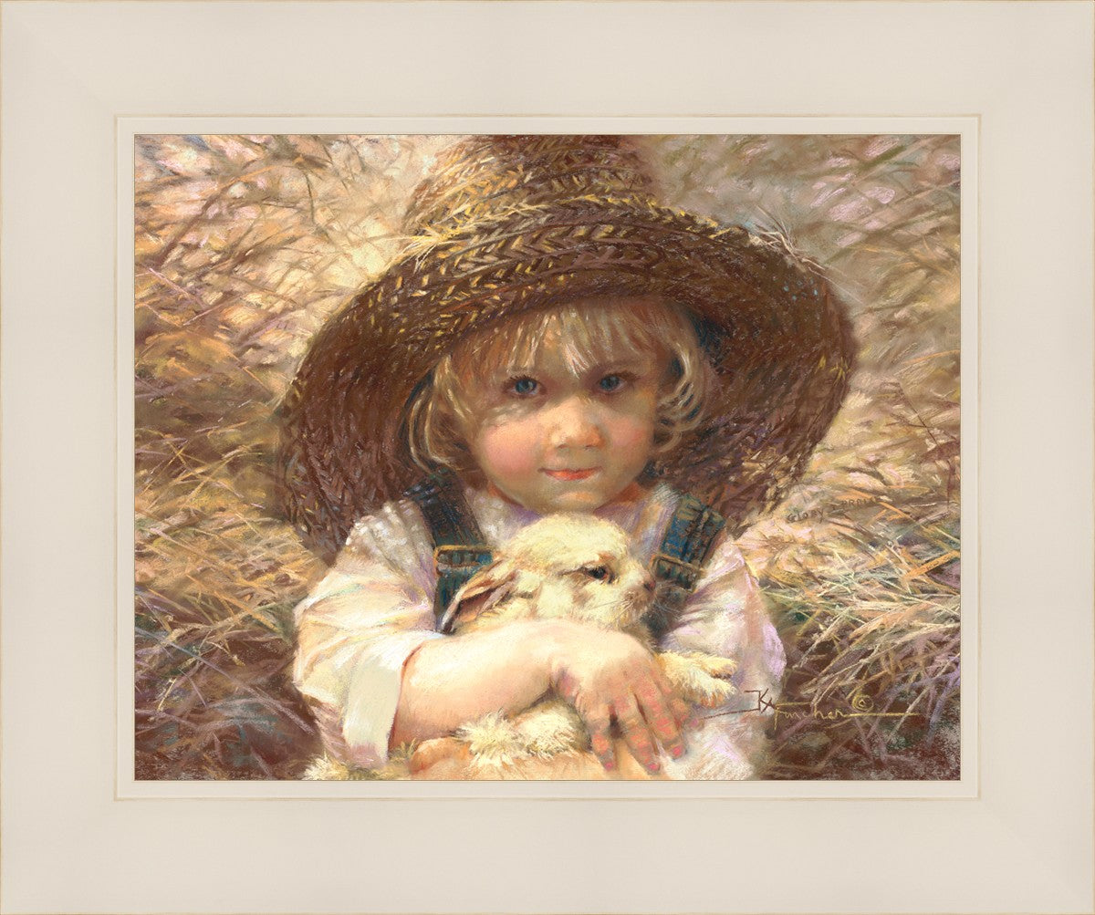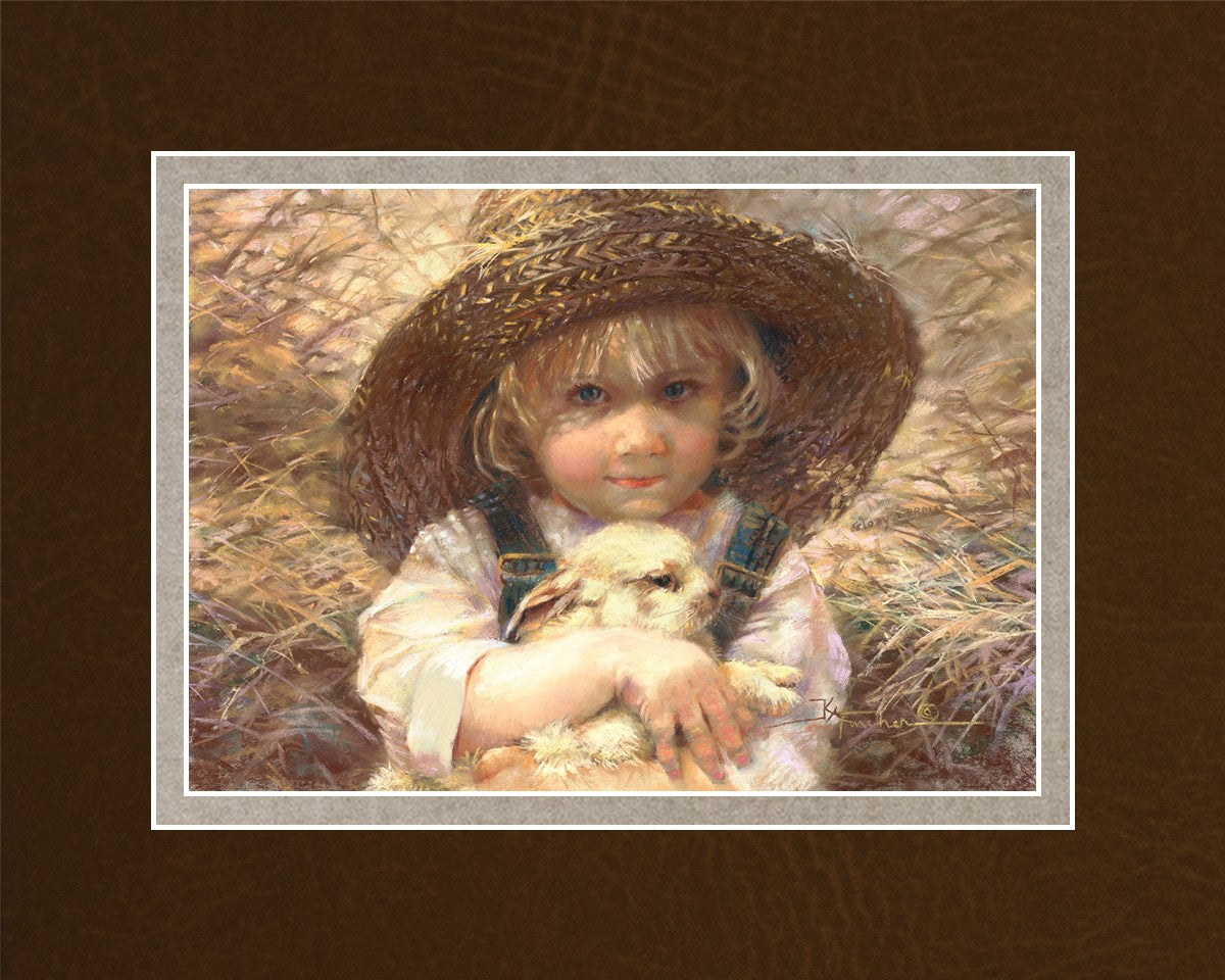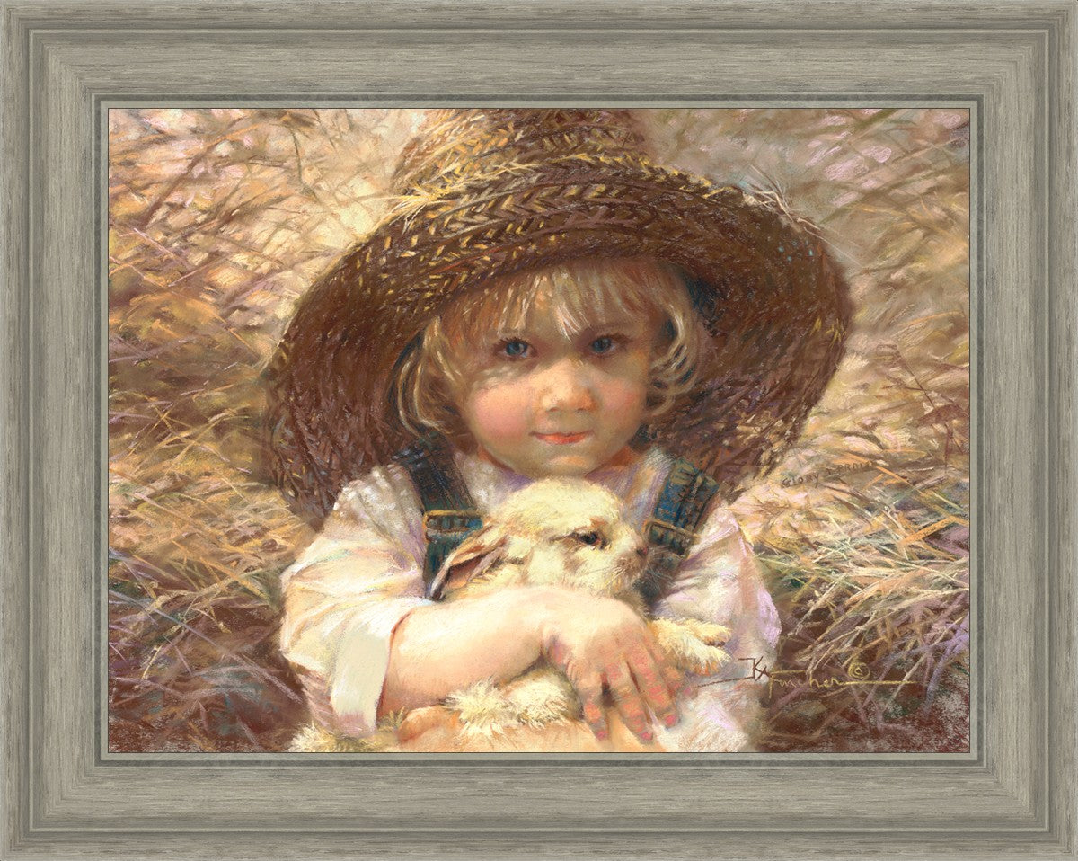 I decided to change the scene. Flowers became straw, and a prissy shirt was traded for overalls. Her blue jean hat became a large straw one. I have painted many children through the years, but if I may claim an artist’s favorite, All Mine would be it.