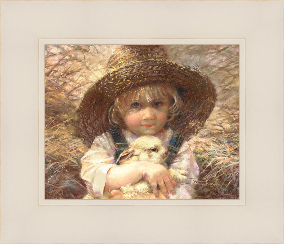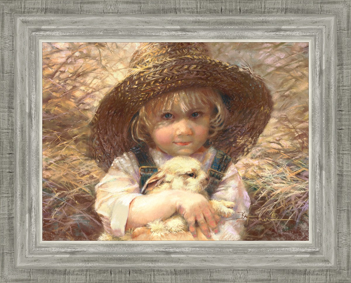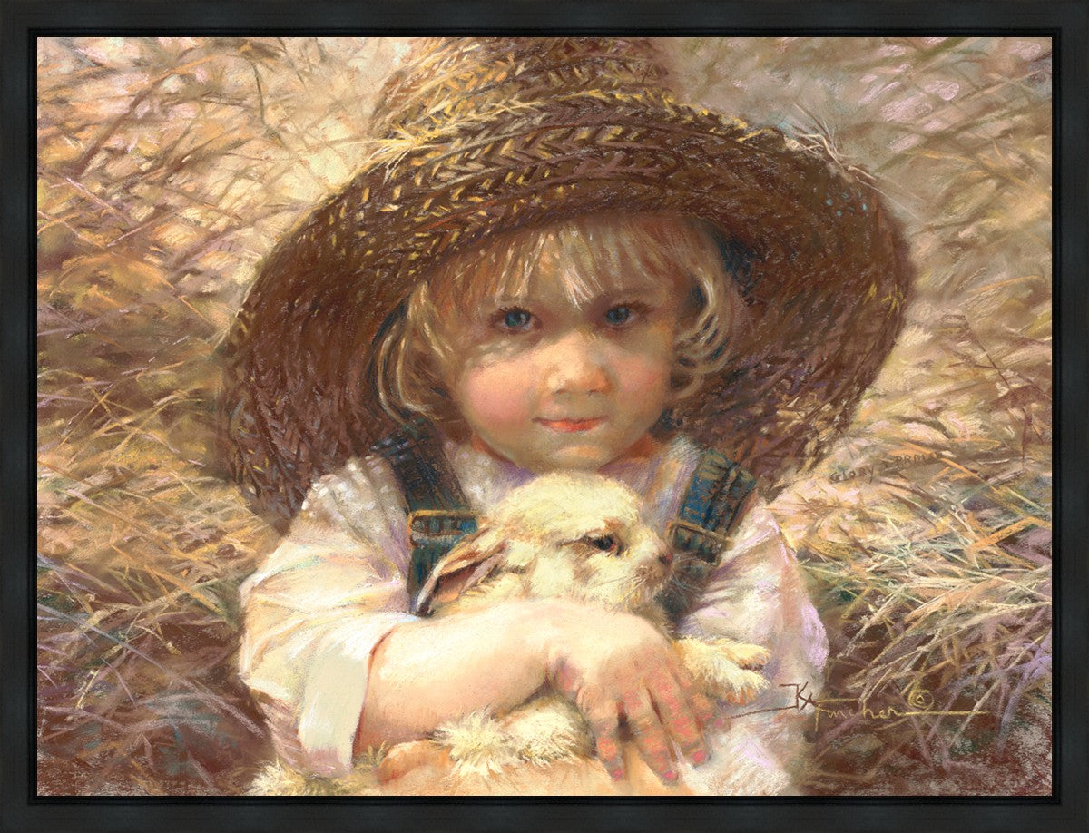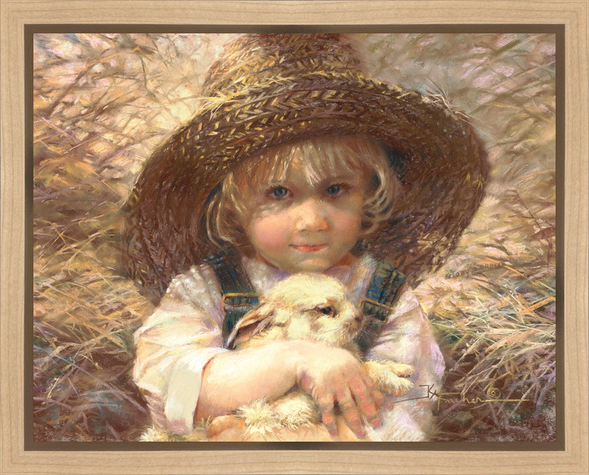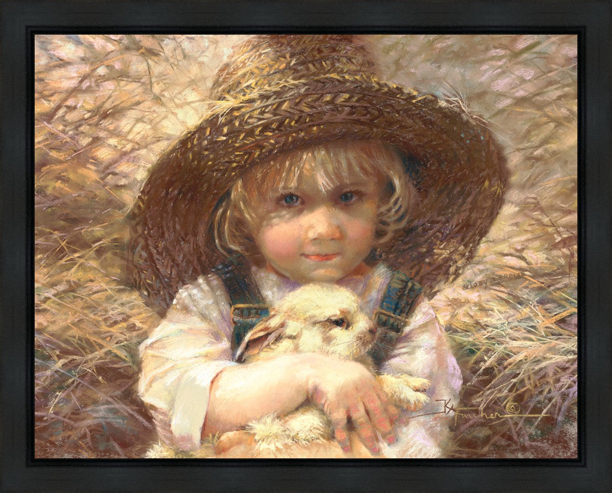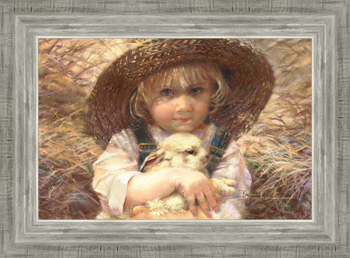 I decided to change the scene. Flowers became straw, and a prissy shirt was traded for overalls. Her blue jean hat became a large straw one. I have painted many children through the years, but if I may claim an artist’s favorite, All Mine would be it.