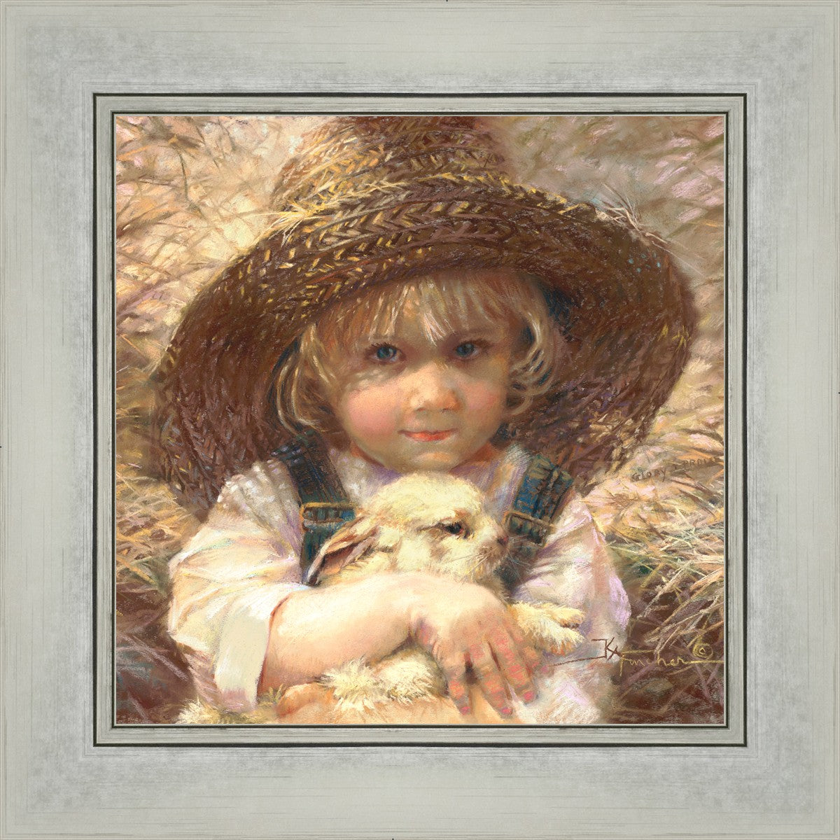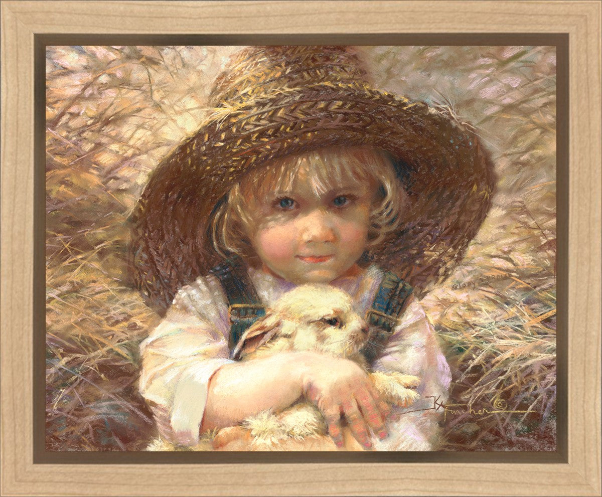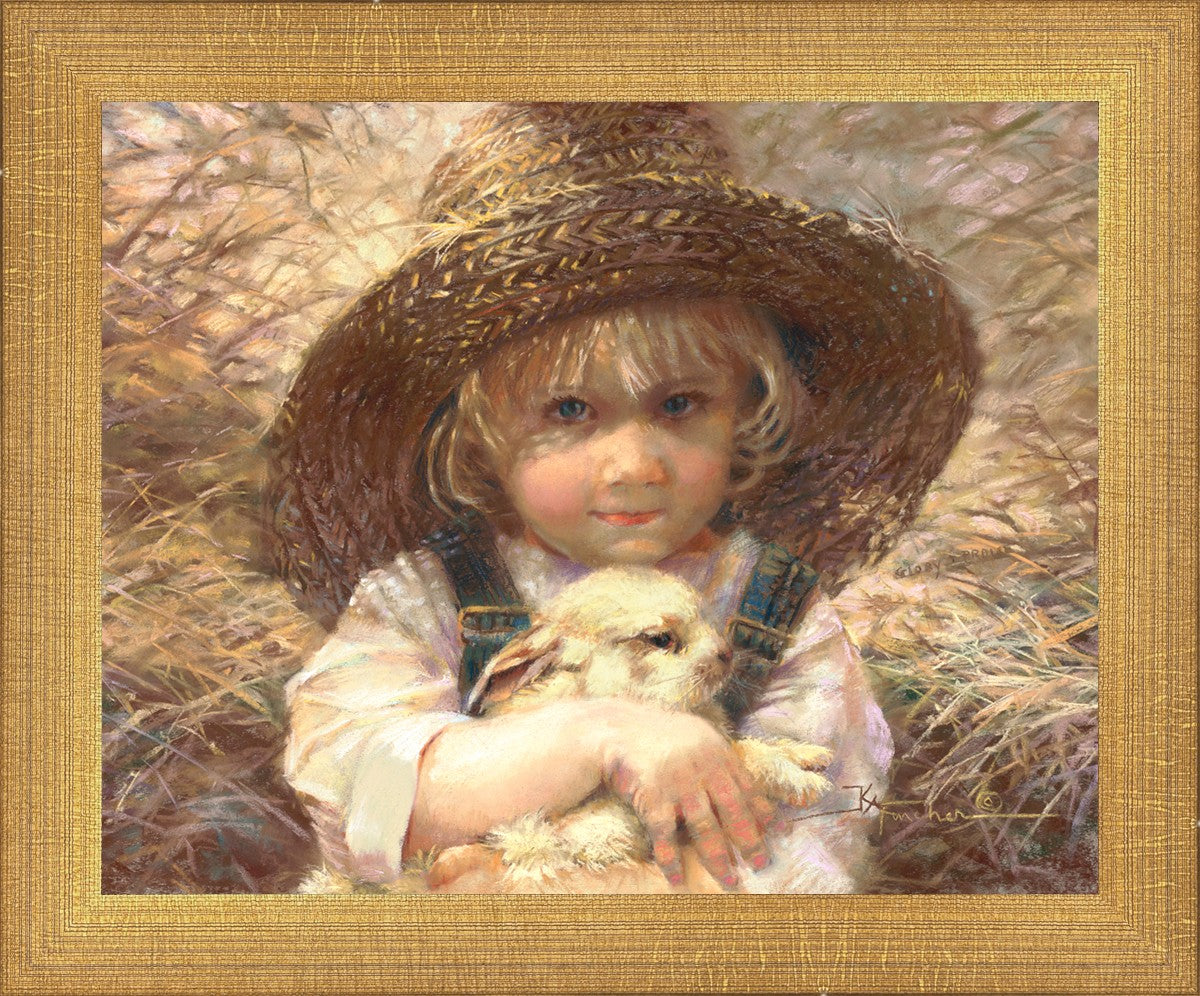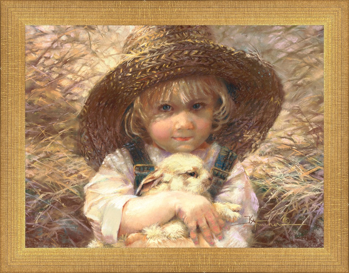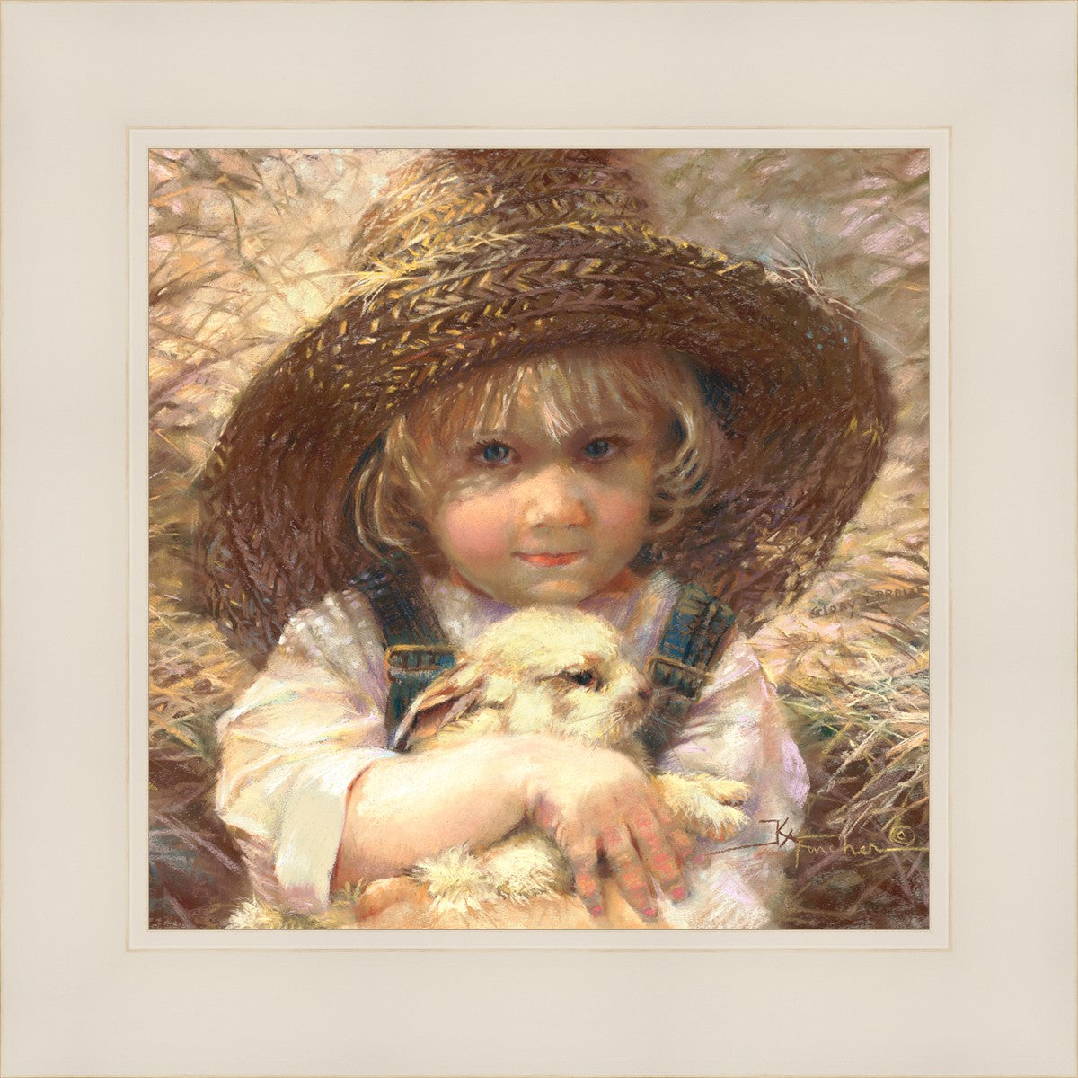 I decided to change the scene. Flowers became straw, and a prissy shirt was traded for overalls. Her blue jean hat became a large straw one. I have painted many children through the years, but if I may claim an artist’s favorite, All Mine would be it.