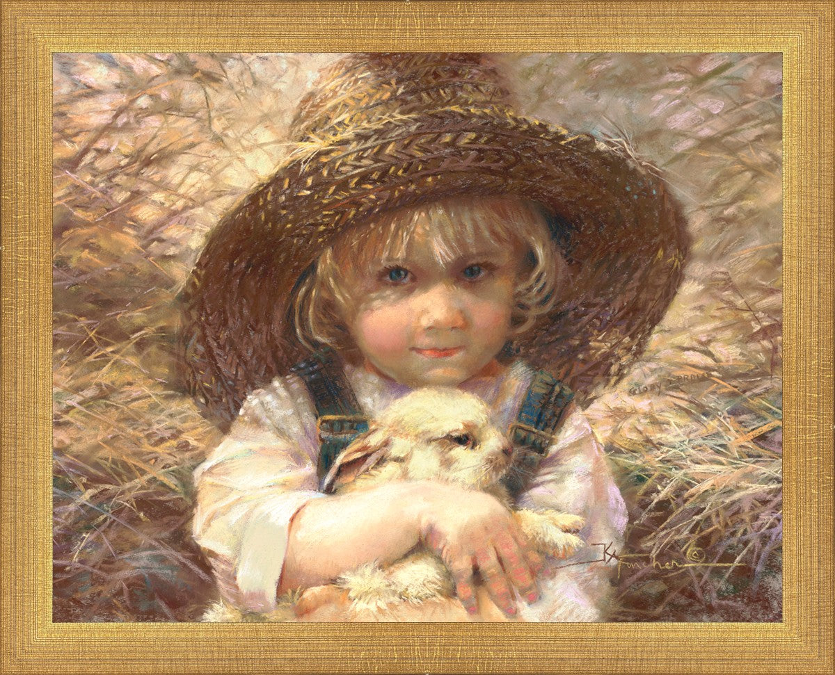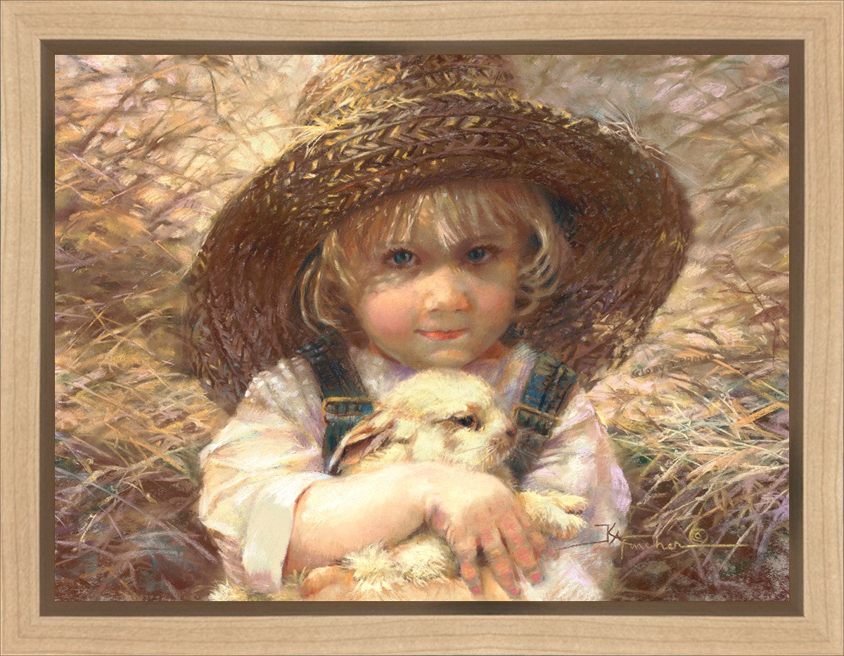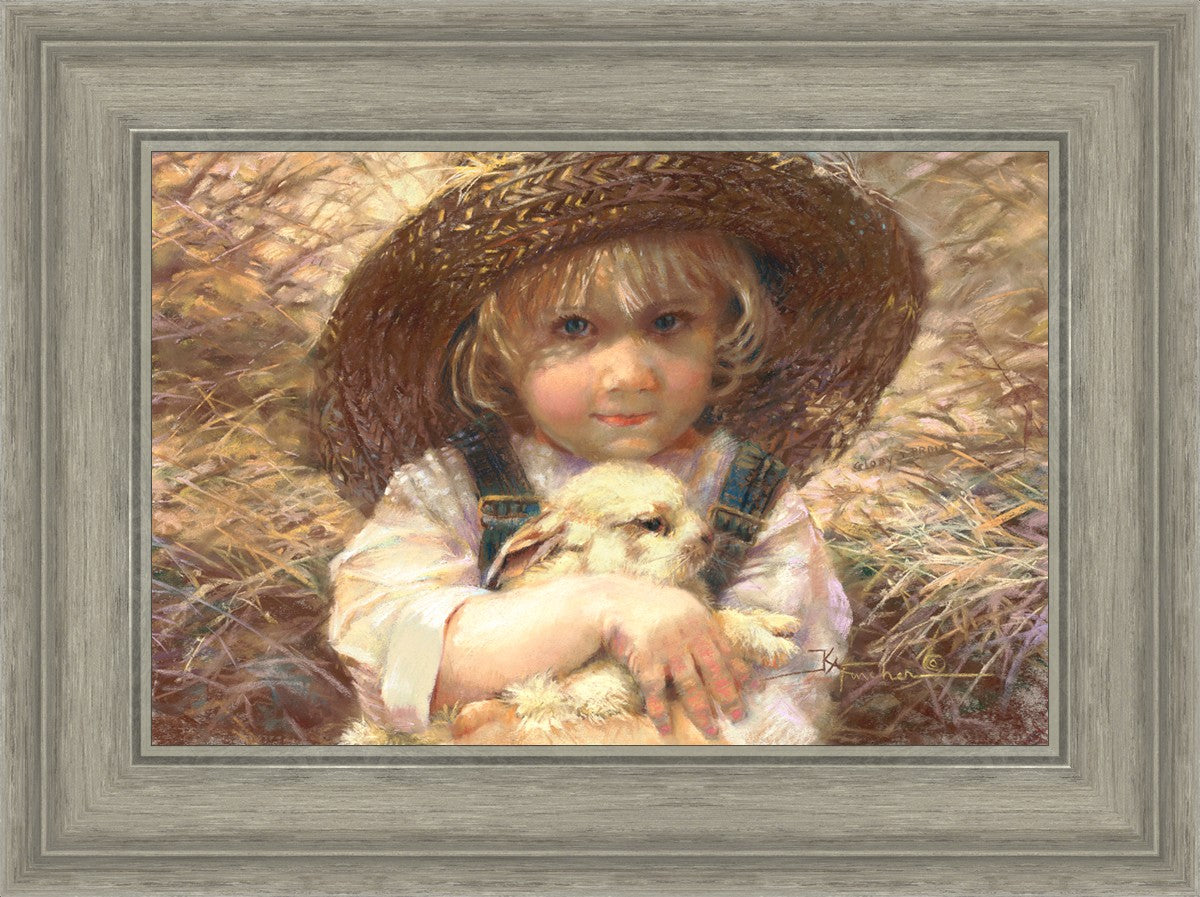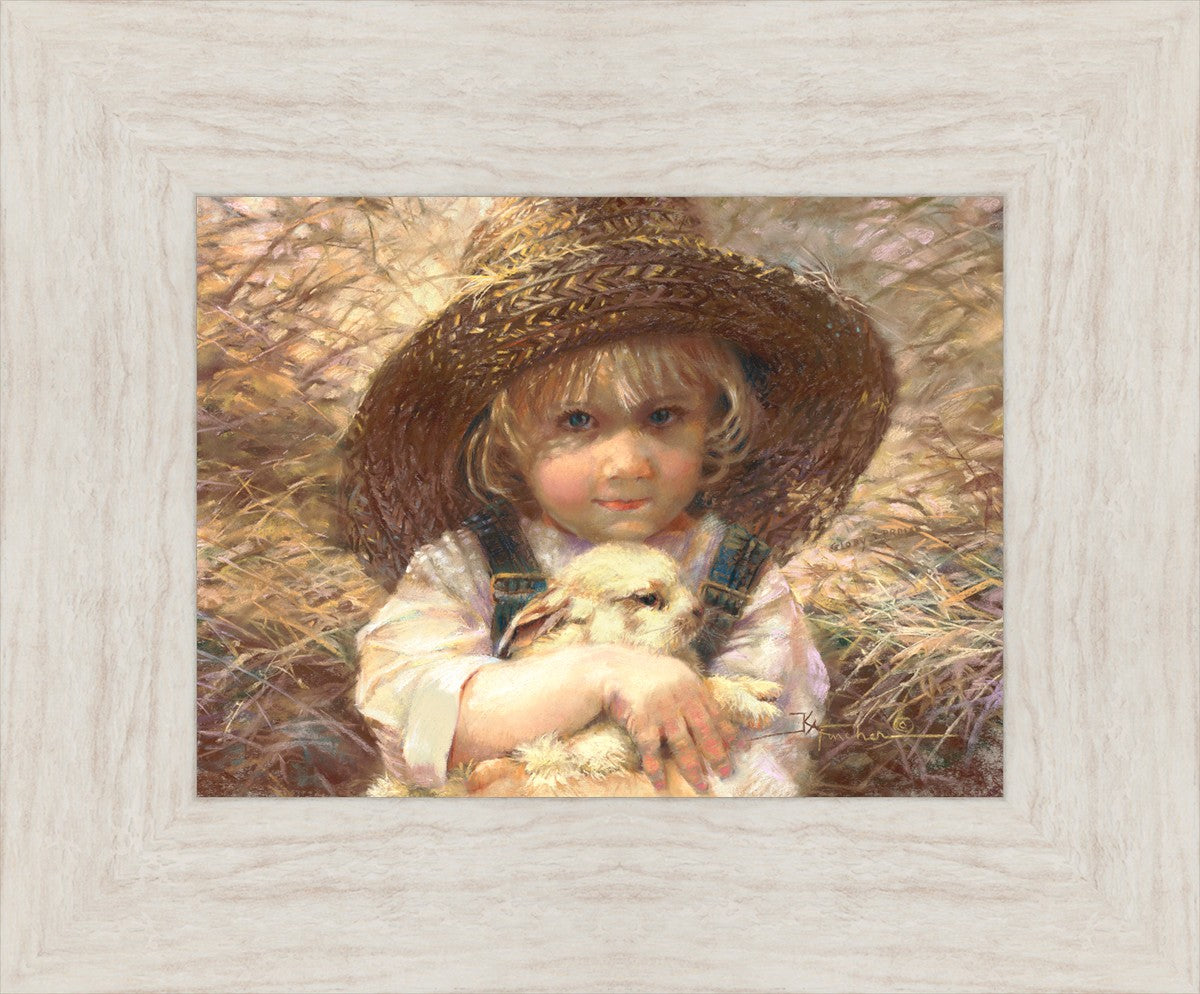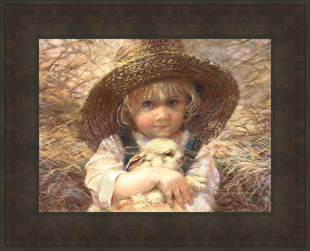 I decided to change the scene. Flowers became straw, and a prissy shirt was traded for overalls. Her blue jean hat became a large straw one. I have painted many children through the years, but if I may claim an artist’s favorite, All Mine would be it.