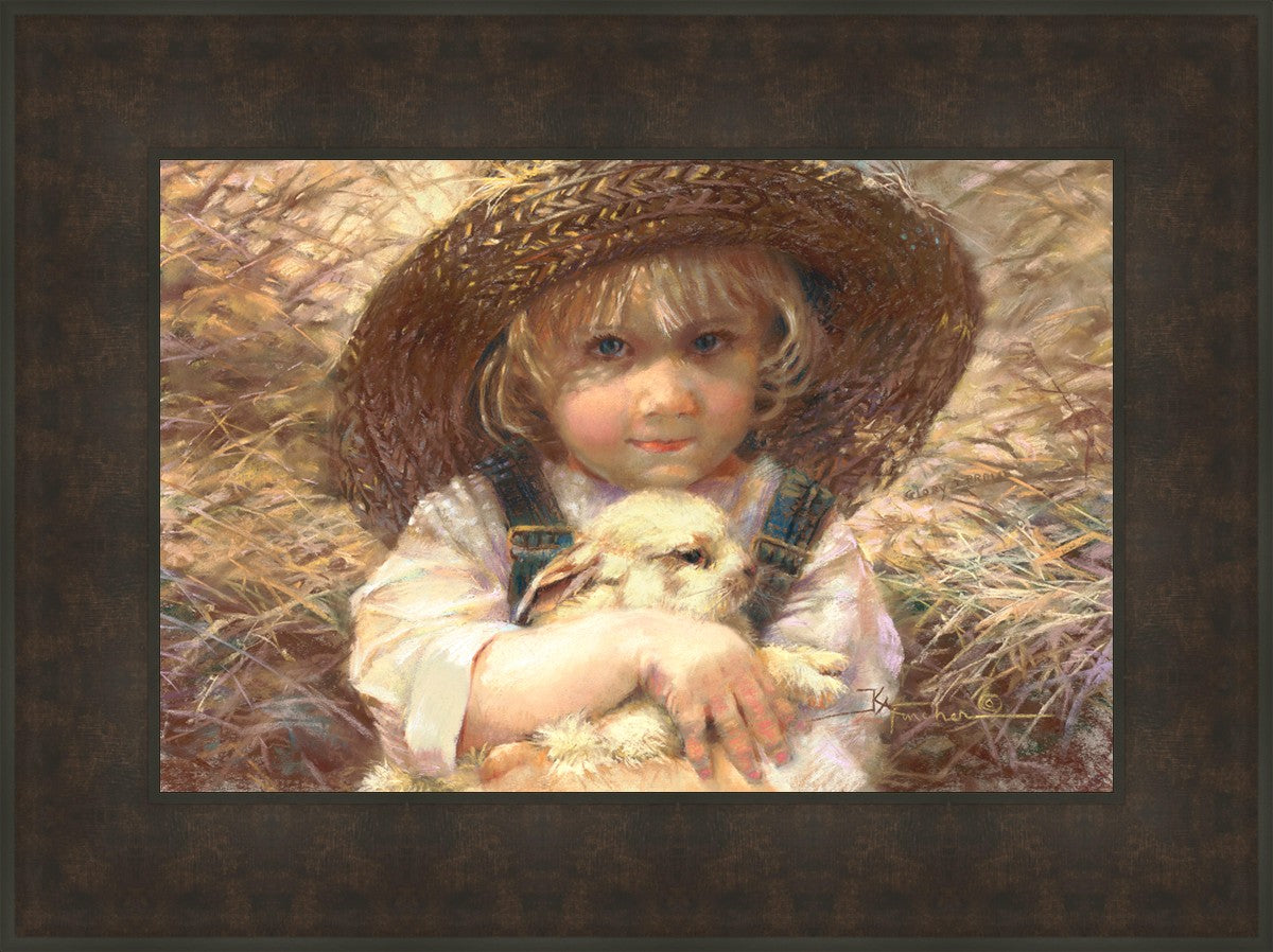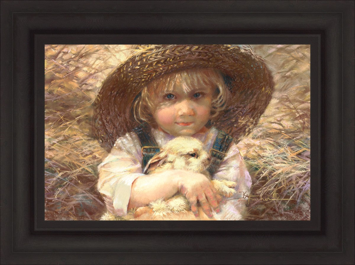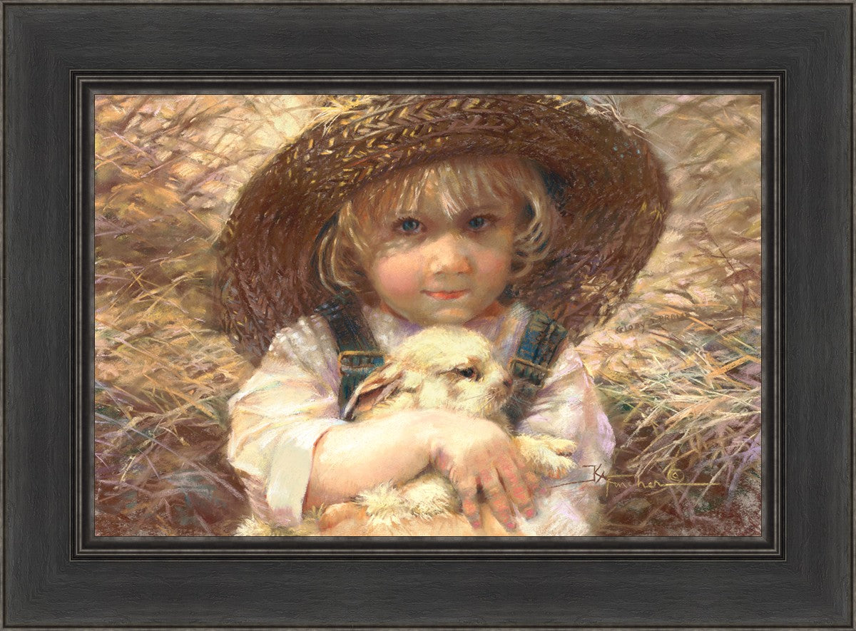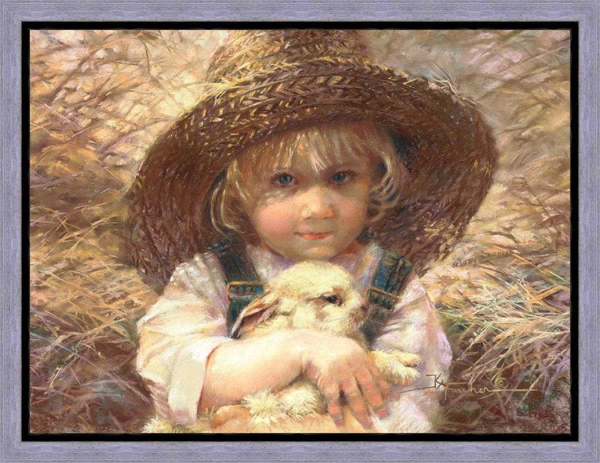 Today, the original painting of All Mine hangs in the foyer of our new mountaintop home. The young child greets me, clinging to her bunny, and I still haven’t decided if she will share or not. But I do know her eyes are a mystery, for no matter where I stand, or where I go, she follows me!