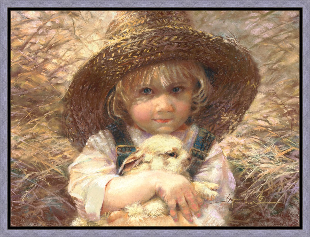 A great painting begins with great references, and I had our daughters’ bunny “Hoppy” following me around the studio and sleeping on my feet at the easel. But the real gem was a photo a friend took of a child with a mesmerizing expression. I prayed I could capture the protective look, the tightness of her mouth, and the grip she had on her bunny.