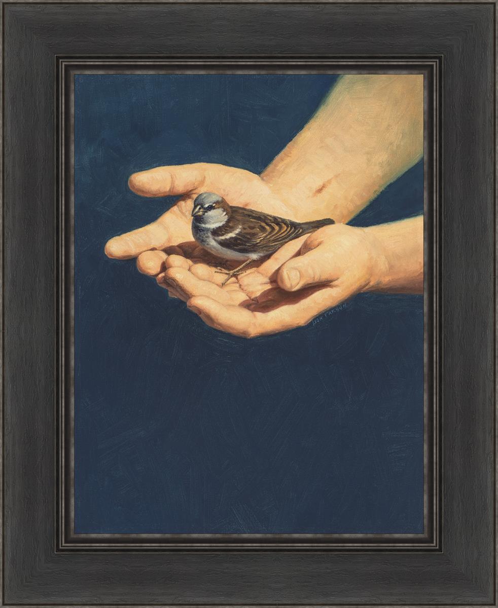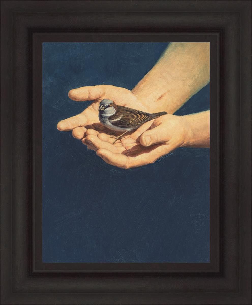 The composition was for a BYUI booklet. I used my friend’s hands and a mounted bird borrowed from the Biology Department. The English Sparrow markings were “invented” and painted on the shape of the mounted bird. Matthew 10:29