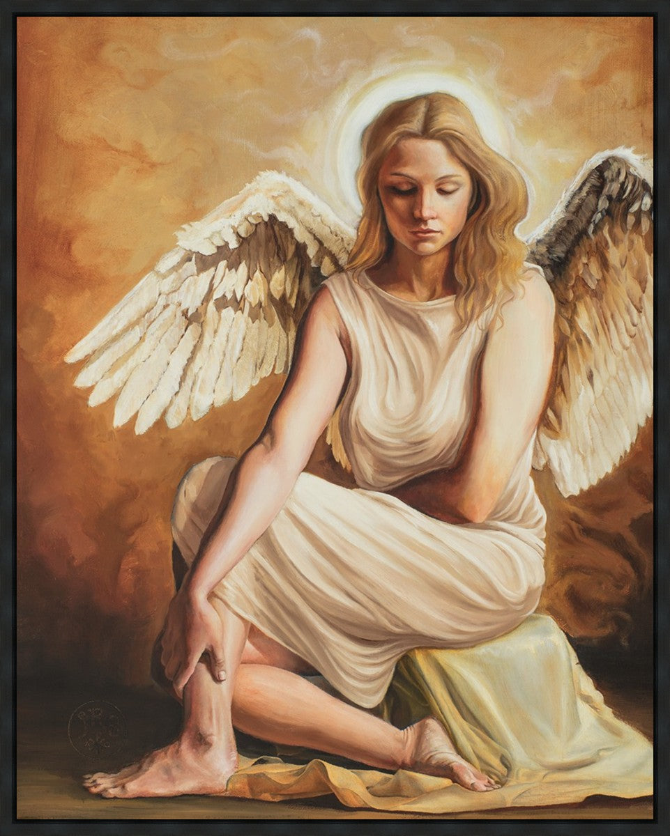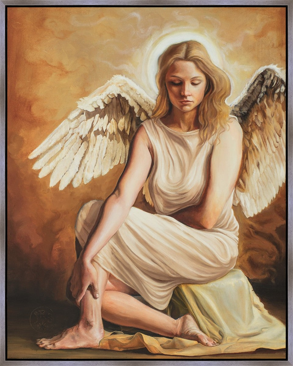 An ethereal being, this painting portrays an Angel reverently contemplating her newly discovered state of grace obtained through the regenerating power of repentance. She radiates with celestial grace and glory. Portrayed with stark contrast and a warm color palette, Angel of Redemption is a homage to the dignity of the human spirit and a testament to the transformative power of faith.
