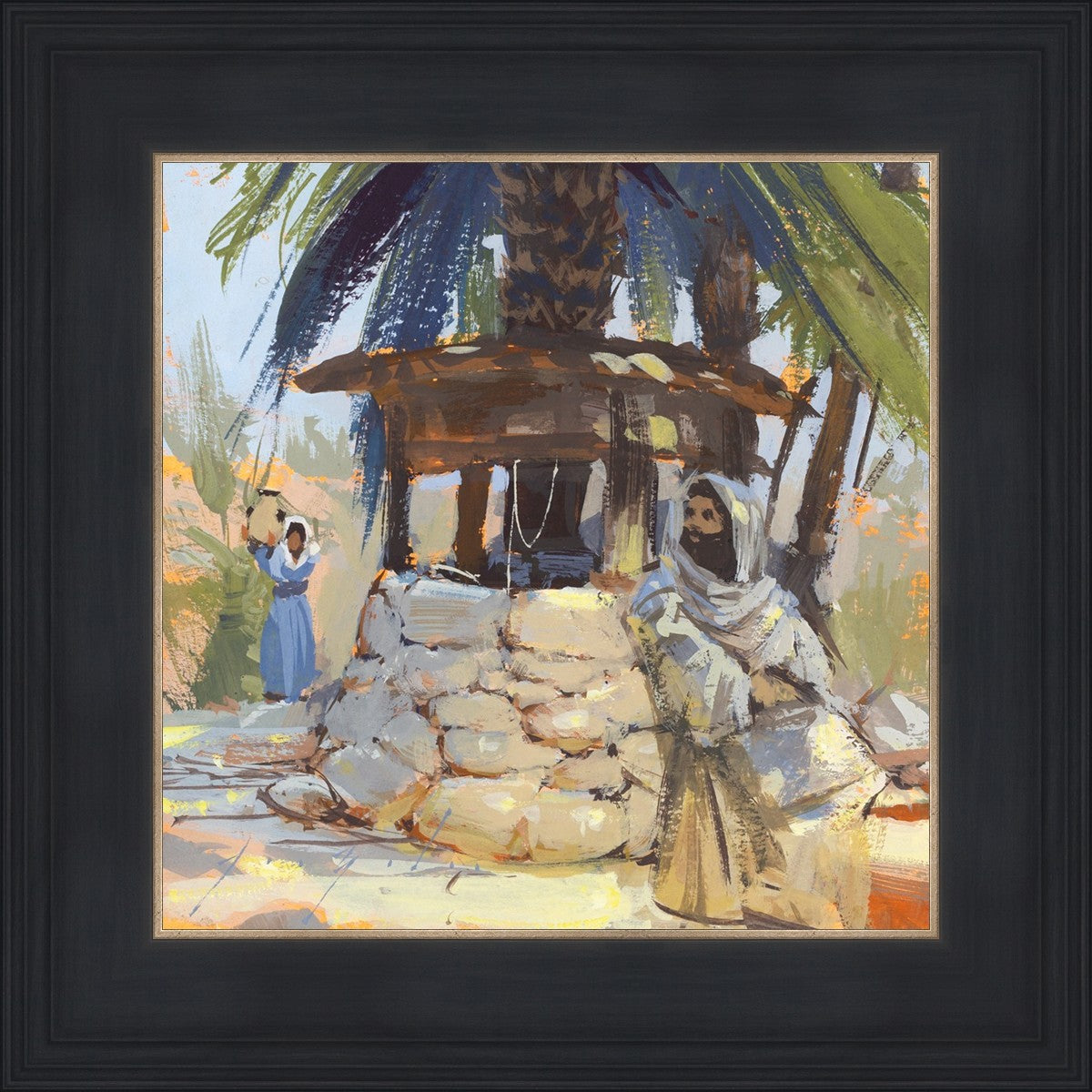 Christ is sitting at a well while a woman in blue is approaching to fill up her vessel. He knows she is coming but she is oblivious of him. There are giant palm trees behind and next to the well.