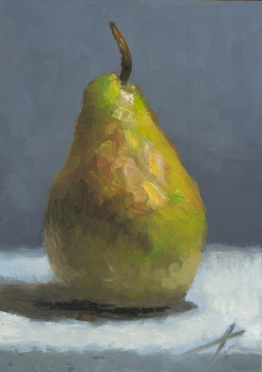 When I made the decision to really start painting professionally, my wife and I were living with my wife’s grandfather. He had been in a major car accident and we moved in with him to take care of him as he was unable to live on his own. It was a very sacred experience for our family. We ended up taking care of him and his home for the last four years of his life. His large backyard was home to many fruit trees, especially pear trees. At the time they were always available and ready to eat and great subjects to paint, so I painted a lot of them. Aside from the rich color, shape, and visual interest, I painted them and continue to paint them because they are a strong symbol of our time together during his last years of life.