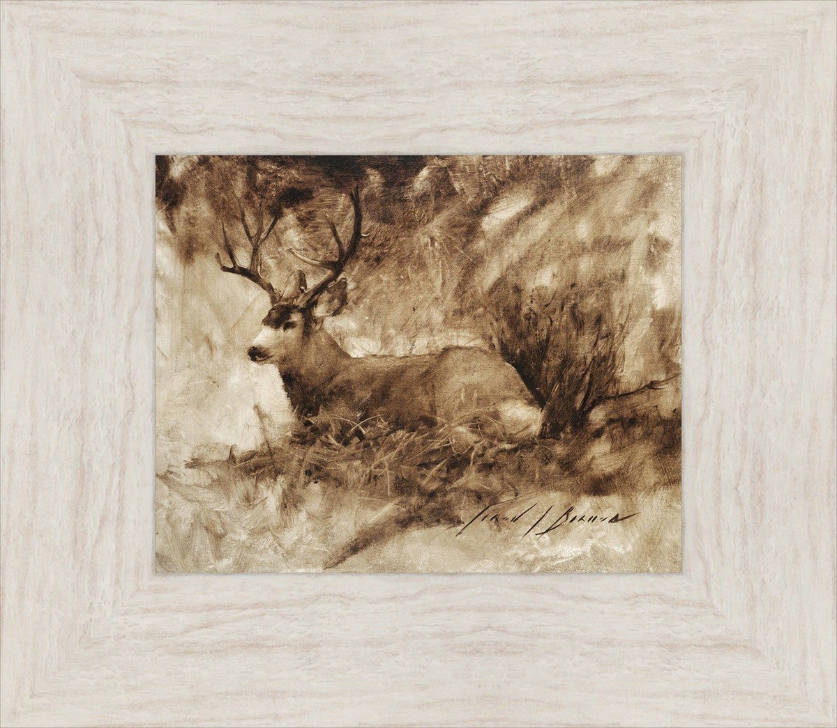 Painting of Bedded Buck by Jared Barnes depicting a buck making bed amongst the grass