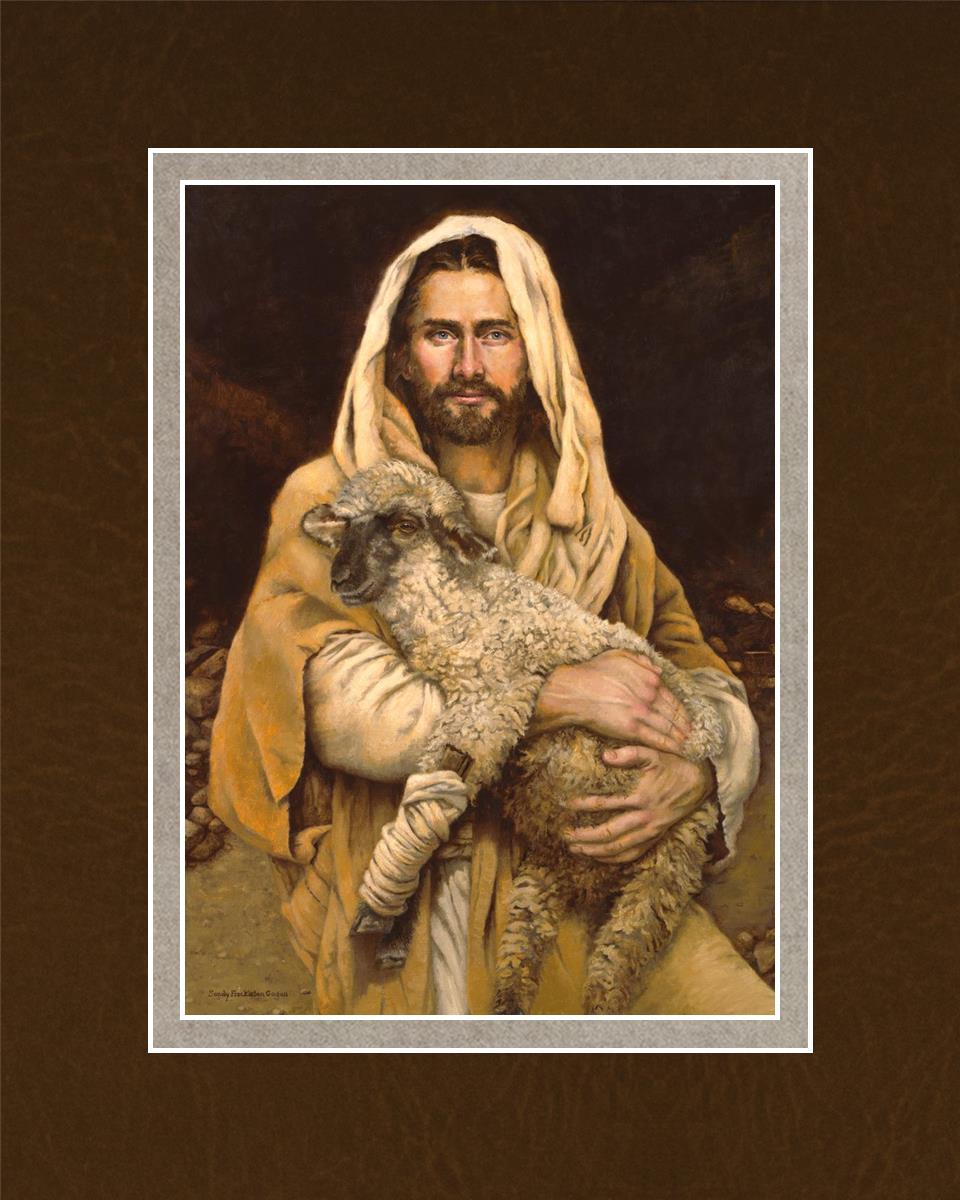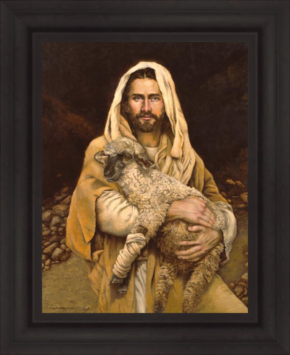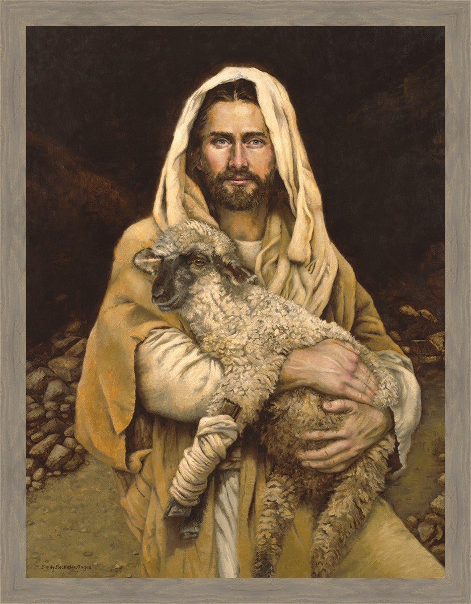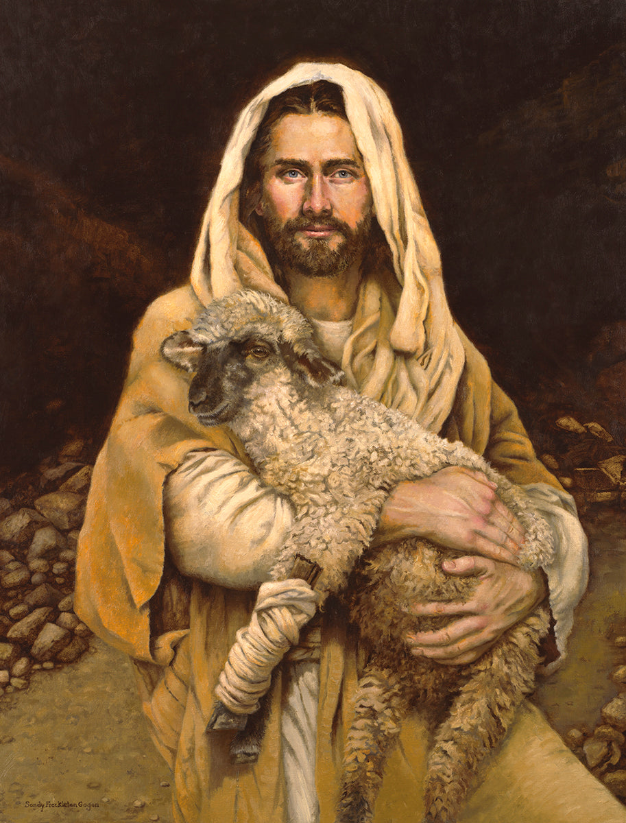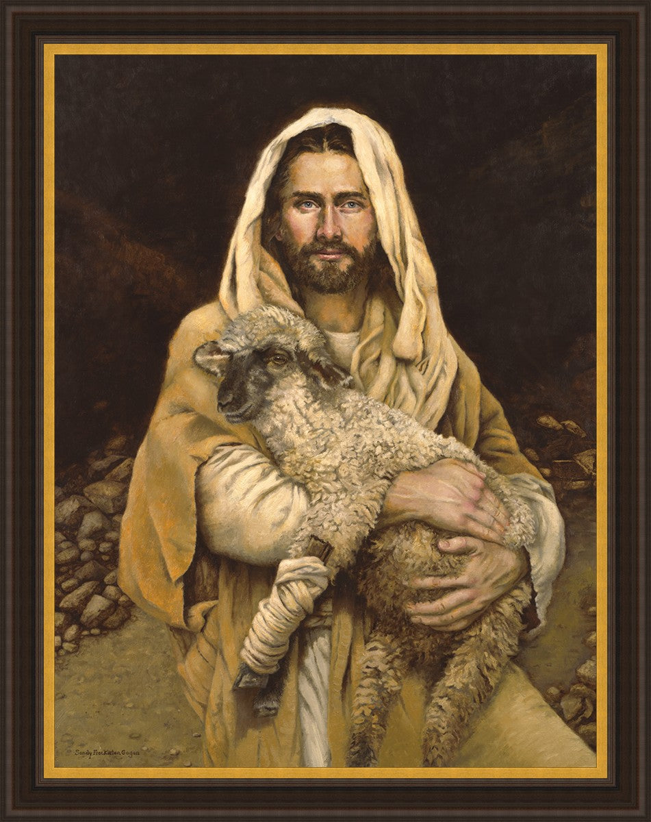"Bind Up The Broken Hearted" by Sandy Freckleton Gagon is a watercolor painting capturing Jesus tenderly holding a lamb against a backdrop of rocks and a dark brown background.