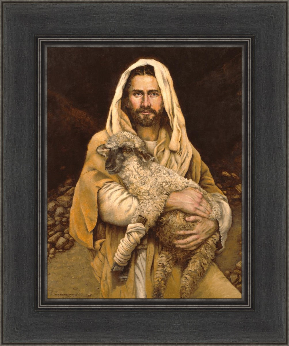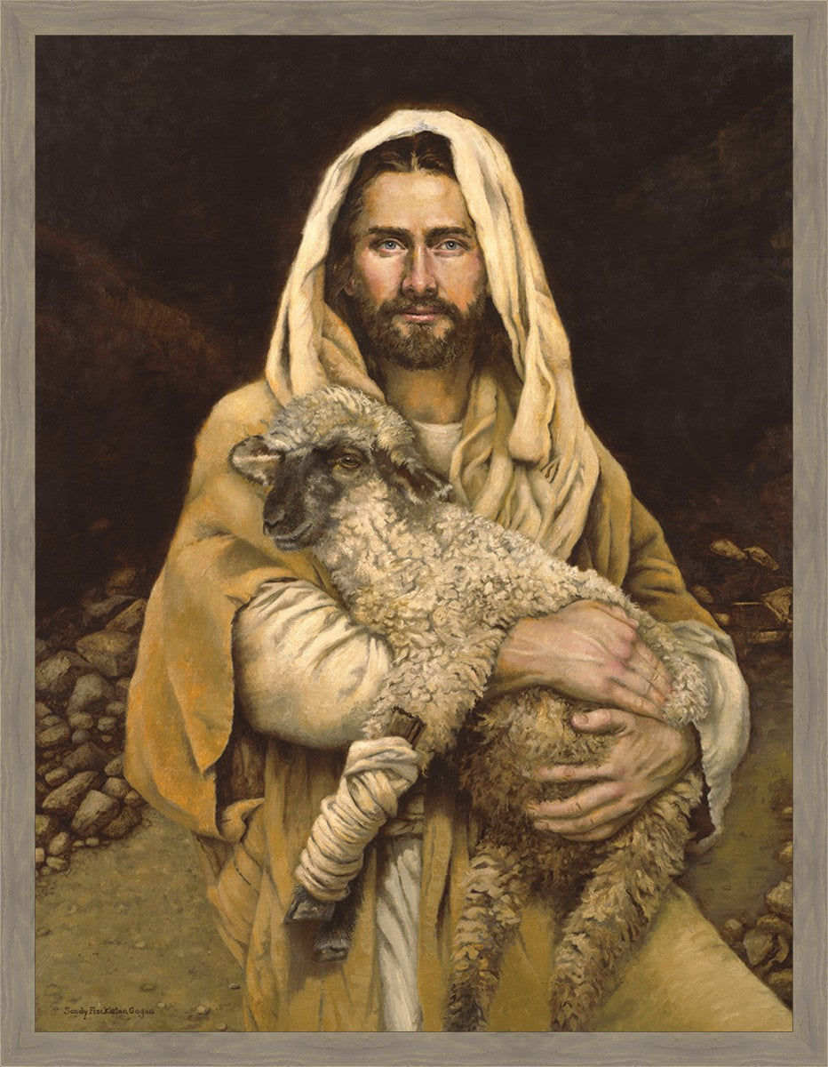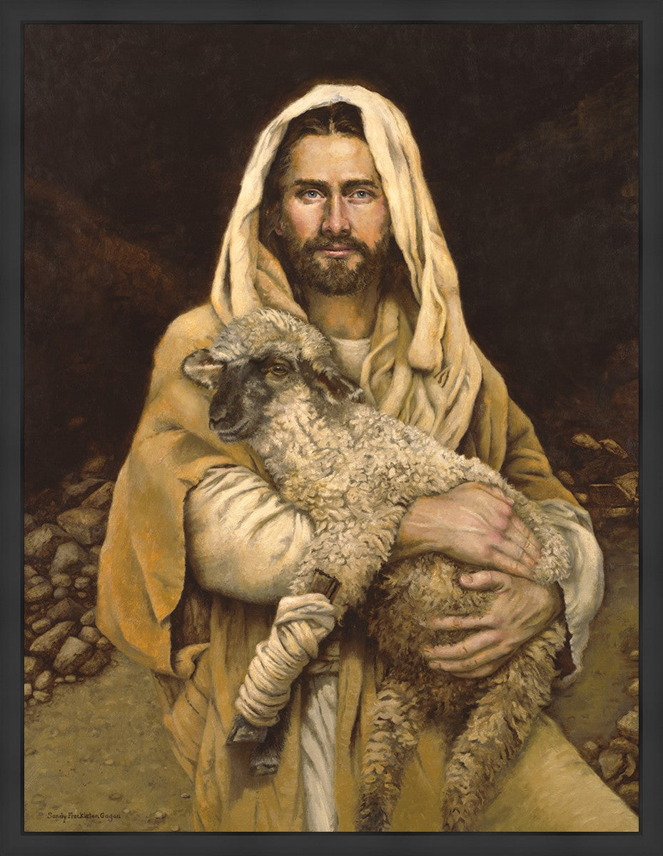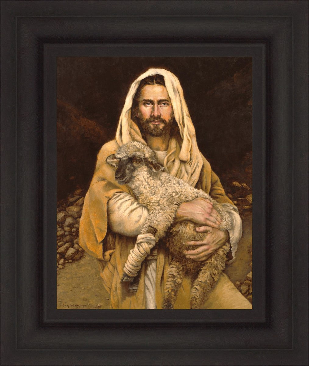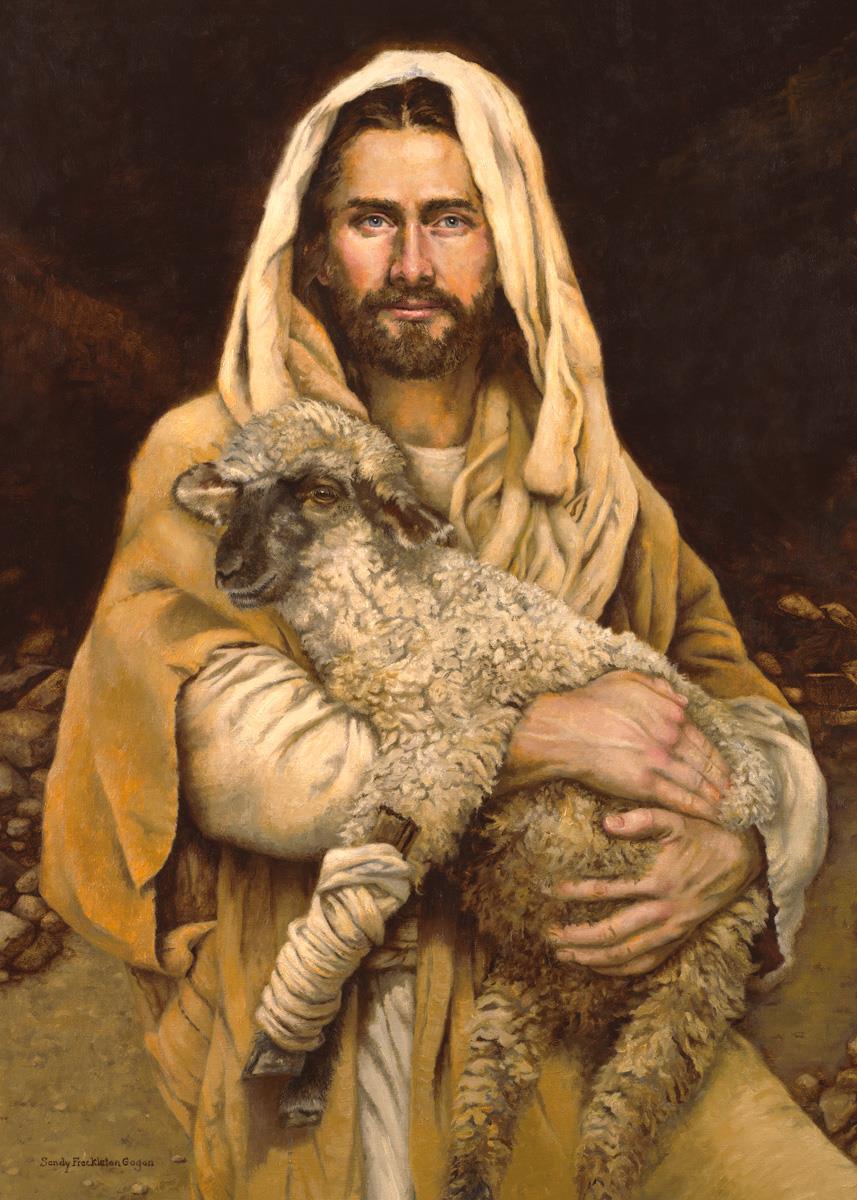 "Bind Up The Broken Hearted" by Sandy Freckleton Gagon is a watercolor painting capturing Jesus tenderly holding a lamb against a backdrop of rocks and a dark brown background.