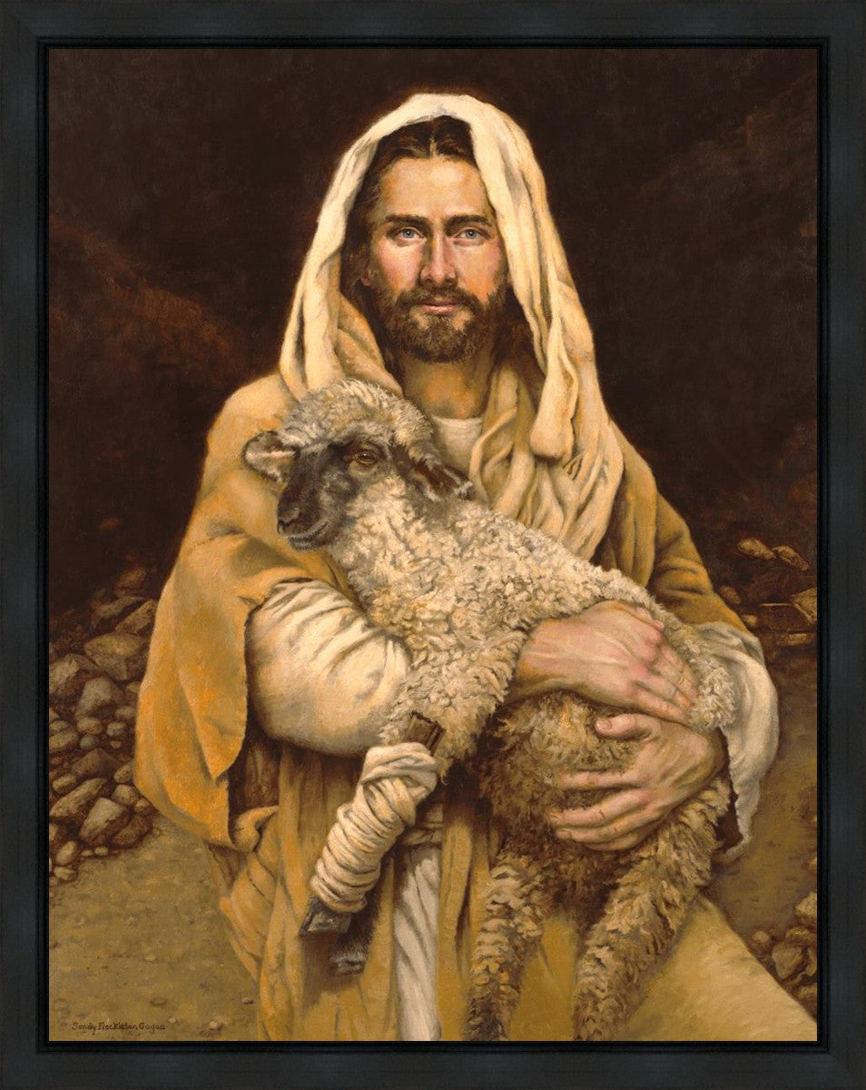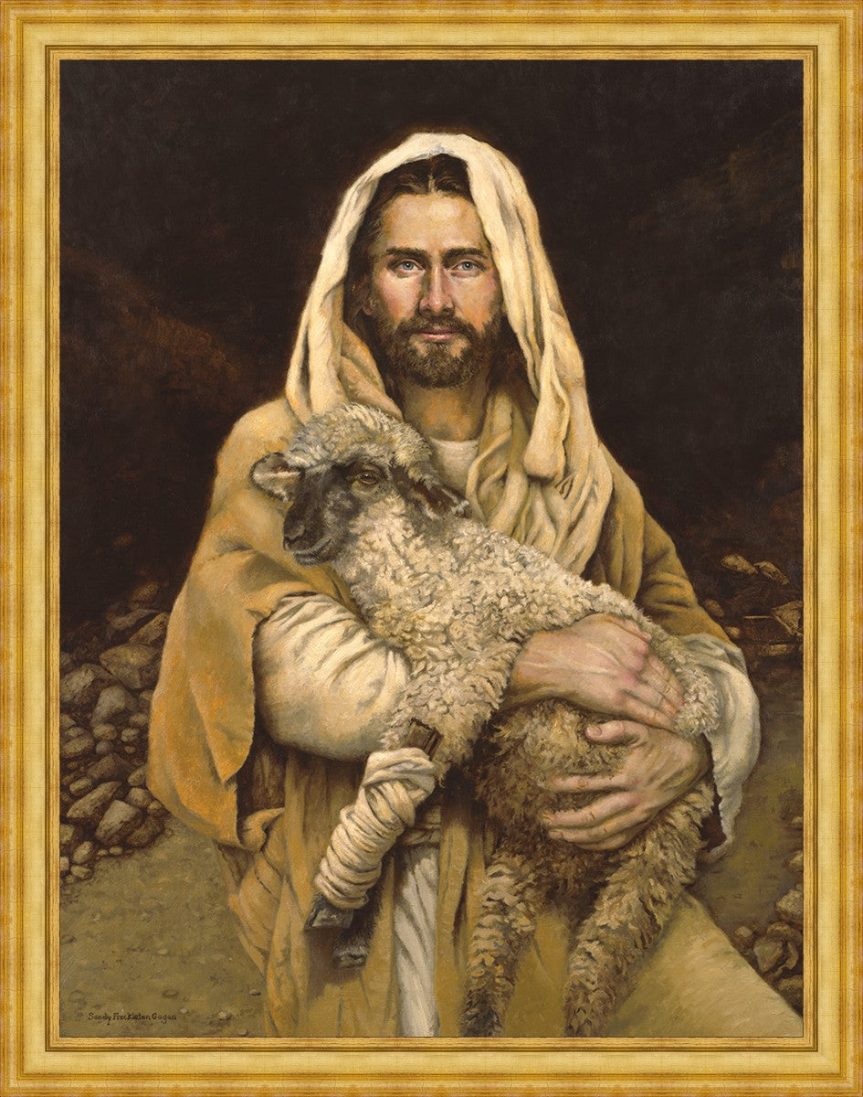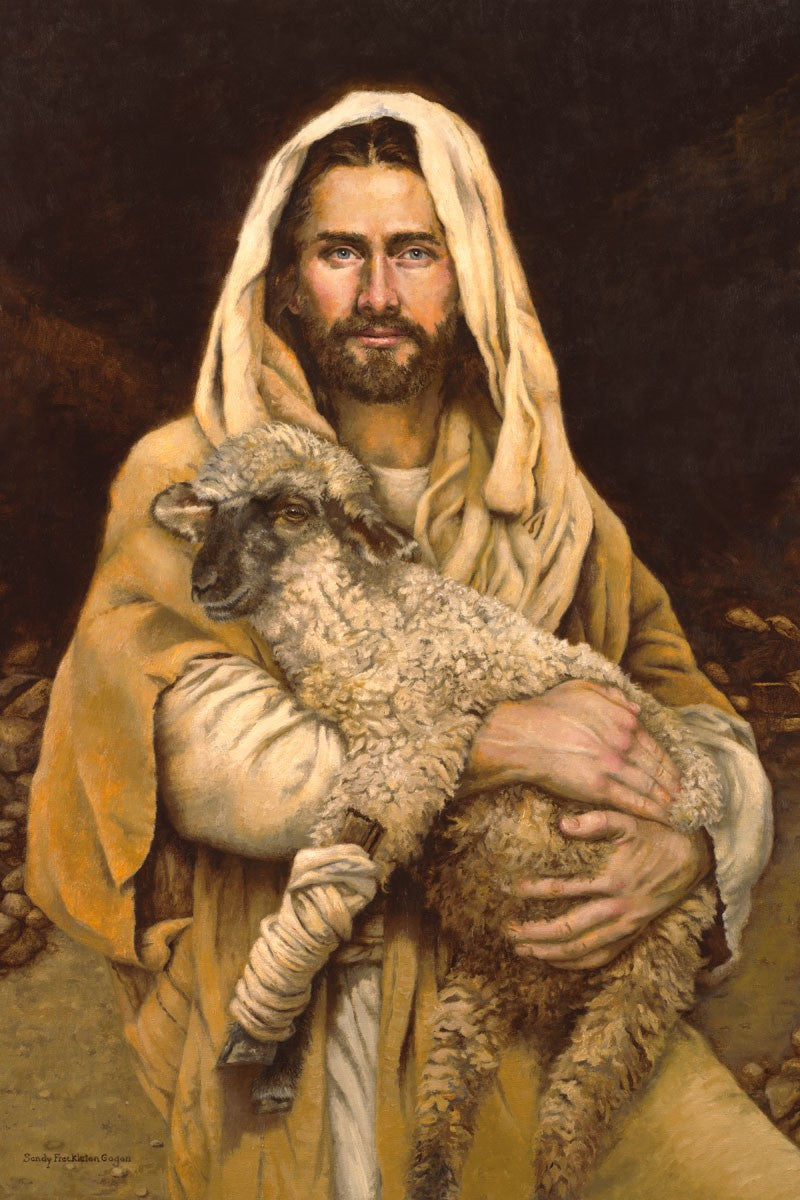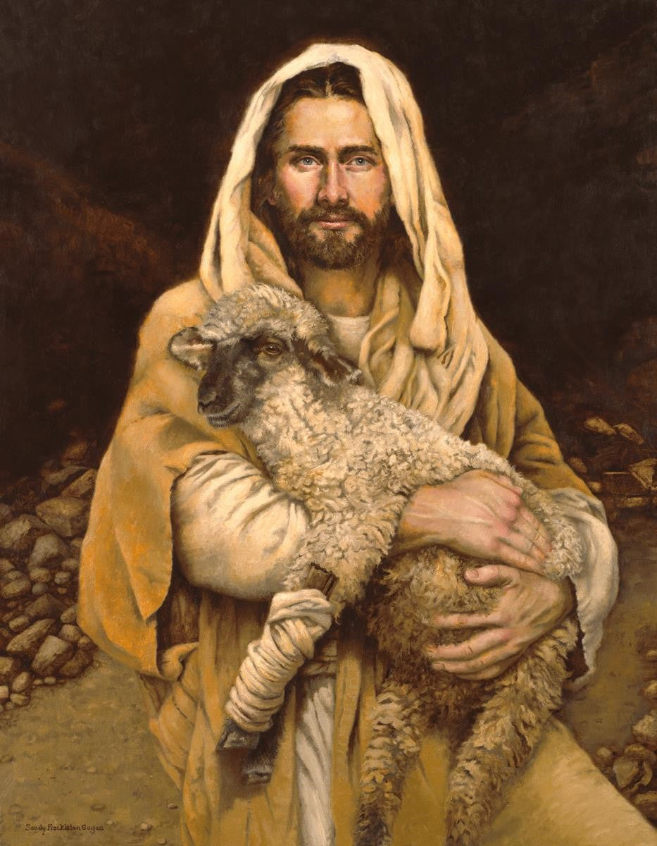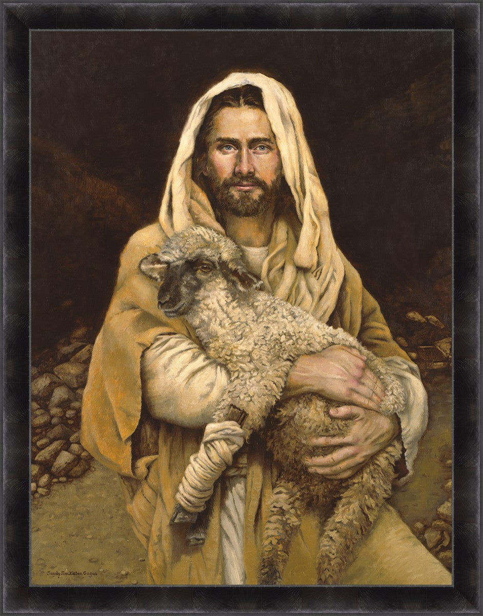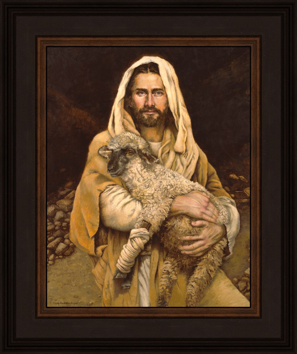 "Bind Up The Broken Hearted" by Sandy Freckleton Gagon is a watercolor painting capturing Jesus tenderly holding a lamb against a backdrop of rocks and a dark brown background.