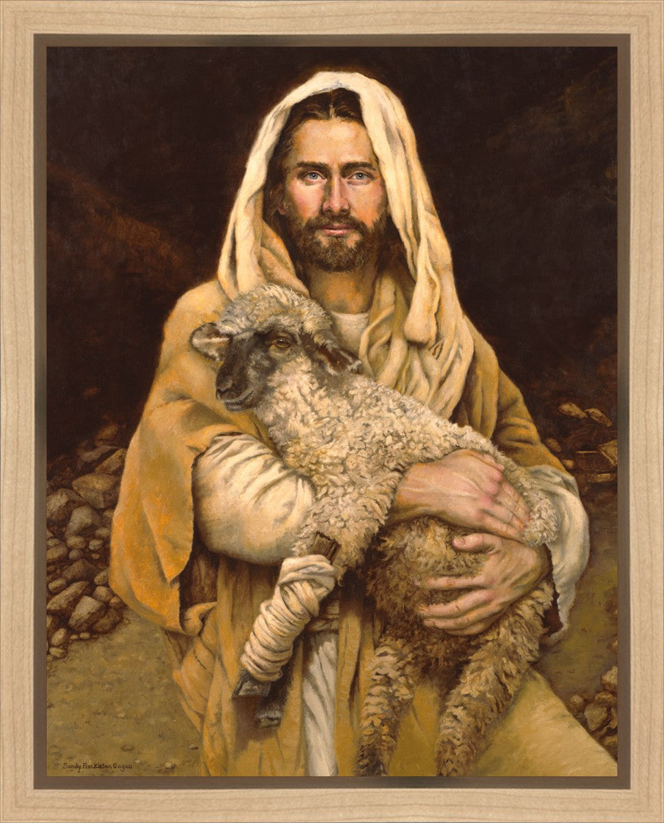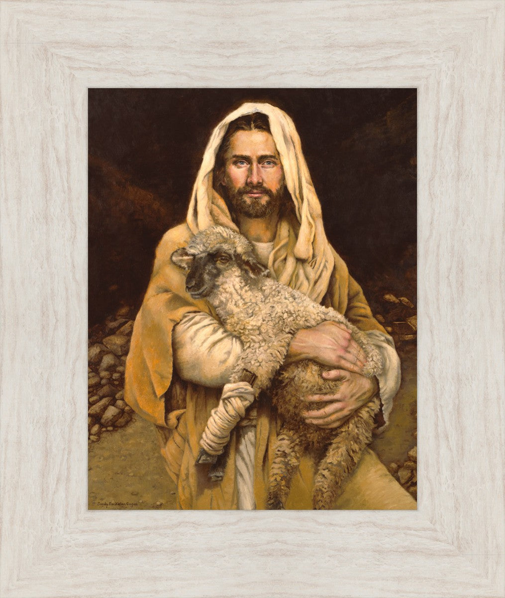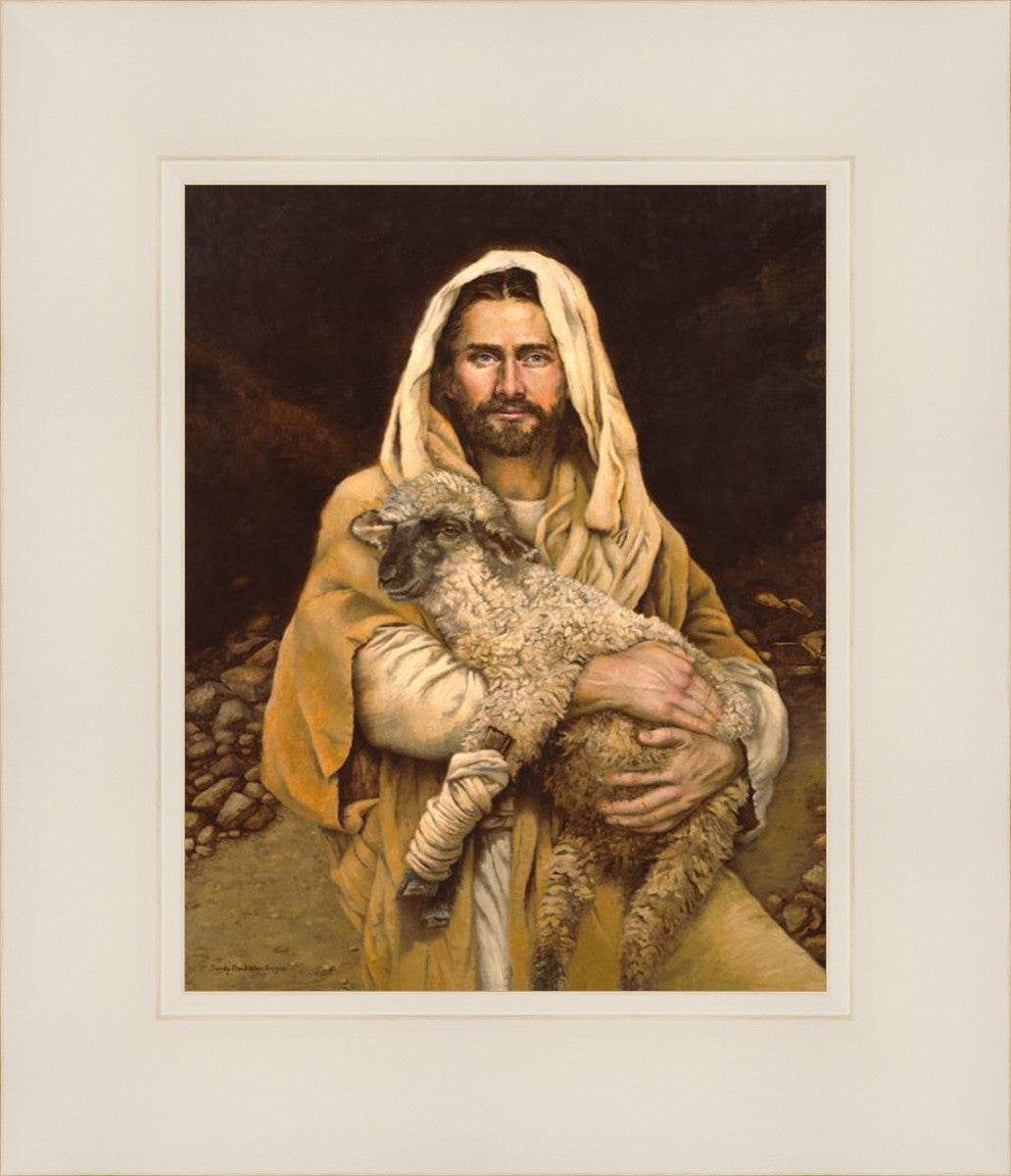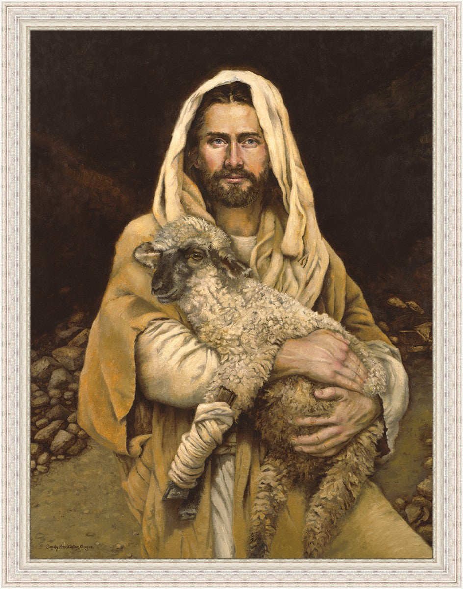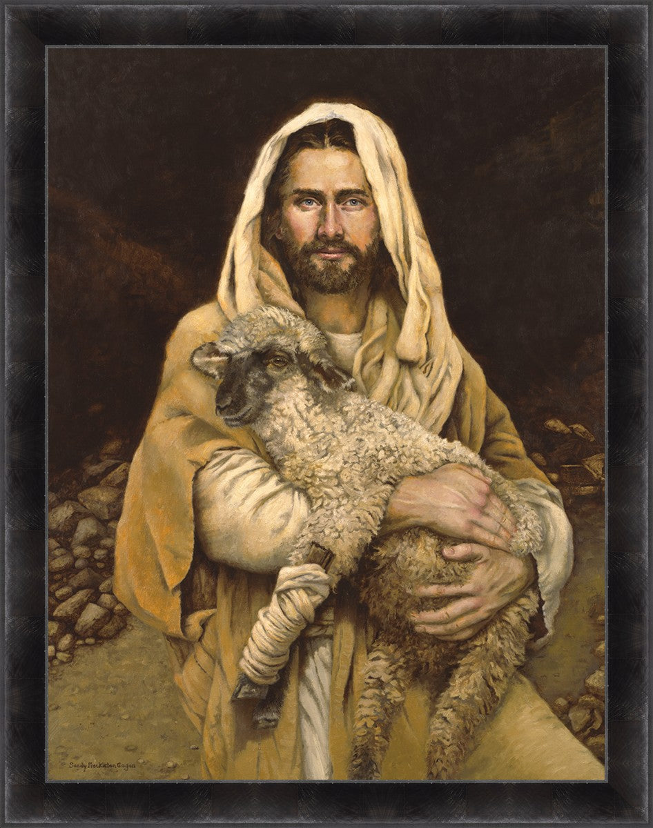 "Bind Up The Broken Hearted" by Sandy Freckleton Gagon is a watercolor painting capturing Jesus tenderly holding a lamb against a backdrop of rocks and a dark brown background.