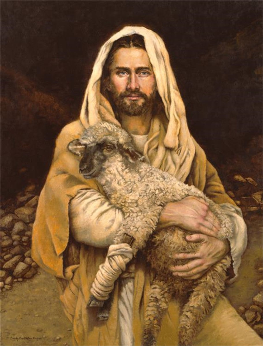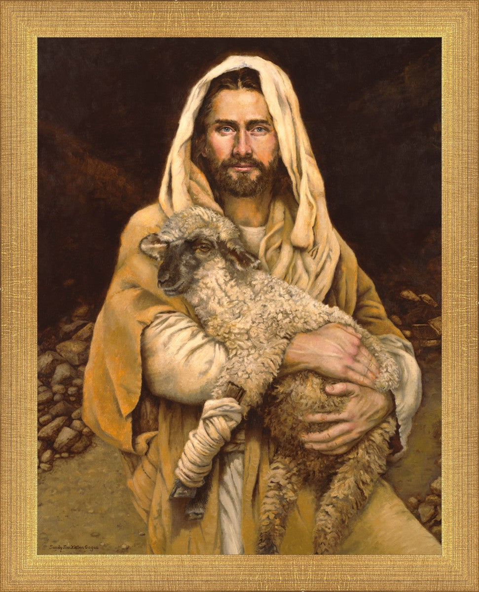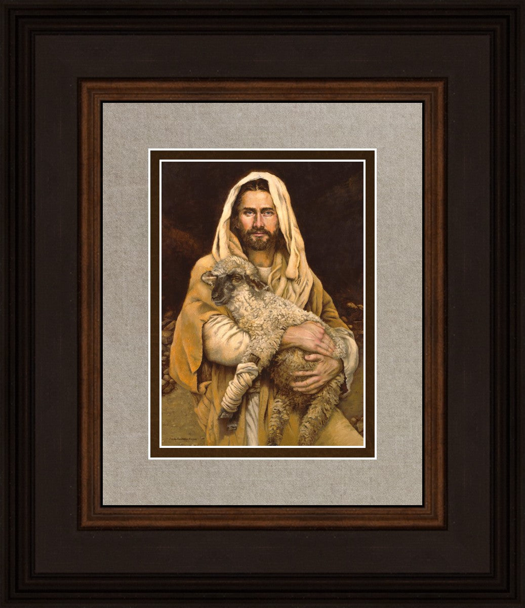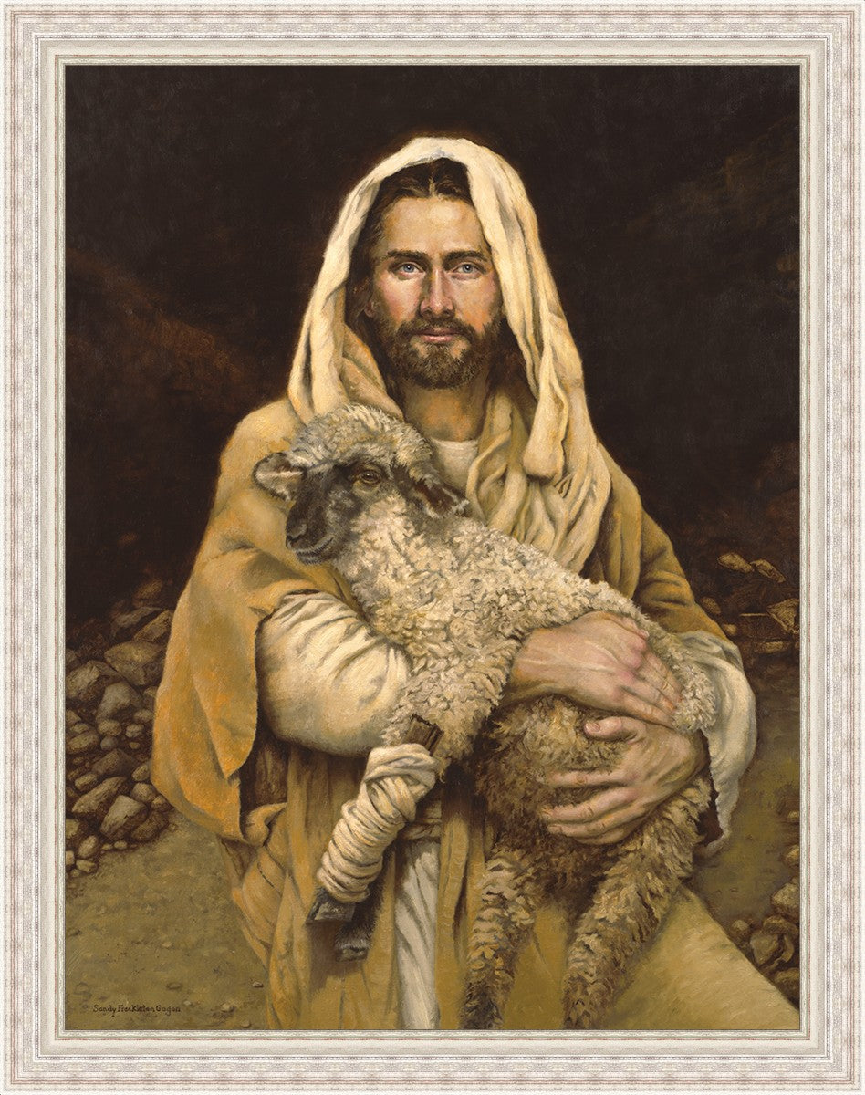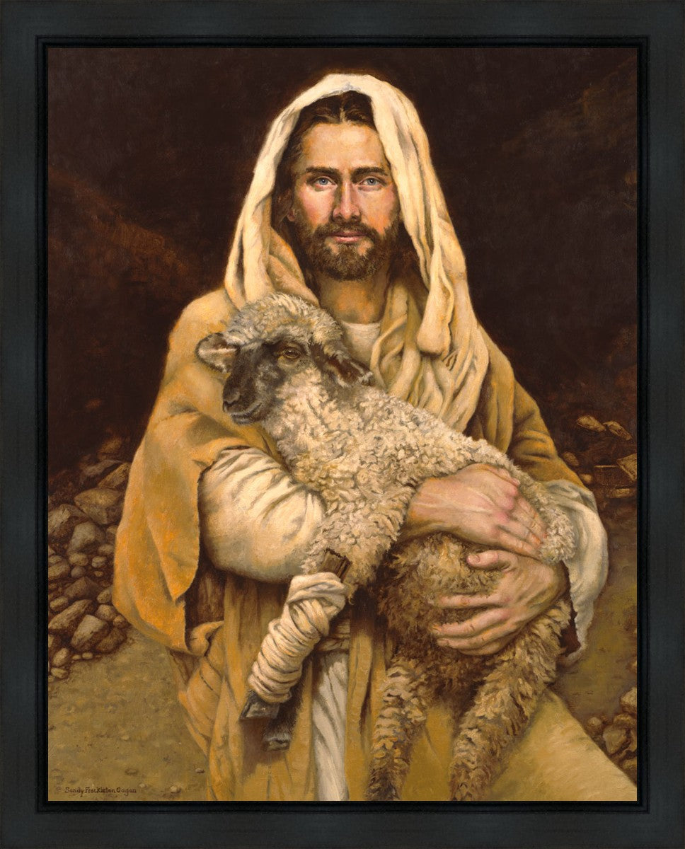 "Bind Up The Broken Hearted" by Sandy Freckleton Gagon is a watercolor painting capturing Jesus tenderly holding a lamb against a backdrop of rocks and a dark brown background.